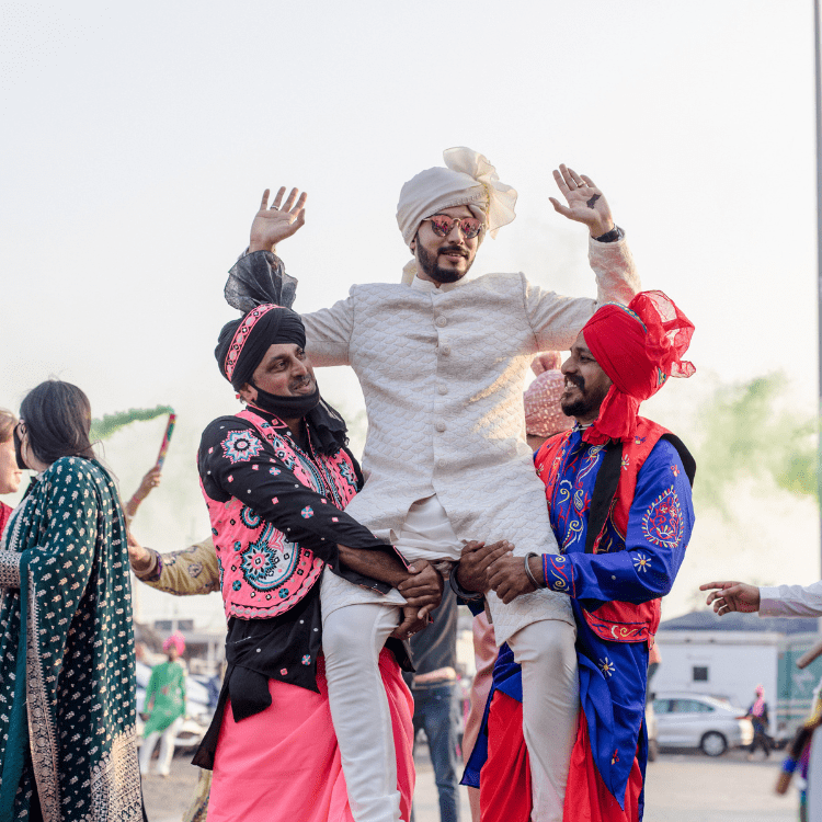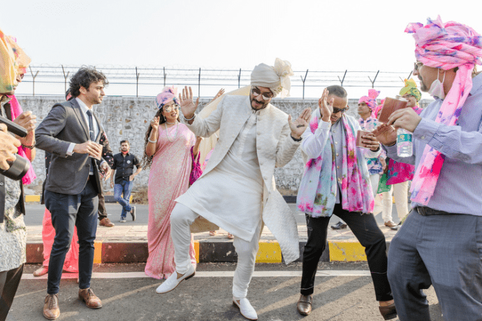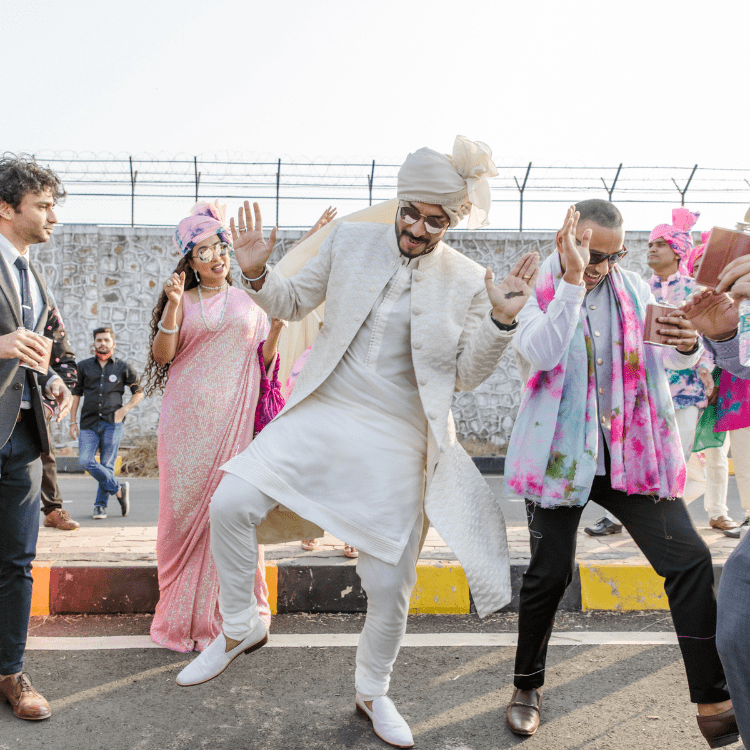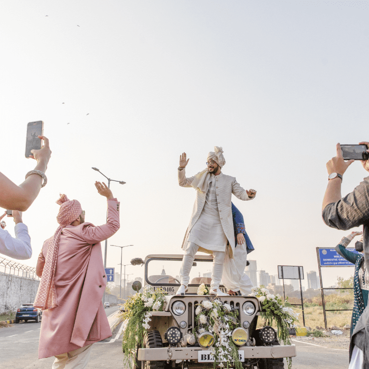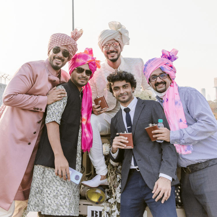 The Baraat started on a high note with the DJ grooving to the tunes of the groom, it was a Rager Baraat with the Baraati's in tye & dye safaas and customised logo flasks with alcohol premixes. It was truly an ode to the Batman Groom and his baraati's.