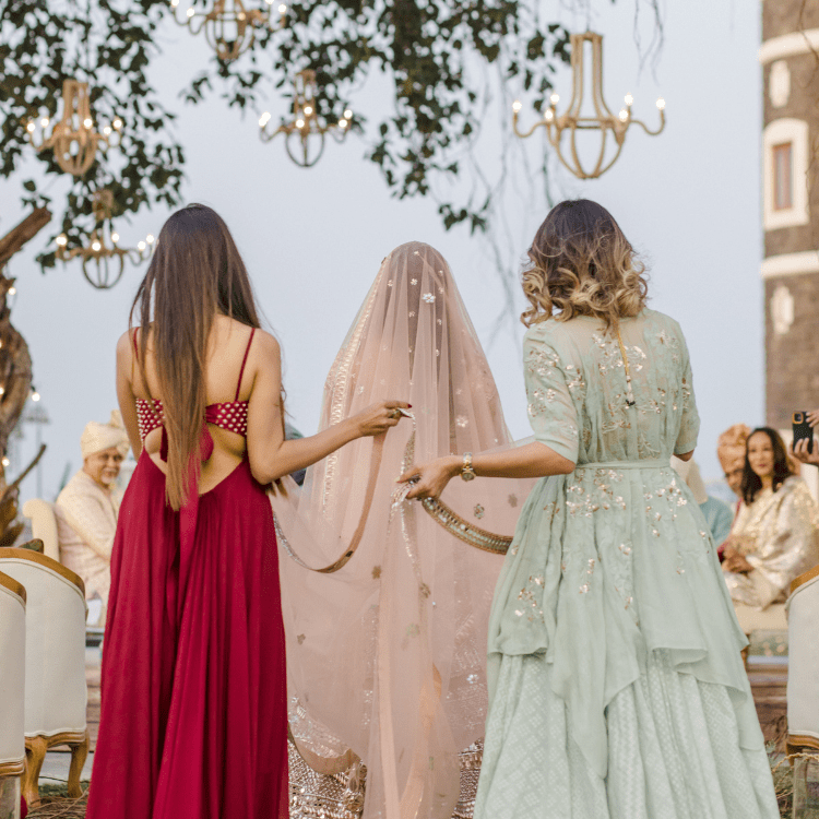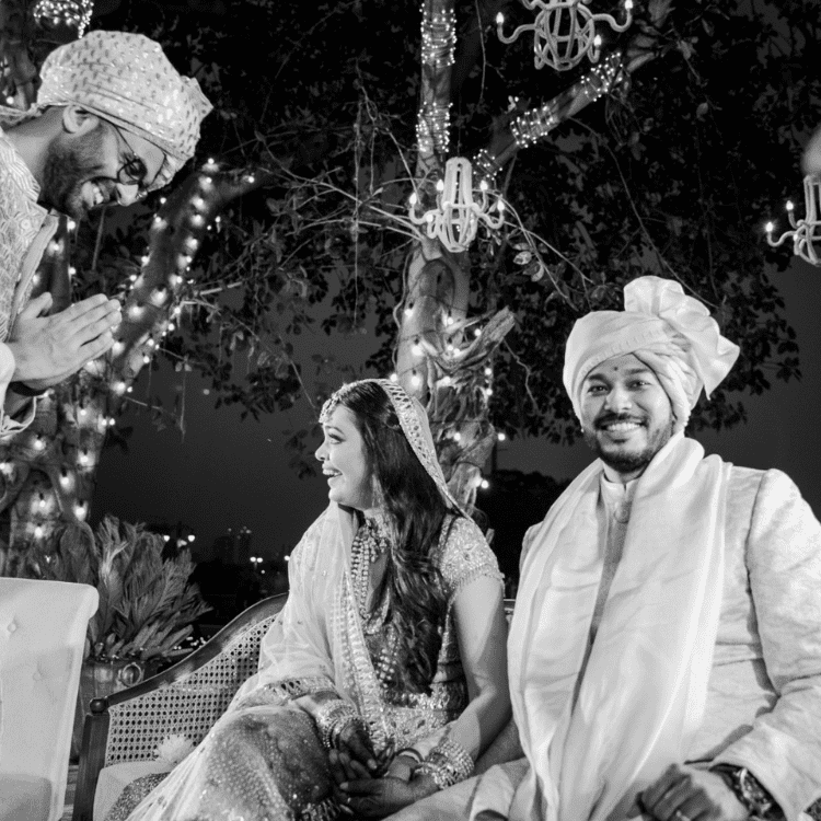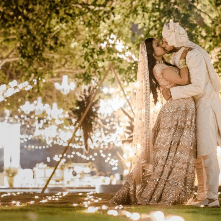 This Wedding was flower less with greens all around the venue, with bells ringing and birds chirping our bride walked into the most beautiful setting to vocals of her fav track " Kho Gaye Hum Kahan " the mandap was extremely unconventional with rustic chandeliers hanging from the banyan tree, under the tree they exchanged their vows and promised each other a forever that had just begun.