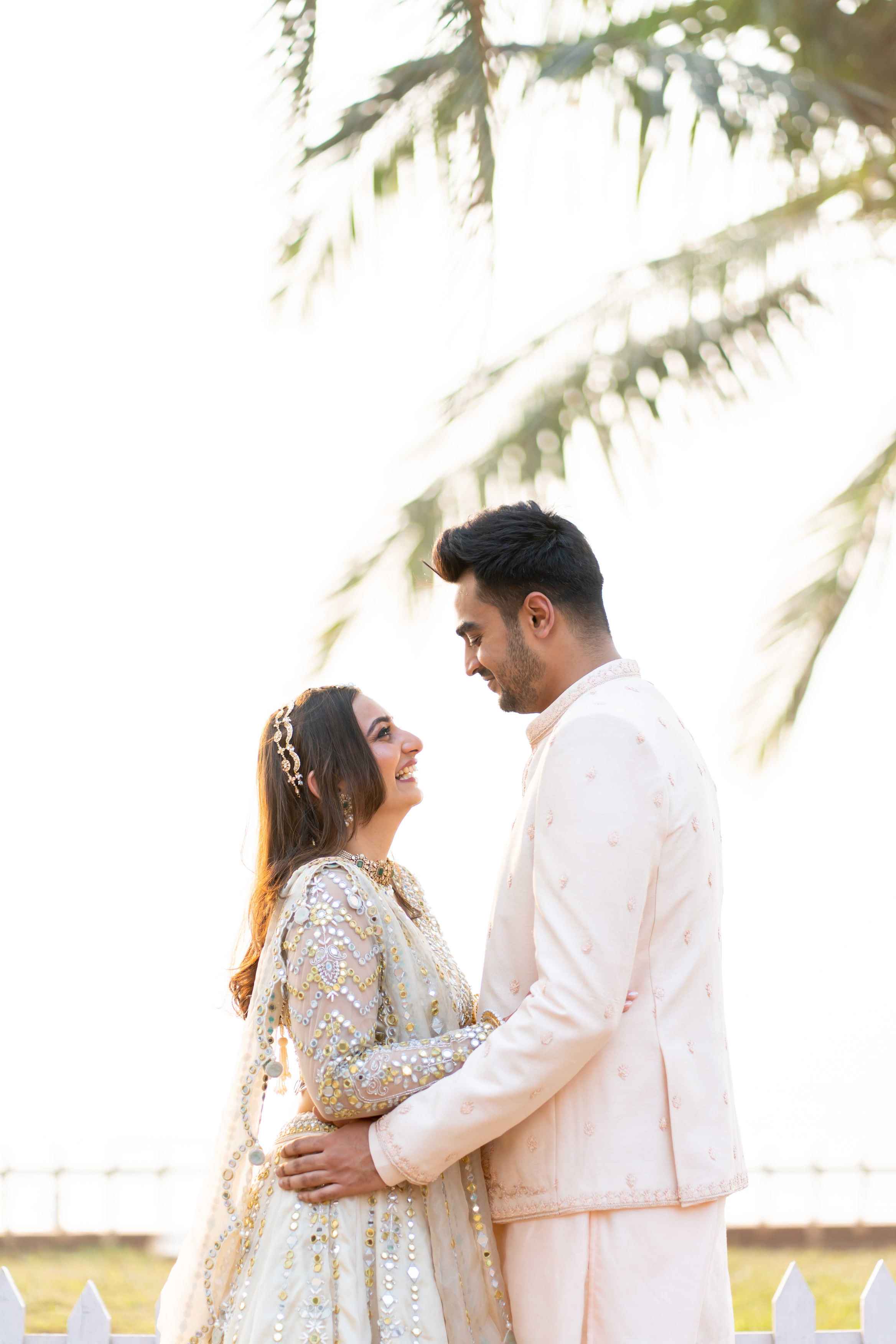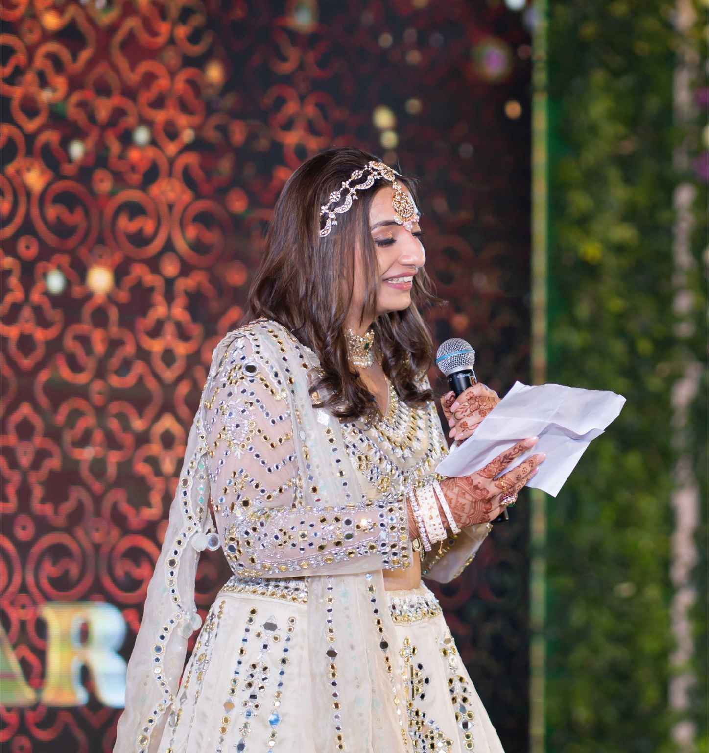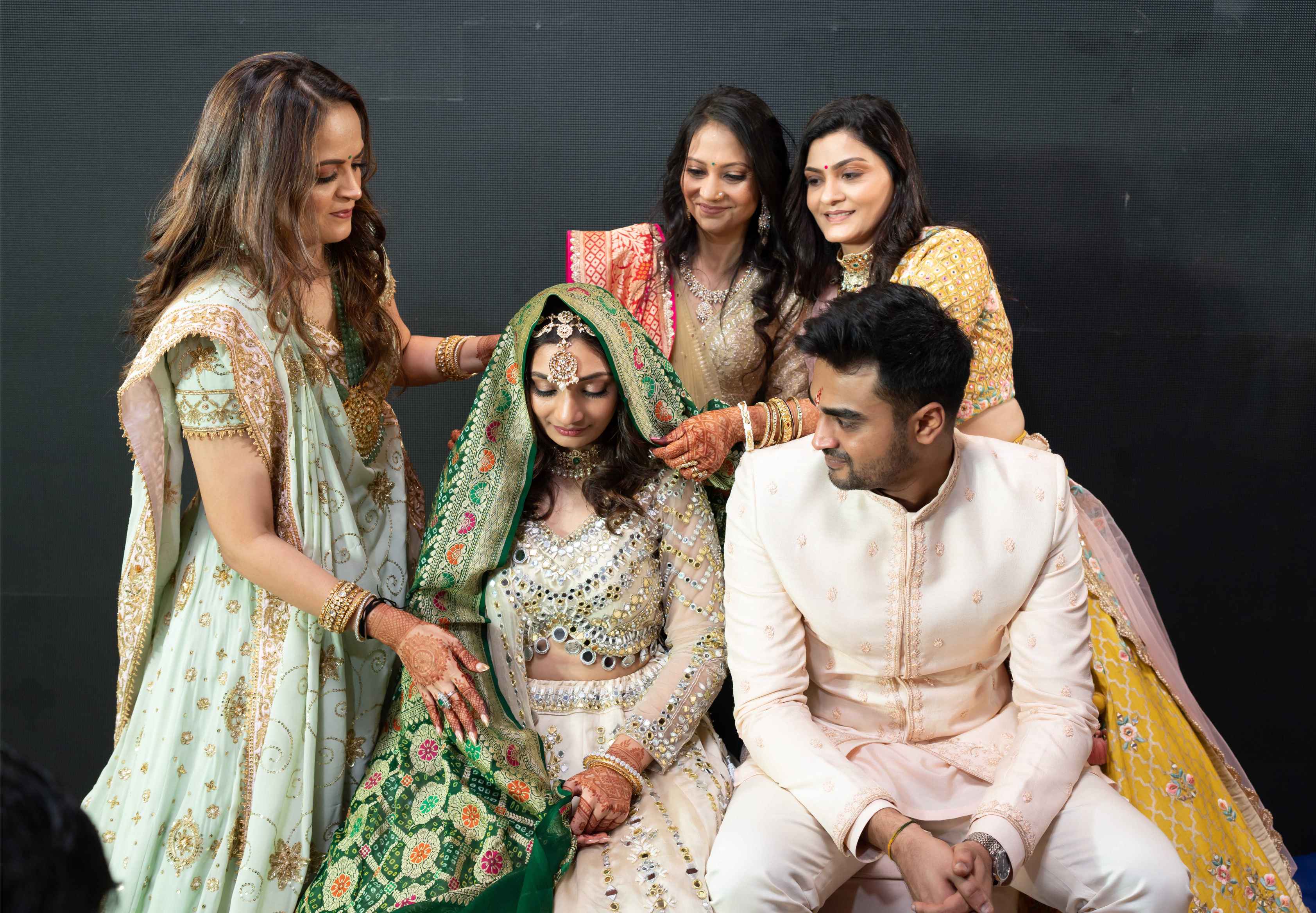 The theme was an enchanted garden where the evening commenced with the couple walking with the bridesmaids and family leading them. The ceremonies kicked off with the families sitting across. The groom's family adorned Jeel with clothes & jewels. Thereafter the family performances commenced and the event was taken over by a live band. The guests were engaged at the exotic garden bar to many other live activities like perfume making and paan mixing. Food was curated to their choice taking center stage was the Ponkh & Kathiyavadi Station. The couple exchanged rings to a flower shower under an open sky followed by portraits with the family. The band was reinstated and the vibe was high which was then taken over by the DJ. A match made in heaven and one that was truly so special.
