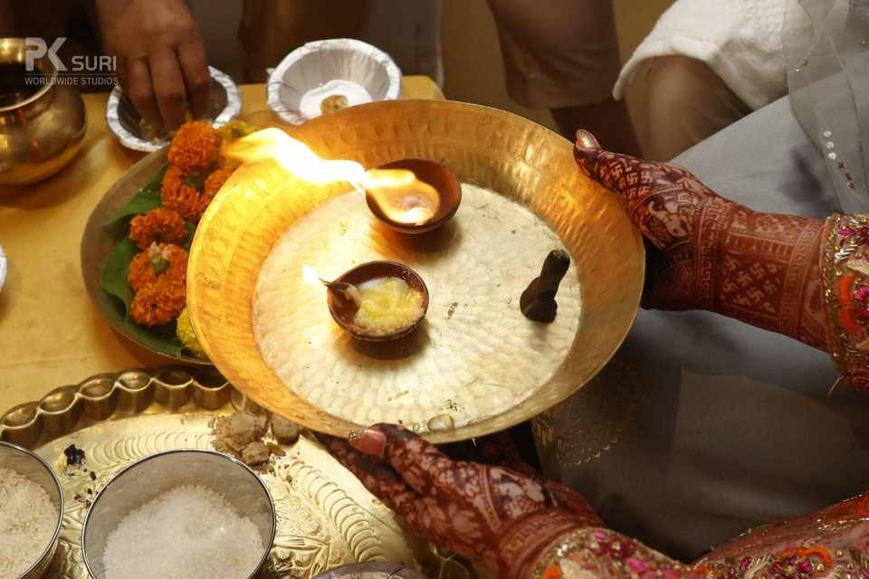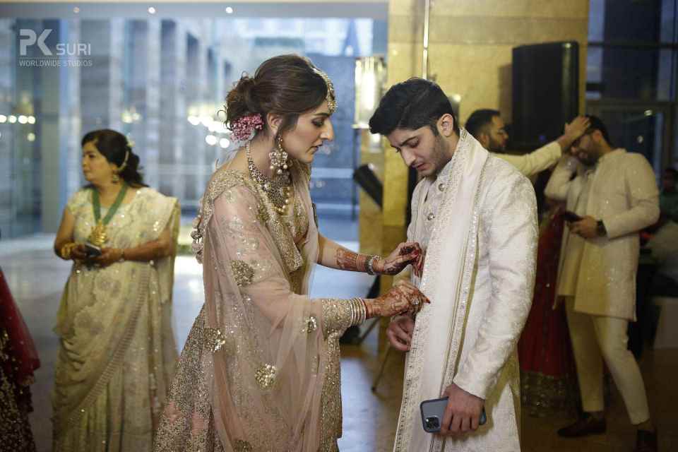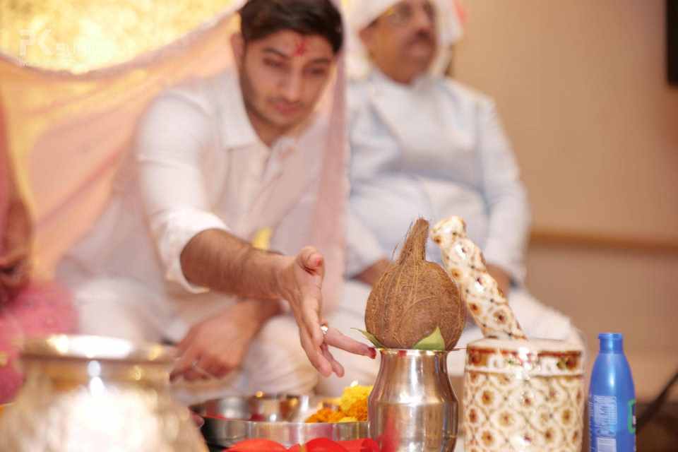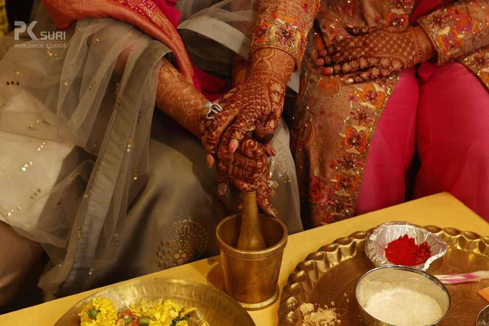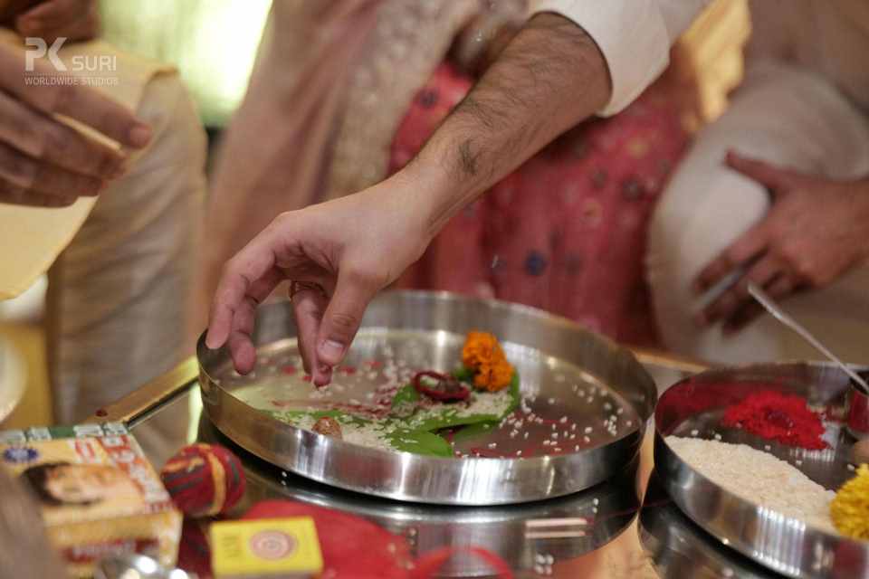 The Ghari Puja of both Mehak & Yash kicked off in simultaneous rooms. The rituals were meticulously executed by the pandit. The groom's friends tore his clothes and drenched him in water. These moments are the ones that stay with us.