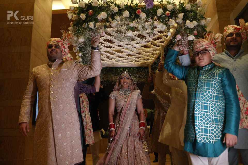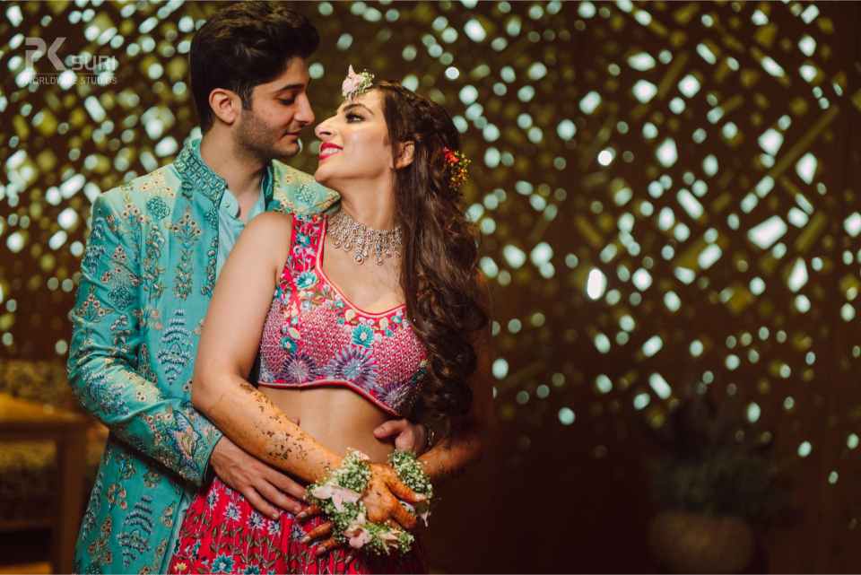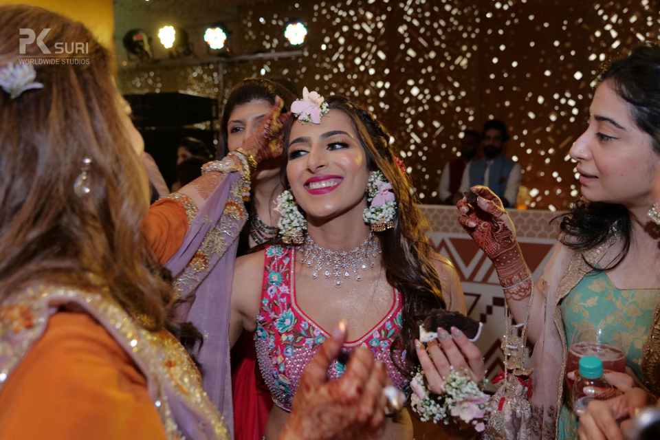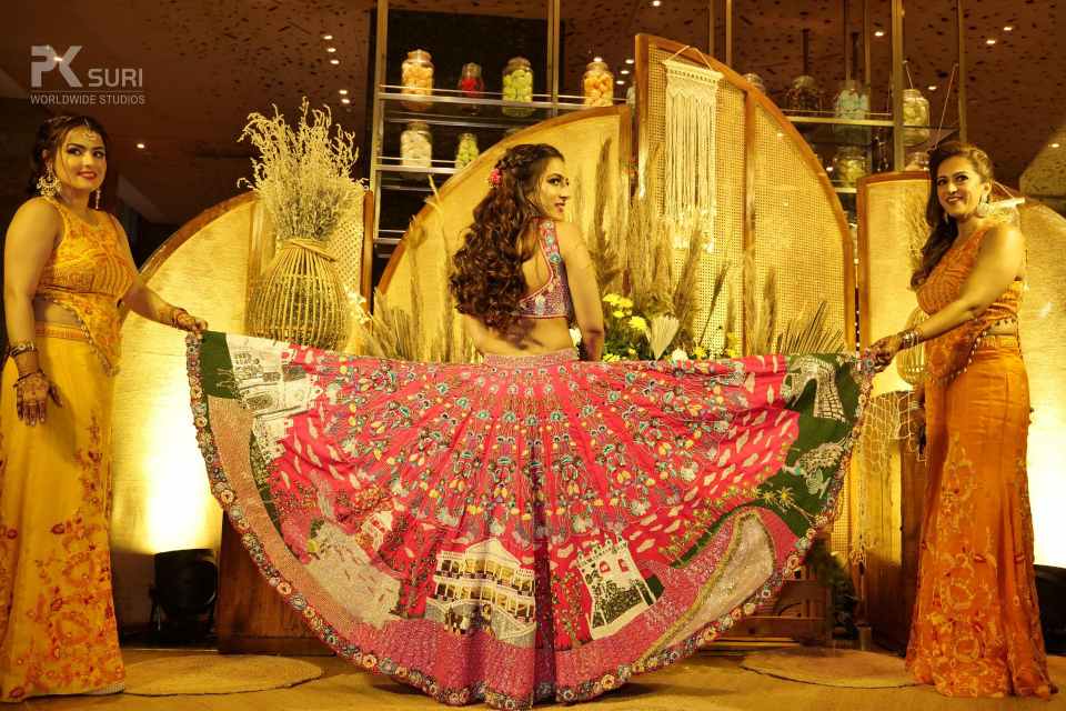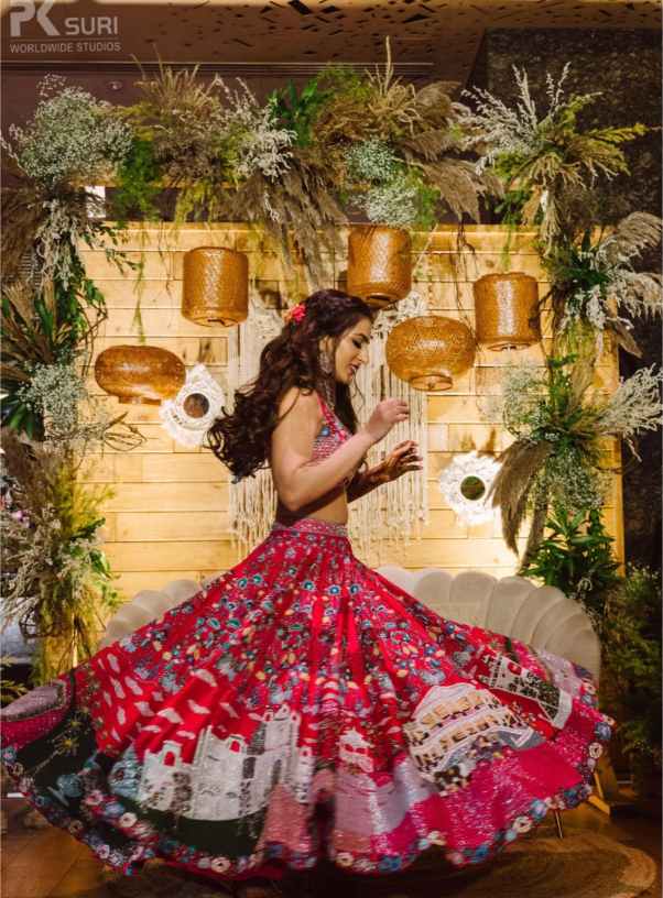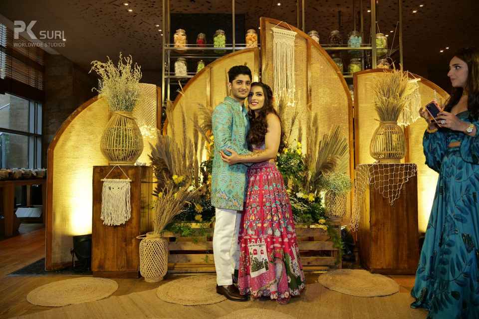 The Boho-themed mehendi was a colorful affair. The bride had created a love story Lehenga for herself that depicted the entire storyline of her proposal and courtship. The couple captured beautiful portraits in the sunlit courtyard. The groom entered to Dhol beats with his family and while the bride walked hand in hand with her parents. The afternoon kicked off with a face-off to dhol beats. The family kicked off the mehendi celebrations and were then taken over by the floral adornment ceremony followed by a dhol-themed cake cutting. DJ Maddock with Dhol walas took over to make sure that the crowd swooned to his Bollywood Beats.