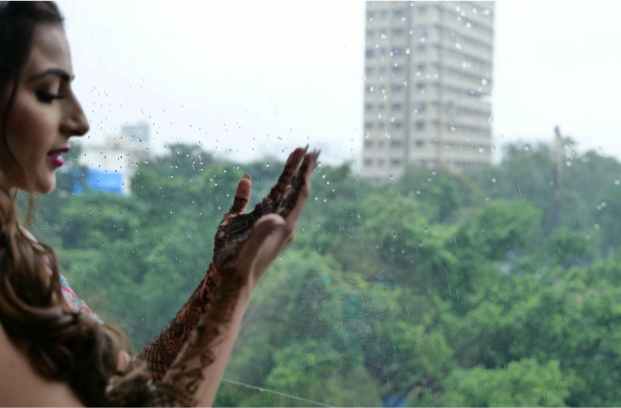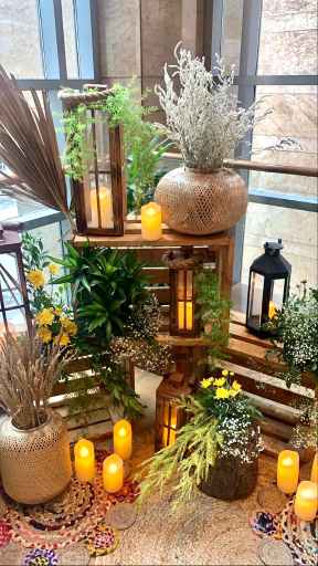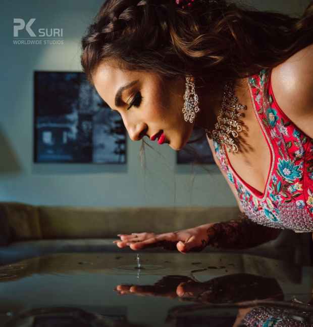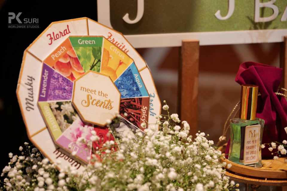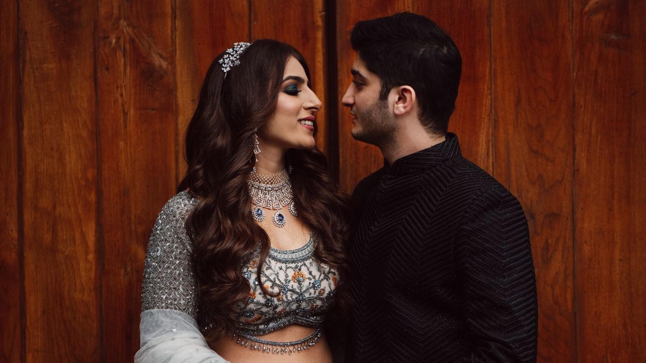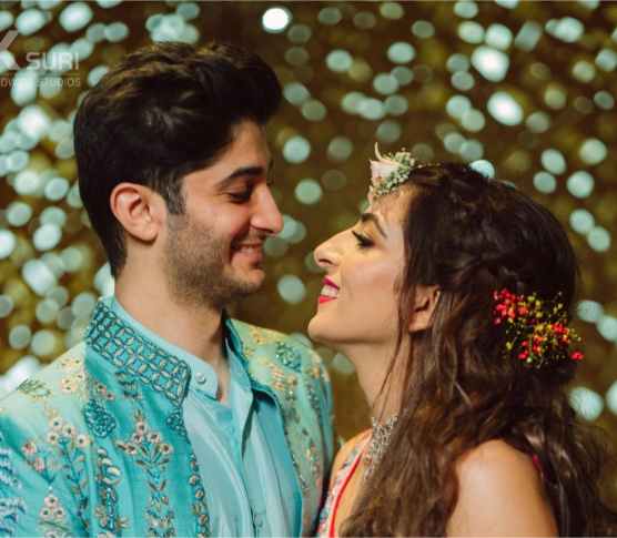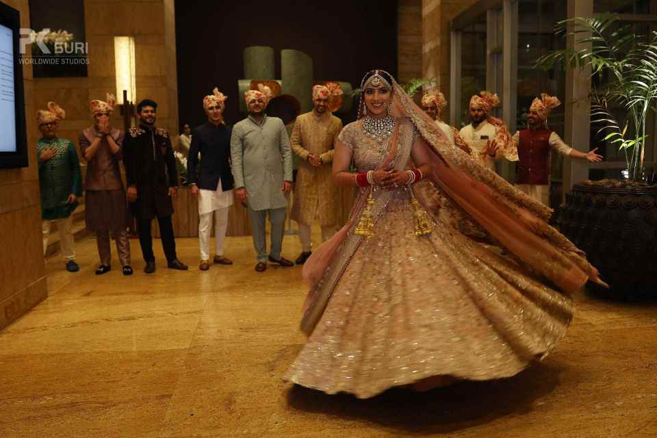 The Boho-themed mehendi was a colorful affair. The bride had created a love story Lehenga for herself that depicted the entire storyline of her proposal and courtship. The couple captured beautiful portraits in the sunlit courtyard. The groom entered to Dhol beats with his family and while the bride walked hand in hand with her parents. The afternoon kicked off with a face-off to dhol beats. The family kicked off the mehendi celebrations and were then taken over by the floral adornment ceremony followed by a dhol-themed cake cutting. DJ Maddock with Dhol walas took over to make sure that the crowd swooned to his Bollywood Beats.