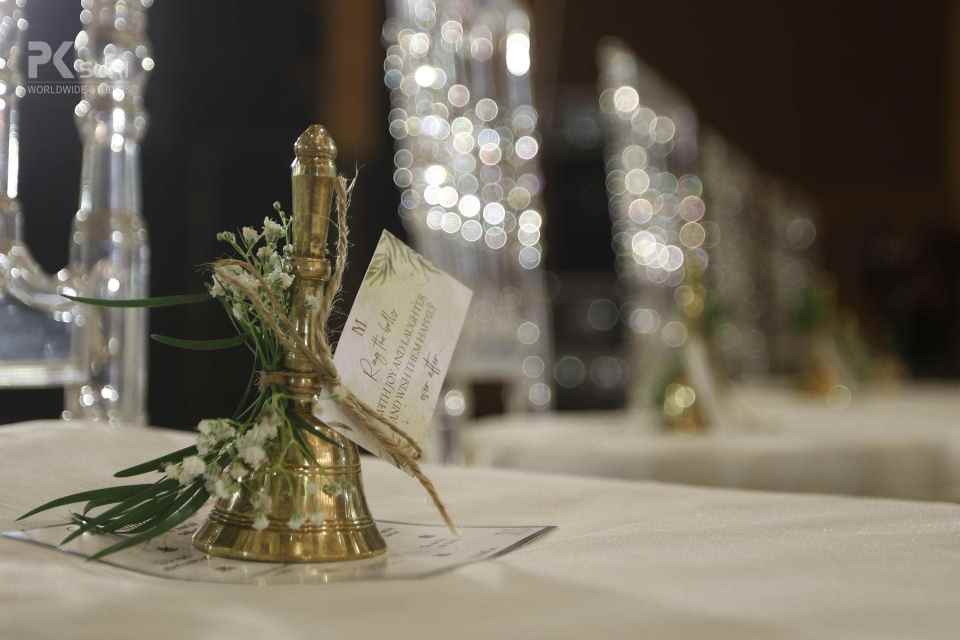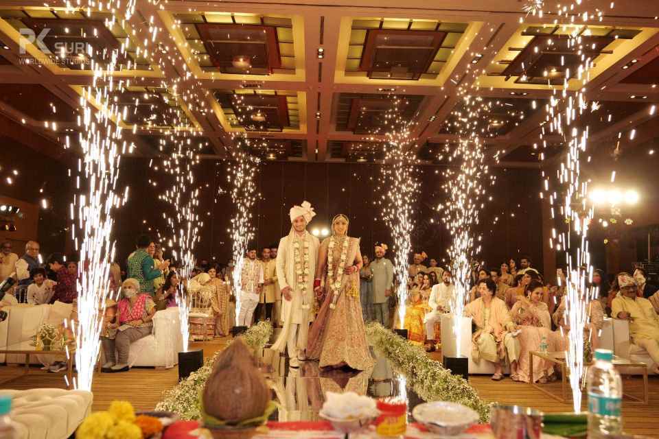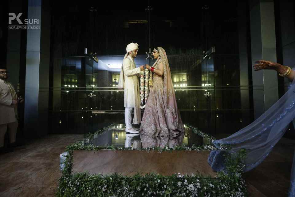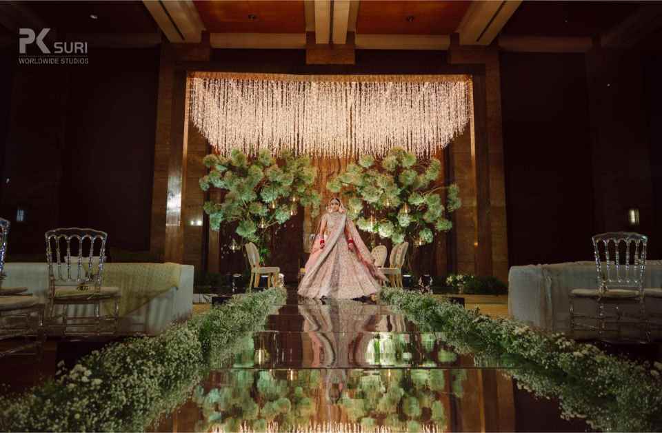 The Groom after a banger Baraat and his groomsmen were welcomed to the venue. The groom waited on the podium while the bride walked down the stairs to vocals by the groom's sister. They exchanged garlands and were showered with a gazillion rose petals. As the theme suggests everything was elegant and minimalistic. The space was filled with baby’s breath and greens to adorn the place with fairy lights all over. The ceremonies started off and the space looked magical. The ceremonies were completed and the couple walked down to sparklers going off followed by the bride's vidaai. An emotional moment but towards a future that was bright and beautiful for both. A story for keeps.