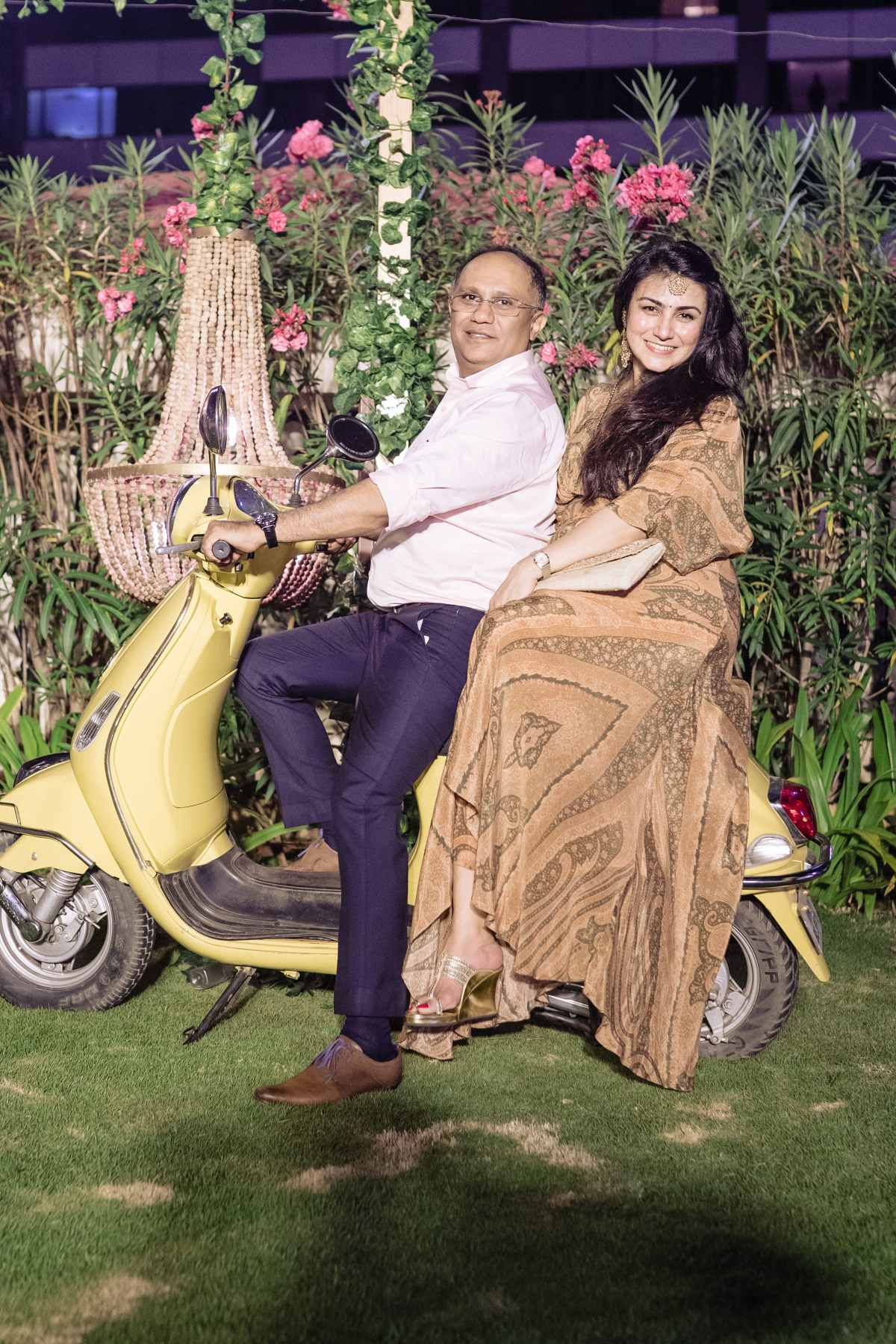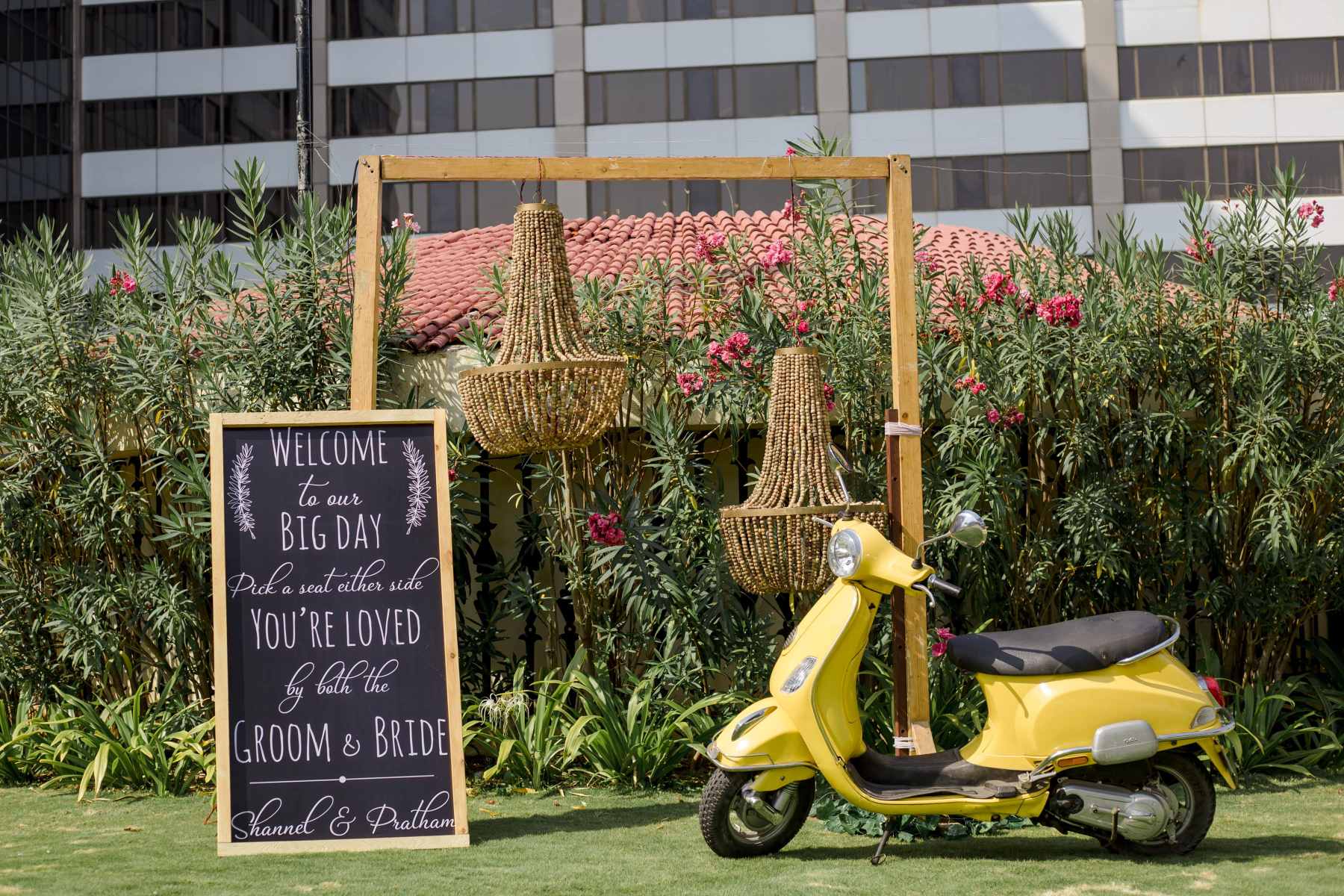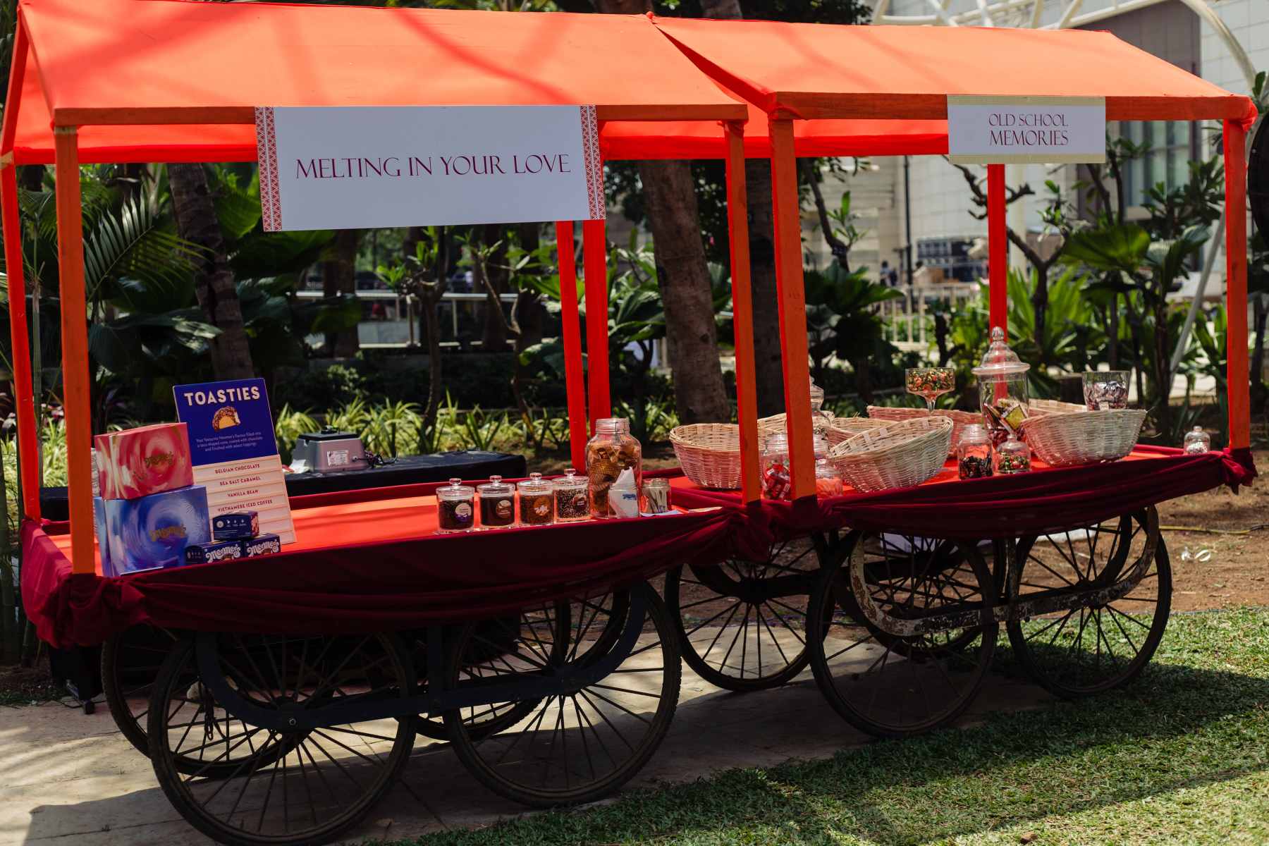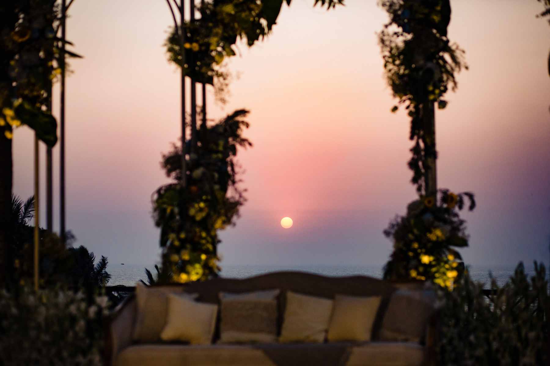 Set against the scenic backdrop of the lawns of Taj Lands End with the sun going down this Tuscan Affair was filled with small pretty details and loads of punk and drama. The friends welcomed the couple to the venue with tambourines and lit balloons and the performances took center stage. Curated cocktails & food got the night started with loads of activities for the guests ranging from an Evil Eye Bar, Toss the Coin to Coffee Residue Reader. A setting where all guests clicked pictures with the Vespa was endearing. We had dancers who performed the Tuscan Tarantella Dance and got the guests grooving, the band was phenomenal and the guests enjoyed it thoroughly. The favours were beautifully packed herbs in test tubes as takeaways. An evening that got the festivities kickstarted.