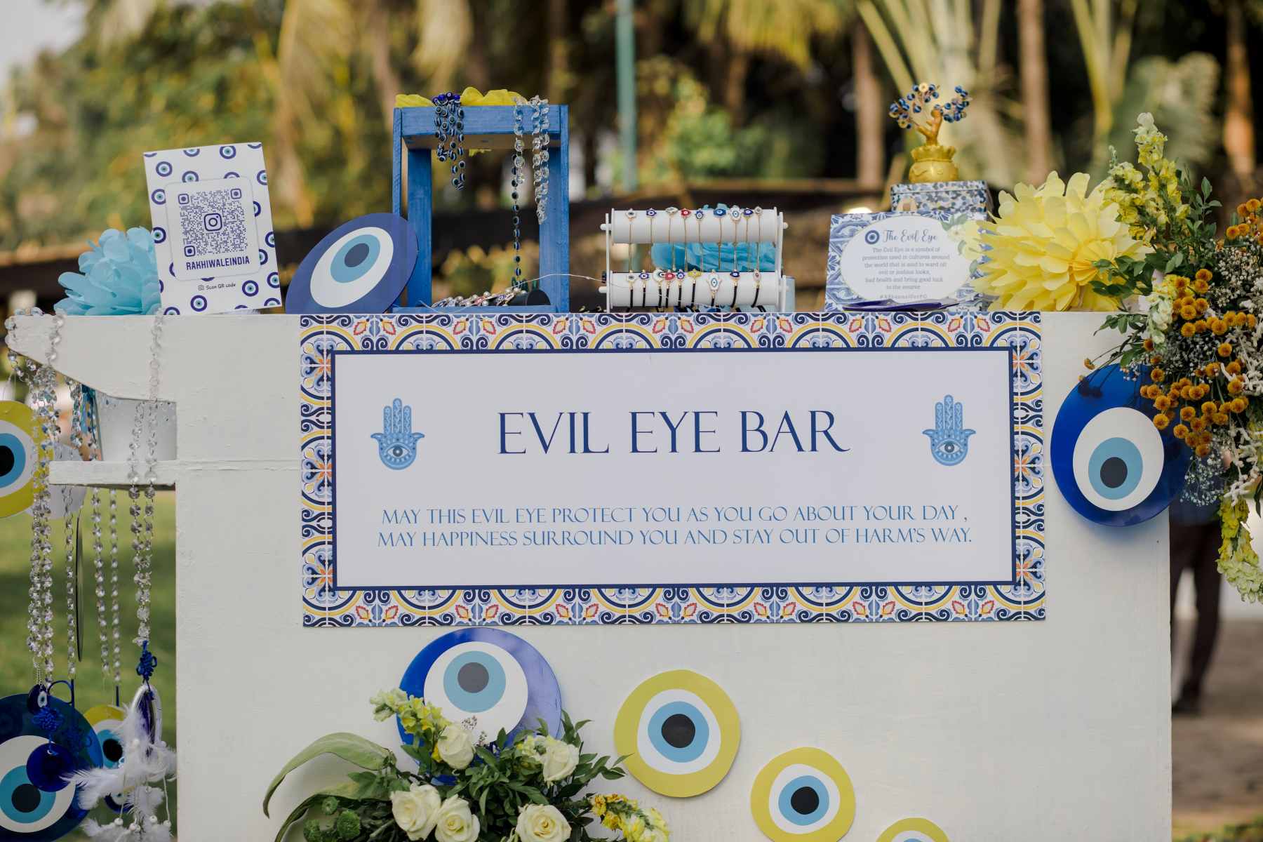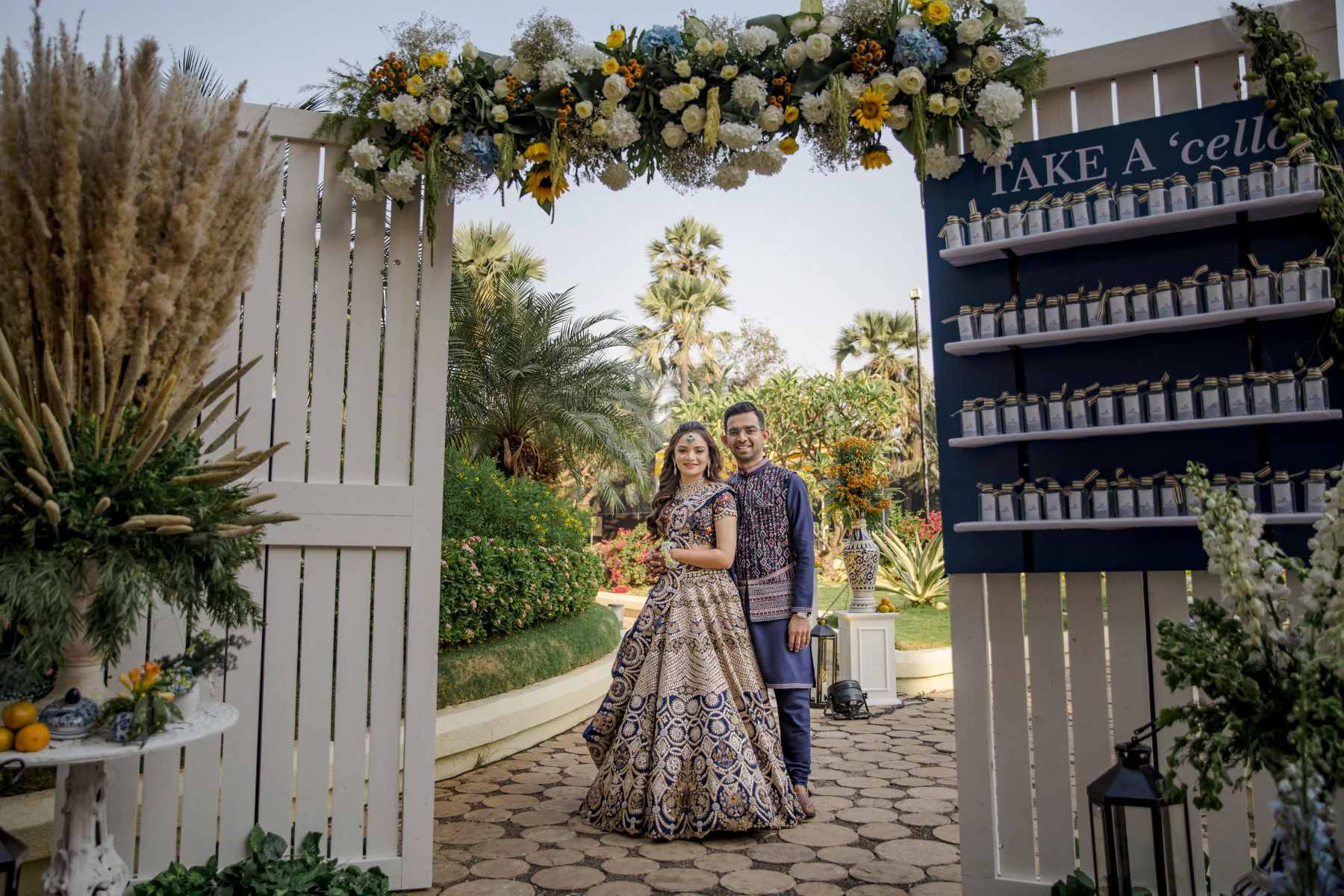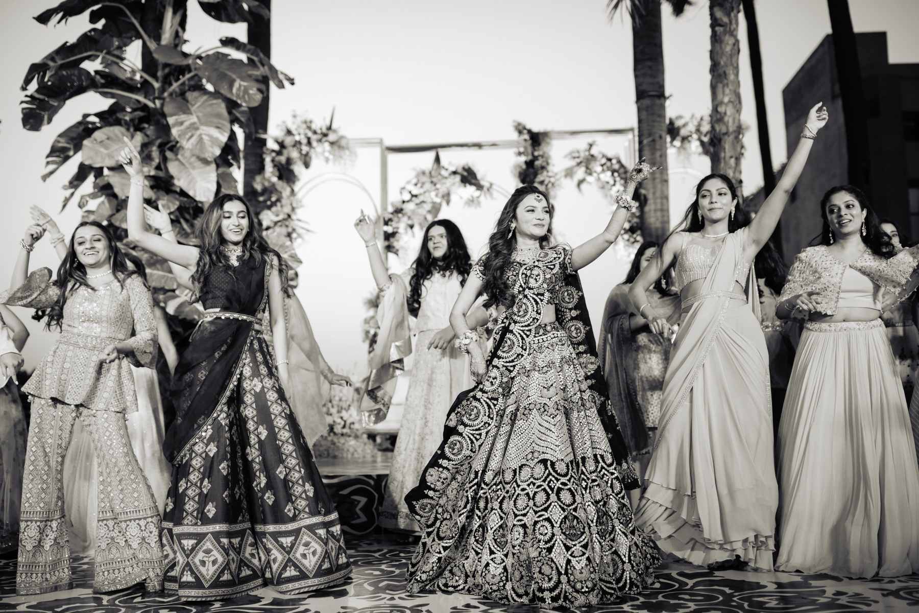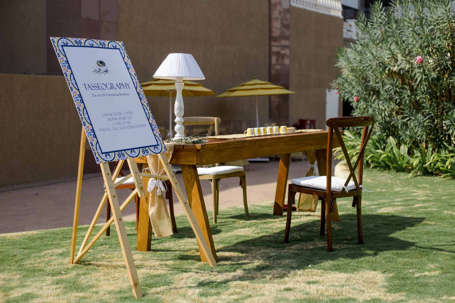 Set against the scenic backdrop of the lawns of Taj Lands End with the sun going down this Tuscan Affair was filled with small pretty details and loads of punk and drama. The friends welcomed the couple to the venue with tambourines and lit balloons and the performances took center stage. Curated cocktails & food got the night started with loads of activities for the guests ranging from an Evil Eye Bar, Toss the Coin to Coffee Residue Reader. A setting where all guests clicked pictures with the Vespa was endearing. We had dancers who performed the Tuscan Tarantella Dance and got the guests grooving, the band was phenomenal and the guests enjoyed it thoroughly. The favours were beautifully packed herbs in test tubes as takeaways. An evening that got the festivities kickstarted.