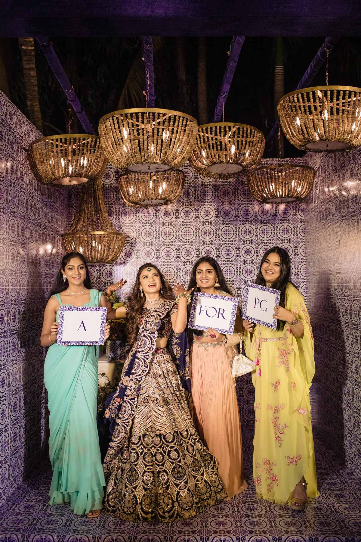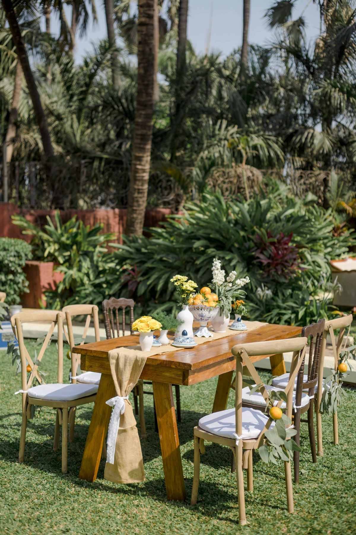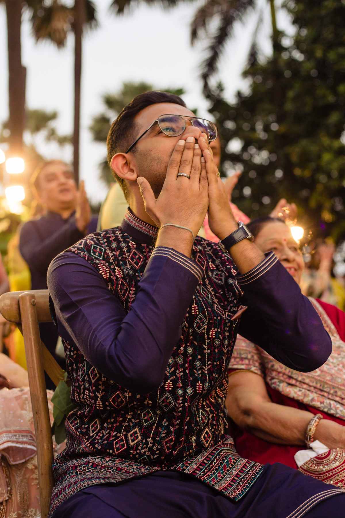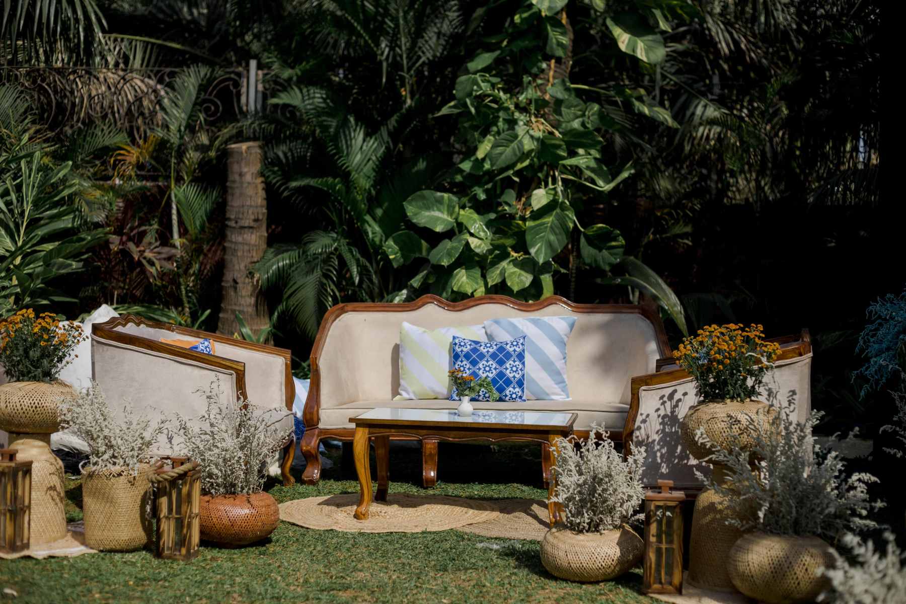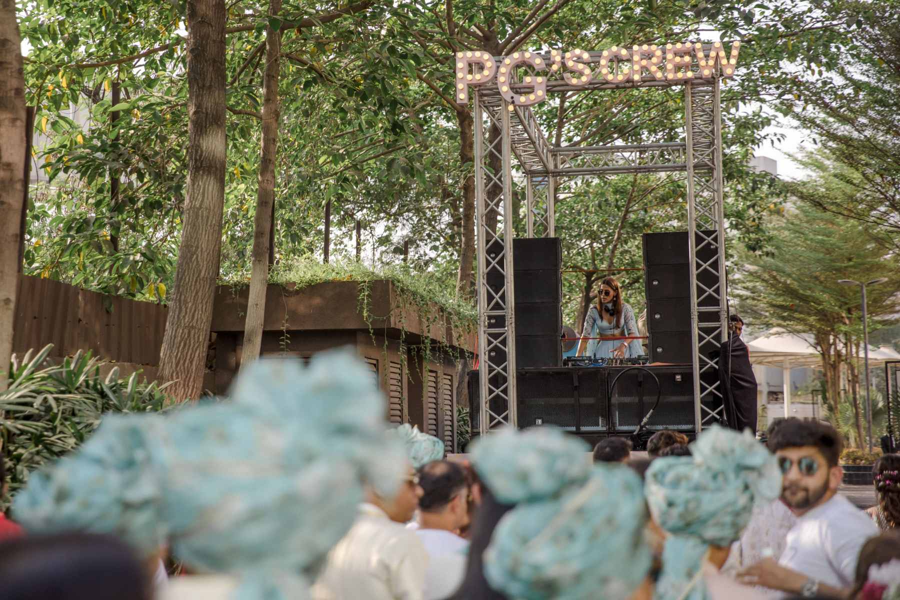 Set against the scenic backdrop of the lawns of Taj Lands End with the sun going down this Tuscan Affair was filled with small pretty details and loads of punk and drama. The friends welcomed the couple to the venue with tambourines and lit balloons and the performances took center stage. Curated cocktails & food got the night started with loads of activities for the guests ranging from an Evil Eye Bar, Toss the Coin to Coffee Residue Reader. A setting where all guests clicked pictures with the Vespa was endearing. We had dancers who performed the Tuscan Tarantella Dance and got the guests grooving, the band was phenomenal and the guests enjoyed it thoroughly. The favours were beautifully packed herbs in test tubes as takeaways. An evening that got the festivities kickstarted.
