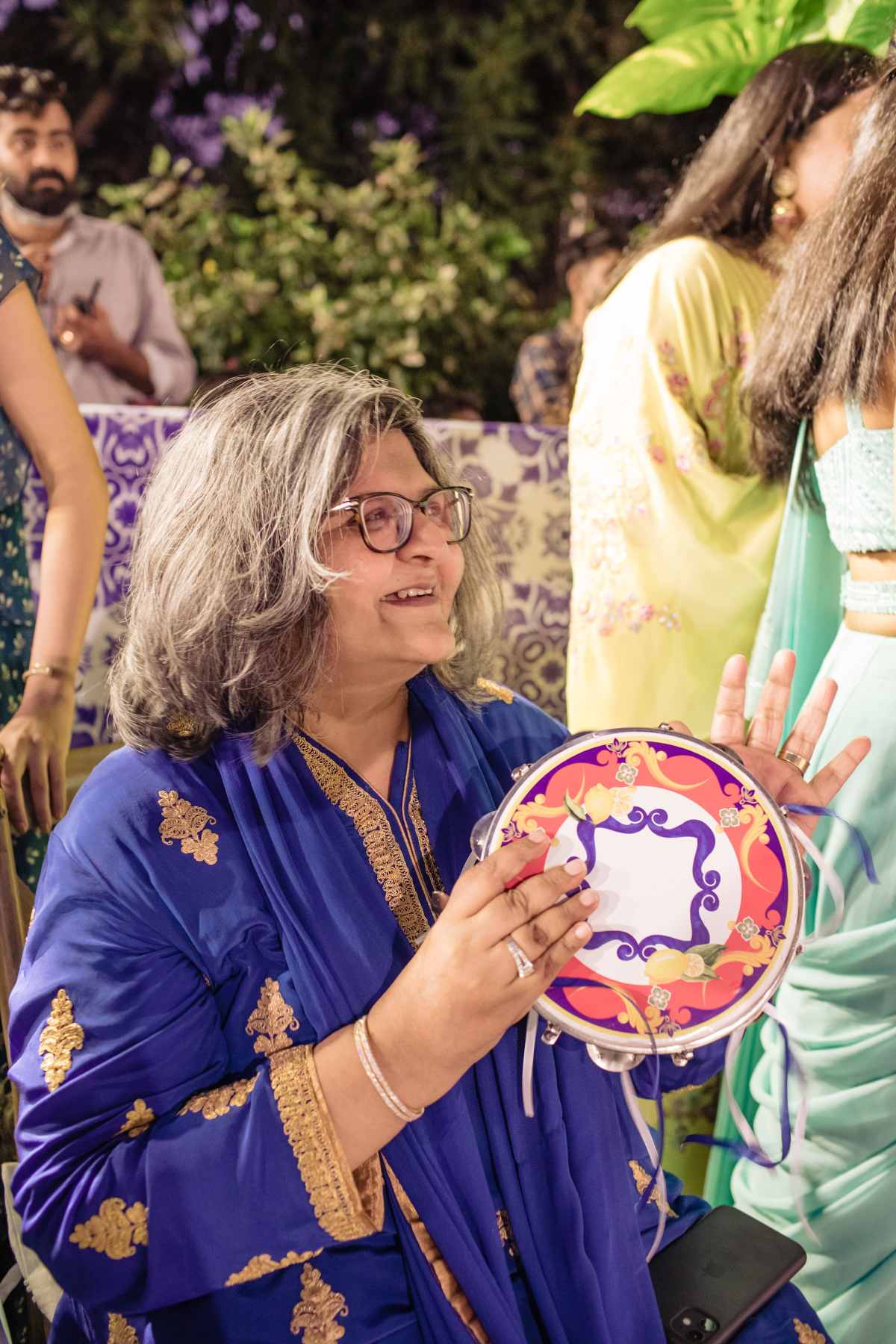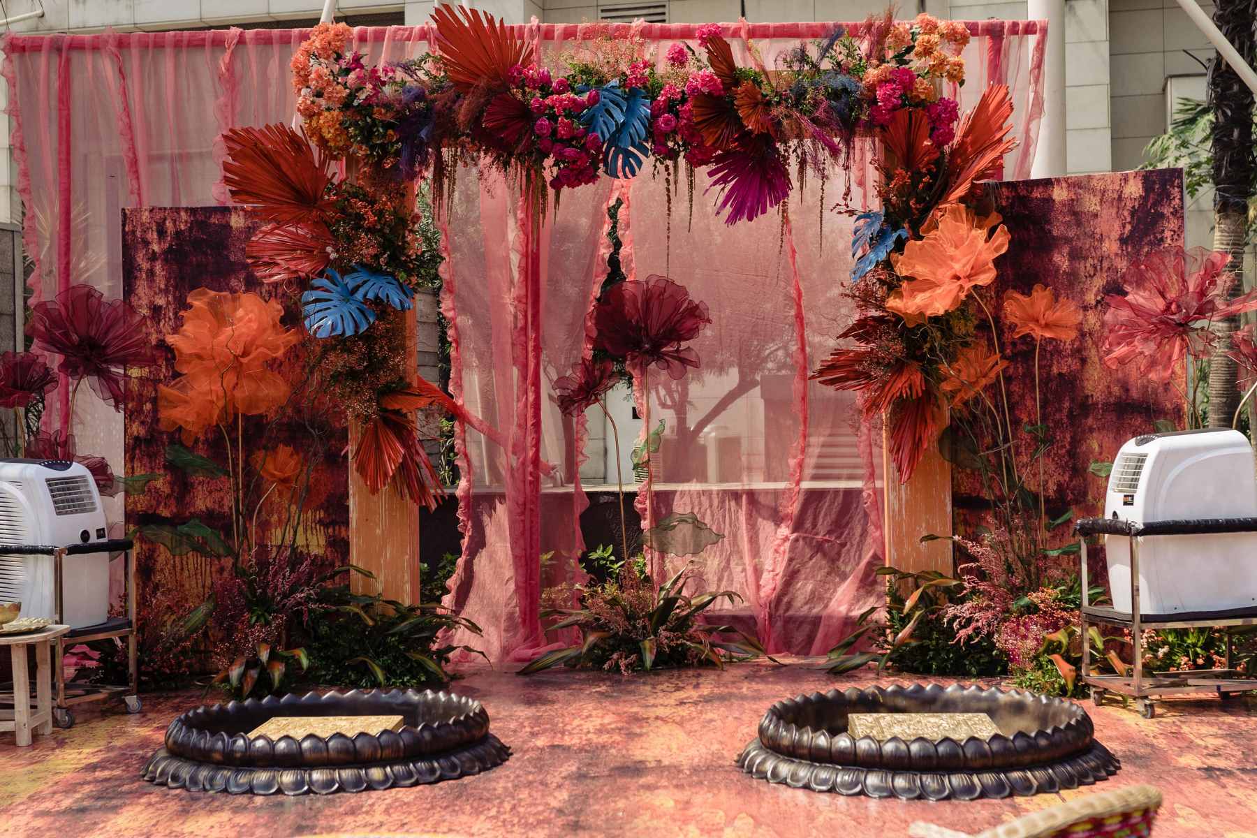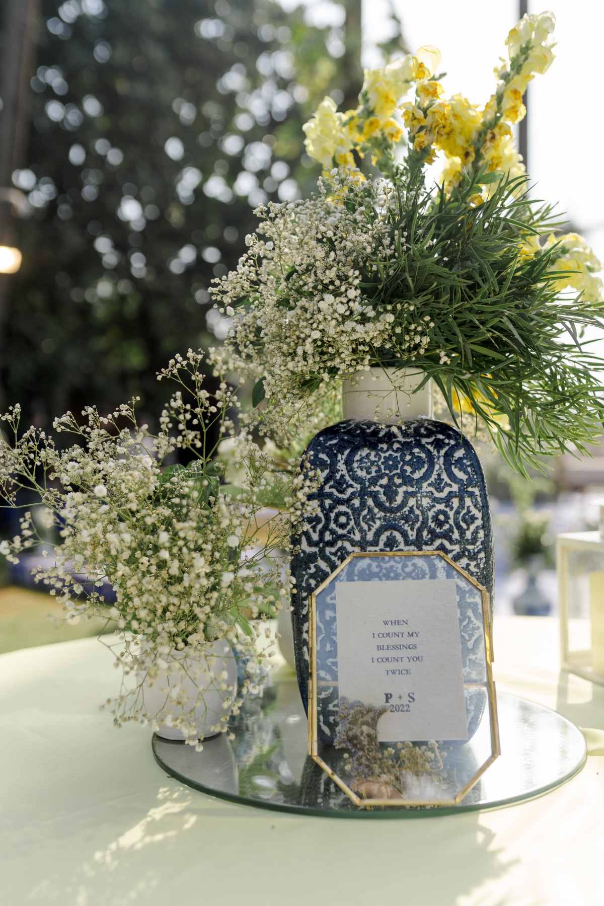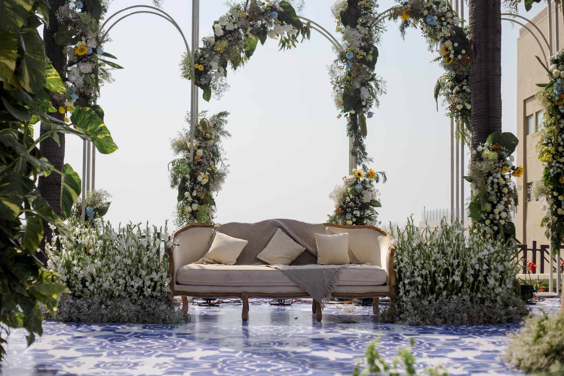 Set against the scenic backdrop of the lawns of Taj Lands End with the sun going down this Tuscan Affair was filled with small pretty details and loads of punk and drama. The friends welcomed the couple to the venue with tambourines and lit balloons and the performances took center stage. Curated cocktails & food got the night started with loads of activities for the guests ranging from an Evil Eye Bar, Toss the Coin to Coffee Residue Reader. A setting where all guests clicked pictures with the Vespa was endearing. We had dancers who performed the Tuscan Tarantella Dance and got the guests grooving, the band was phenomenal and the guests enjoyed it thoroughly. The favours were beautifully packed herbs in test tubes as takeaways. An evening that got the festivities kickstarted.