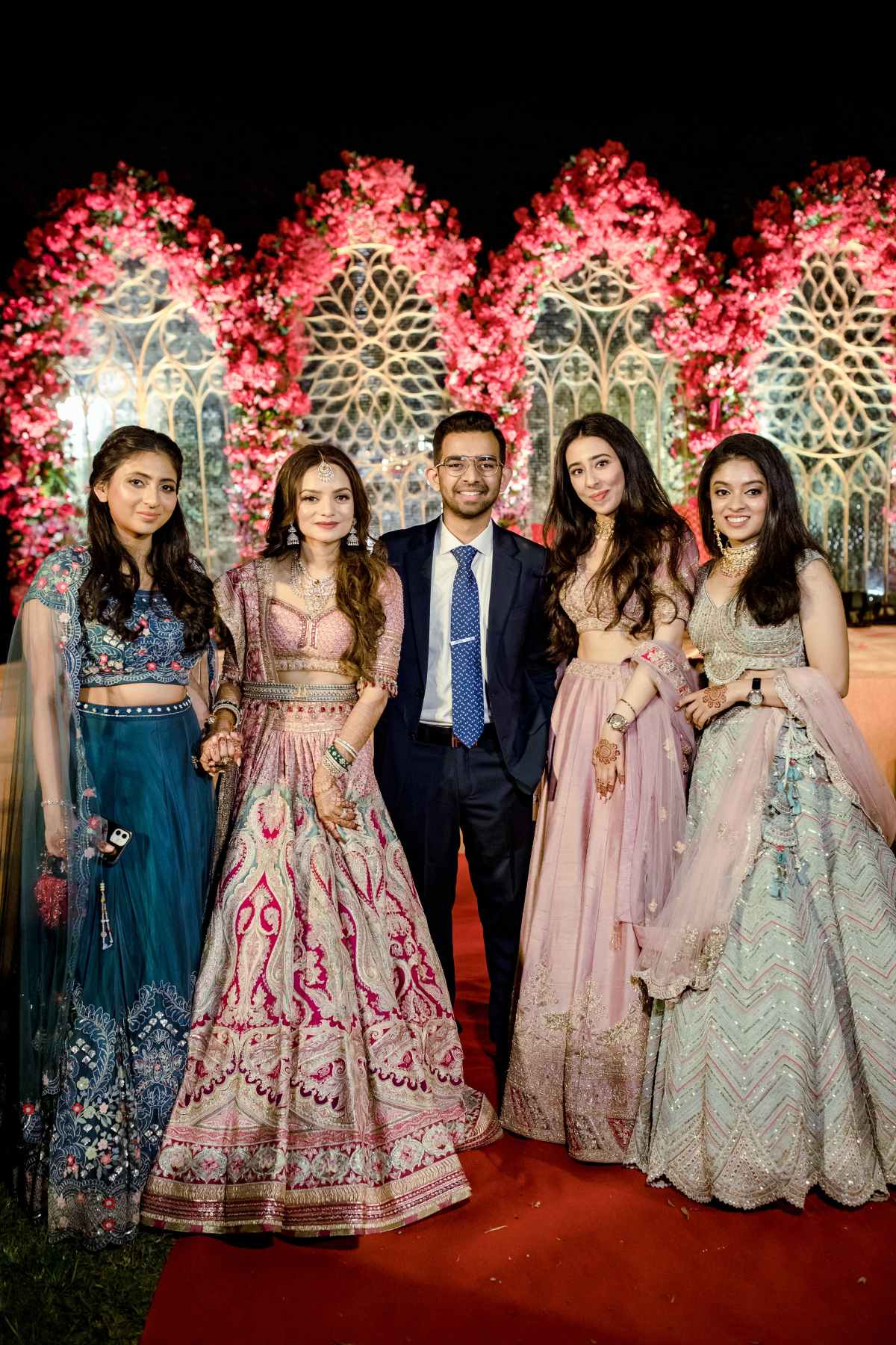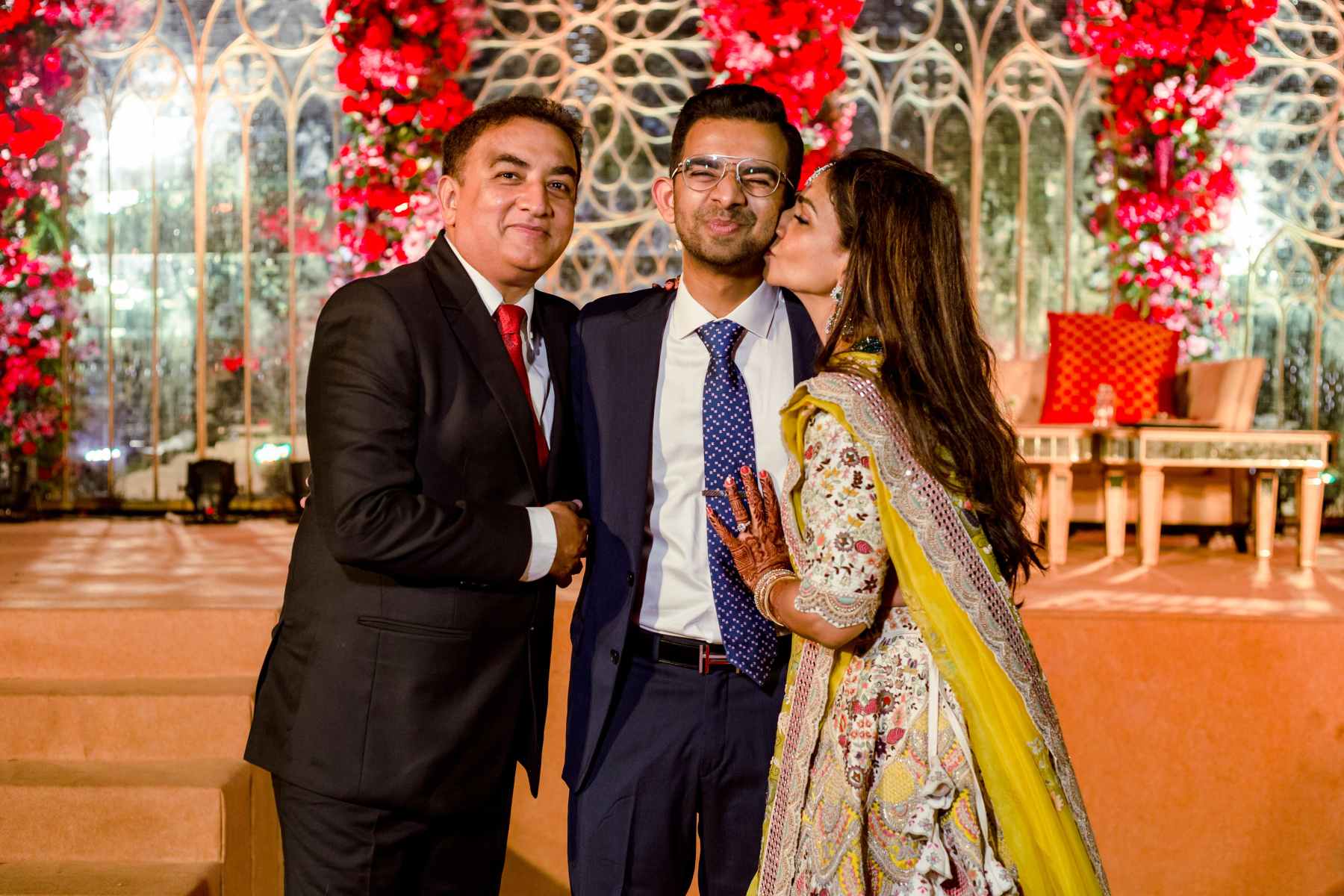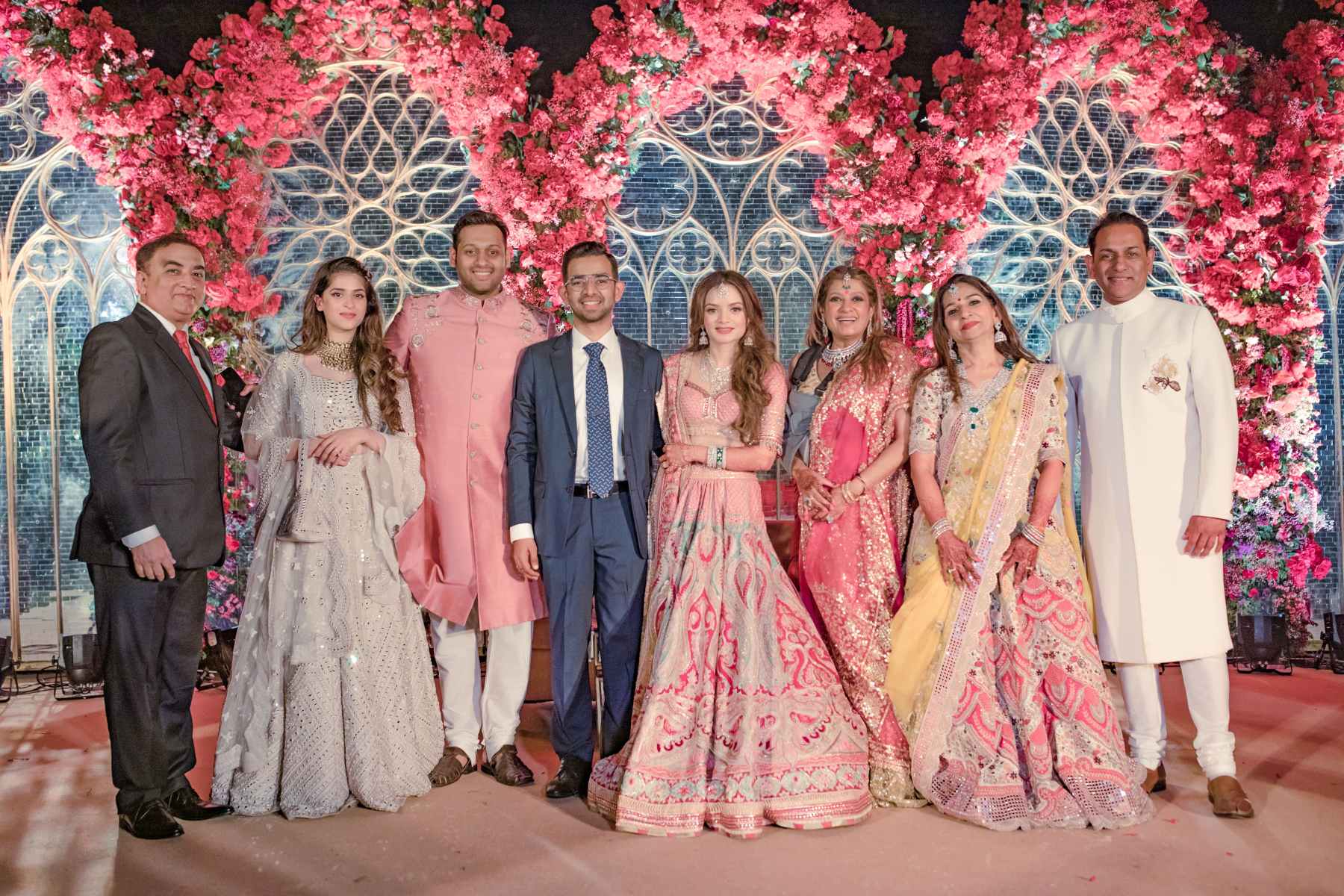 Post the wedding the couple entered the reception to a lawn full of people and sparklers going up to welcome them. It was a traditional reception with an instrumental band playing some blissful tunes while the couple mingled with guests who were there to congratulate them. Post this there were some post-wedding fun games followed by a family sit-down dinner and vidaai ceremony.