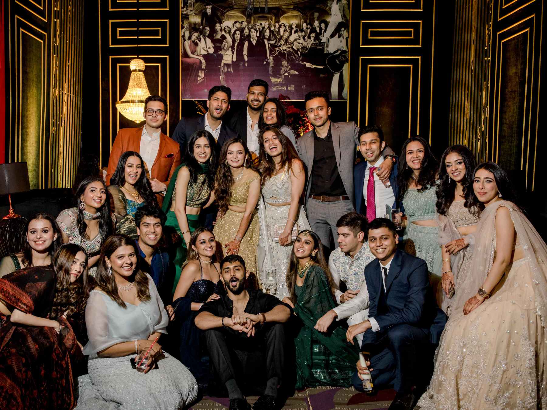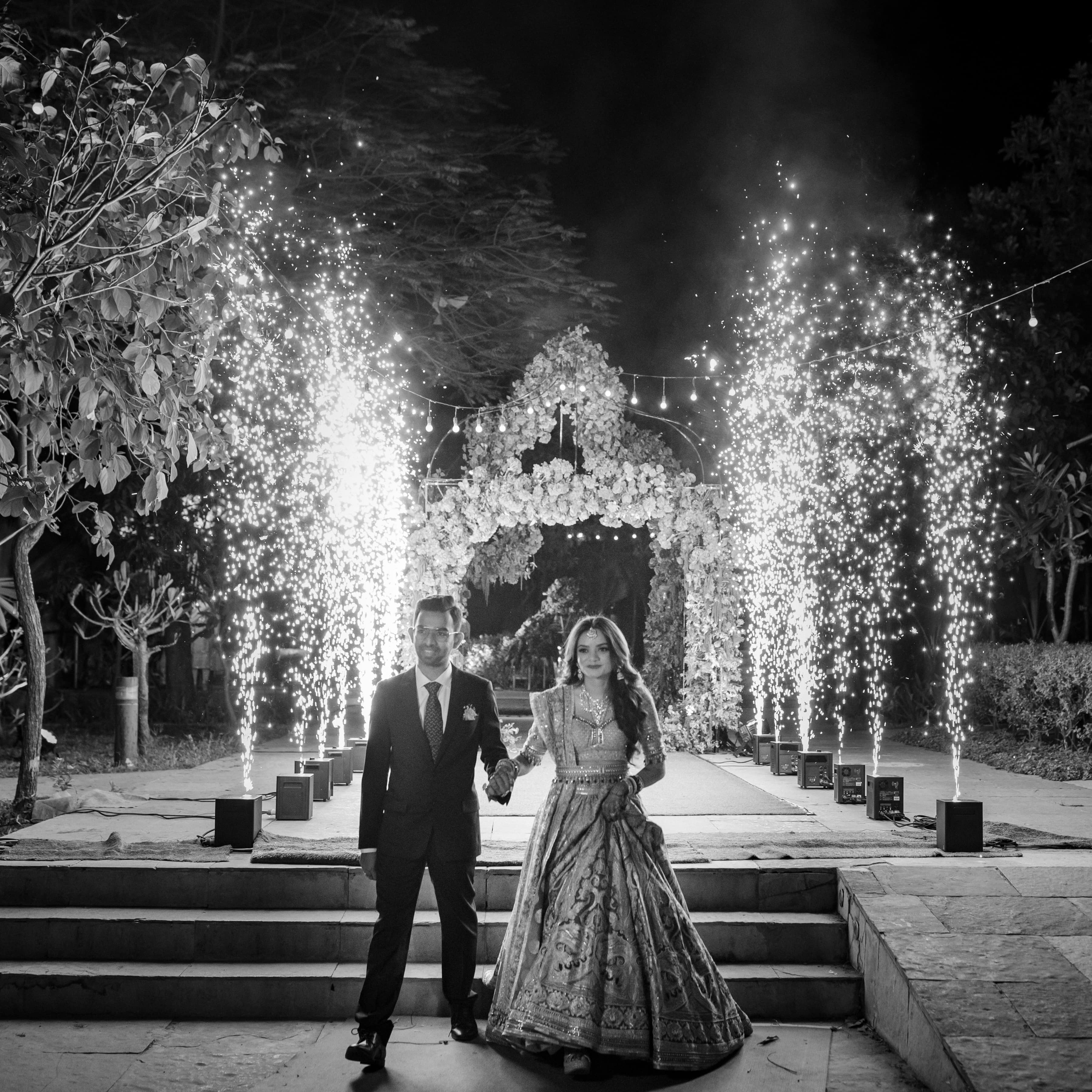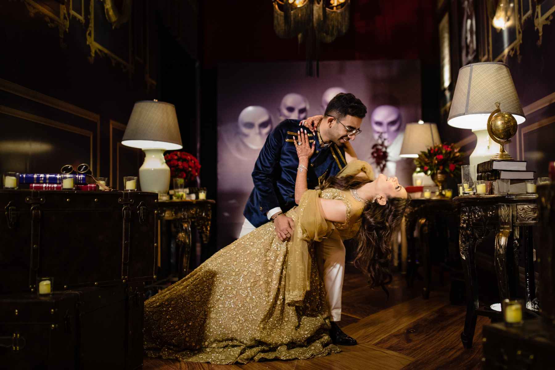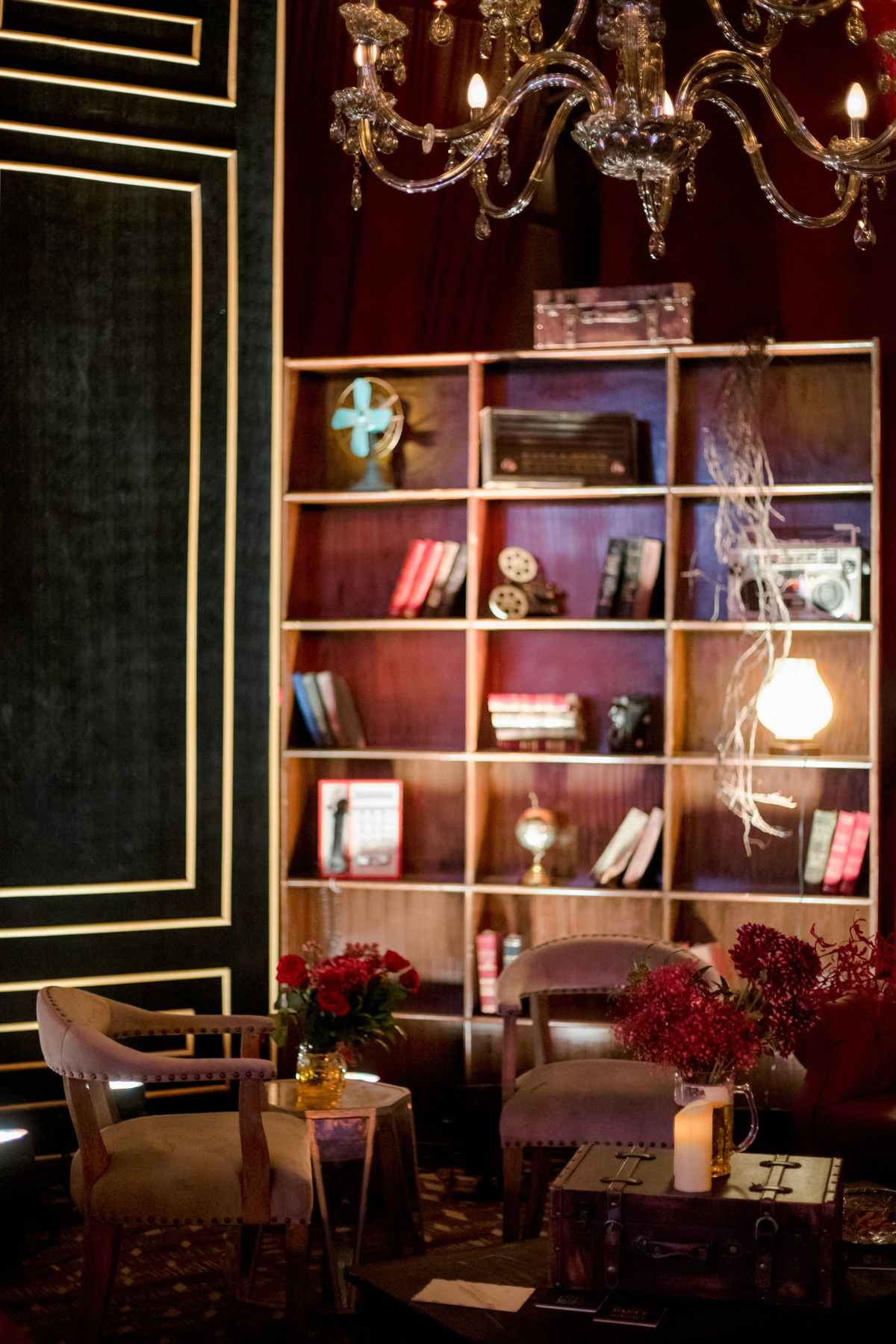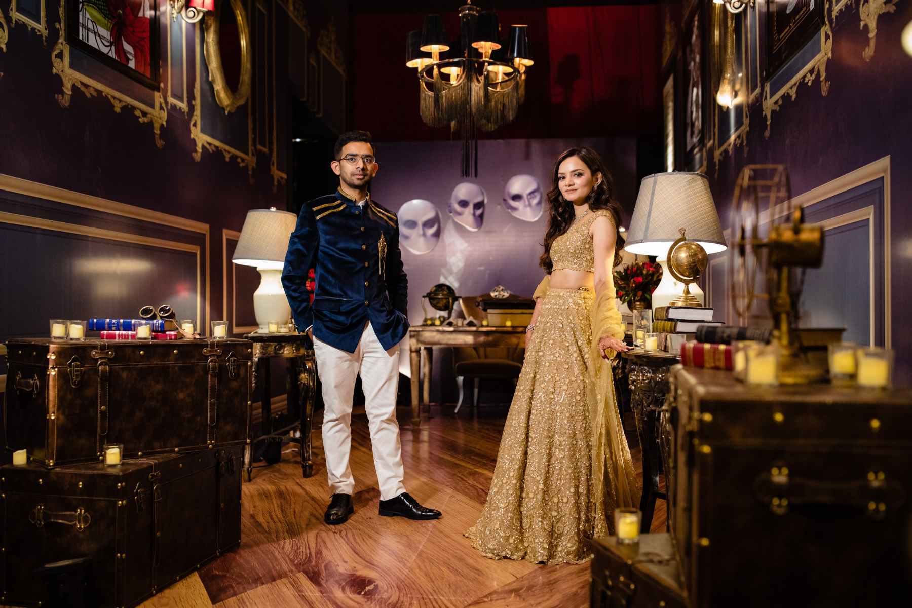 Pratham belonged to a university in Chicago & Shannel belonged to a university in New York. That's where we gathered the theme of Speakeasy, considering the prohibition bar vibe in both cities. The decor transformed everyone to a dungeon vibe and it was surreal with a smoky hidden entryway. Pratham & Shannel looked like a million bucks and the decor just complimented their personalities. There was a speakeasy bar with various types of old-world cocktails, the lounges transported you back in time, and there was a jazz lounge, cigar lounge, and a library. There was an illusionist and a saxophonist just blending with the vibe. The performances took center stage with the family, friends, and the couple dancing to Bollywood moves. The Best Kept Secret band took over with a thousand torch lights flashing and a sight to behold then followed by the best DJ in town taking over with the best percussionist and it was a party that went on till dawn.