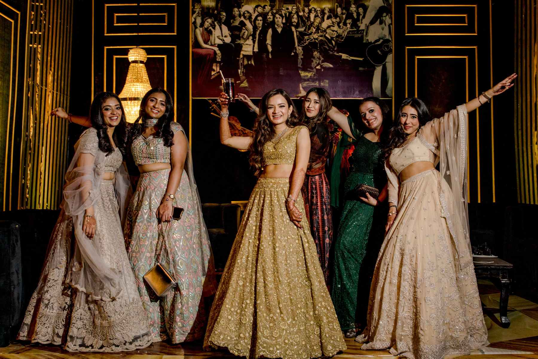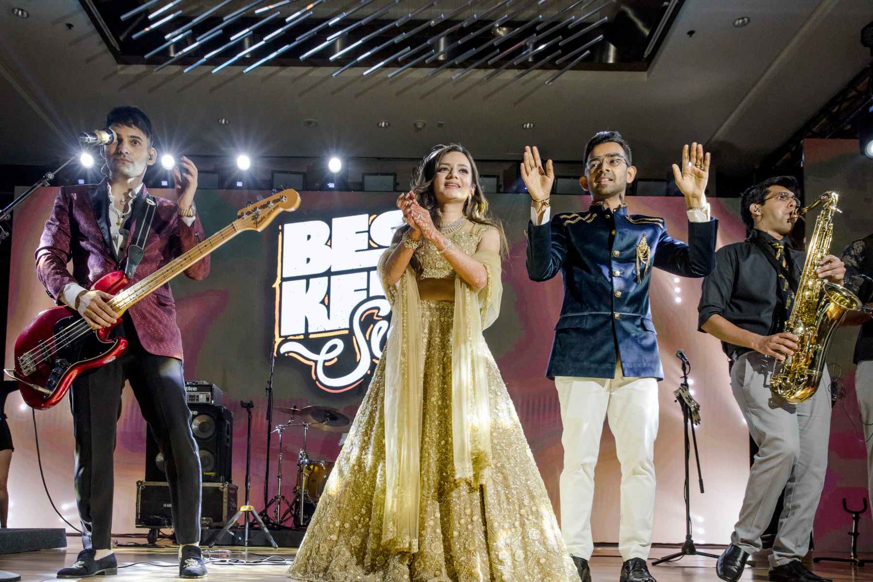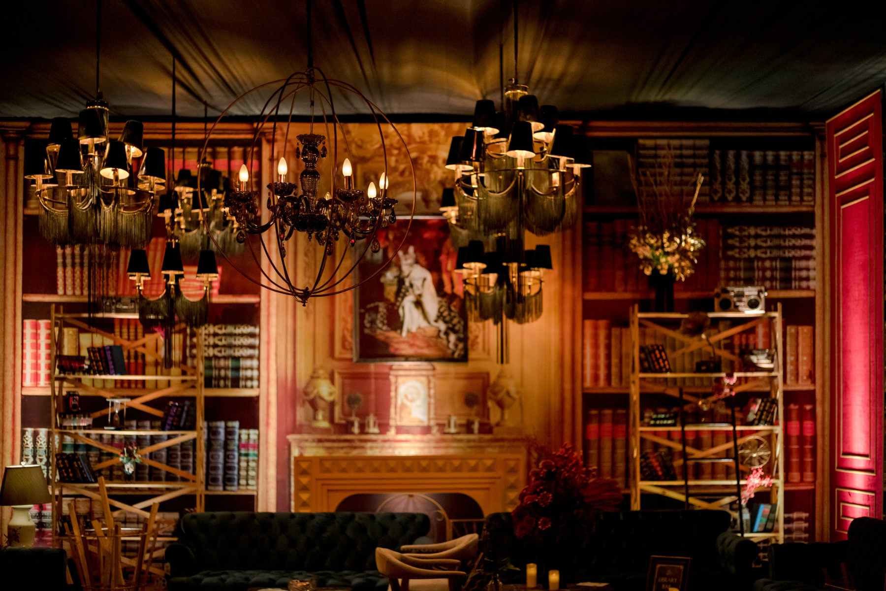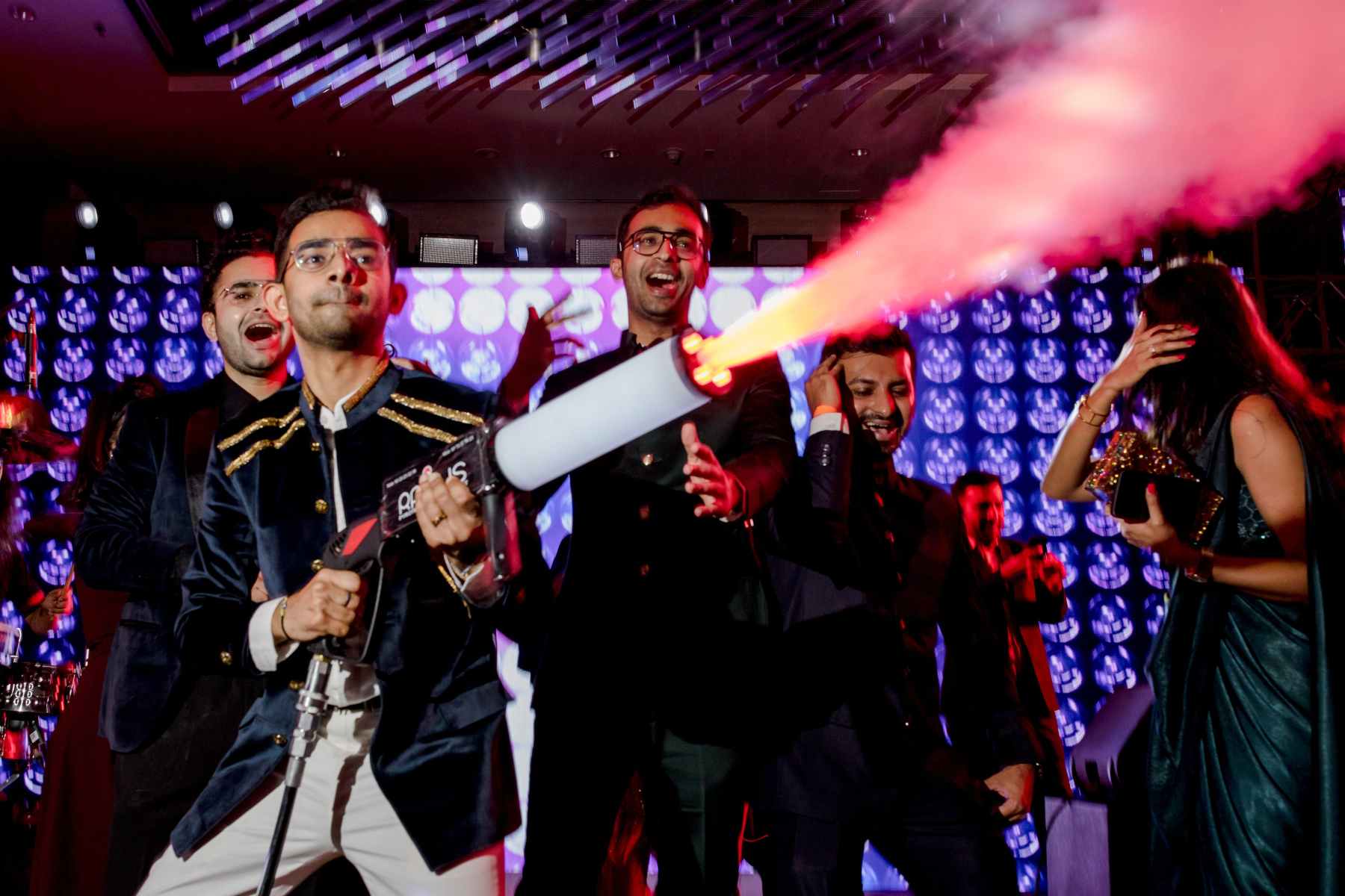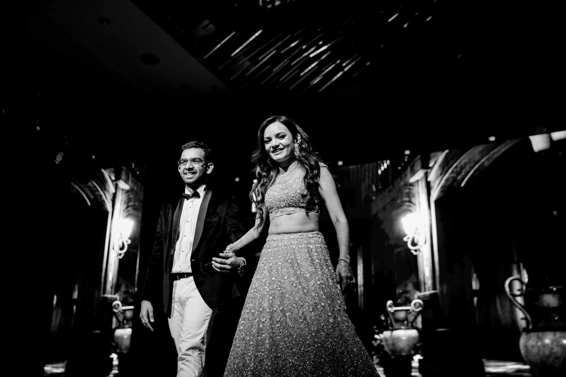 Pratham belonged to a university in Chicago & Shannel belonged to a university in New York. That's where we gathered the theme of Speakeasy, considering the prohibition bar vibe in both cities. The decor transformed everyone to a dungeon vibe and it was surreal with a smoky hidden entryway. Pratham & Shannel looked like a million bucks and the decor just complimented their personalities. There was a speakeasy bar with various types of old-world cocktails, the lounges transported you back in time, and there was a jazz lounge, cigar lounge, and a library. There was an illusionist and a saxophonist just blending with the vibe. The performances took center stage with the family, friends, and the couple dancing to Bollywood moves. The Best Kept Secret band took over with a thousand torch lights flashing and a sight to behold then followed by the best DJ in town taking over with the best percussionist and it was a party that went on till dawn.