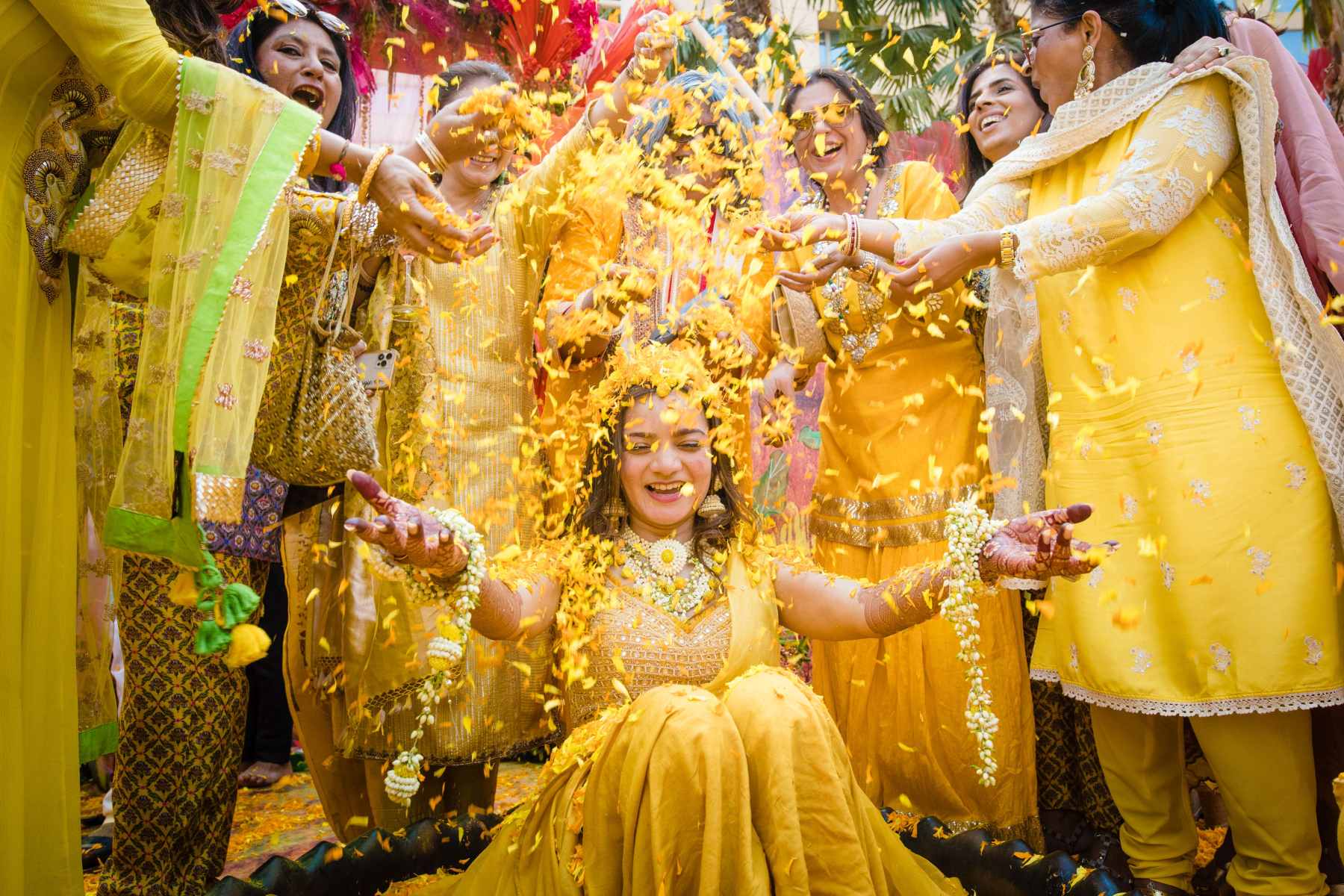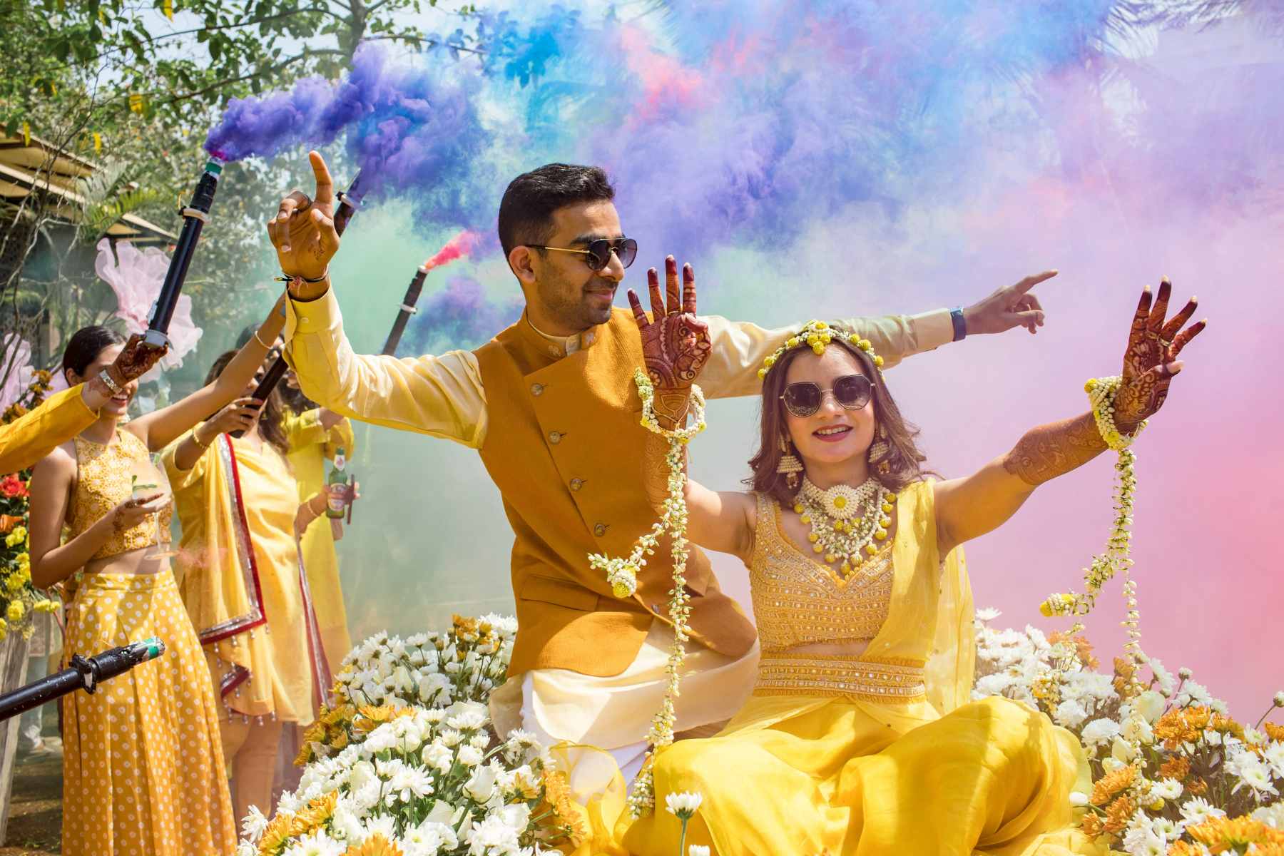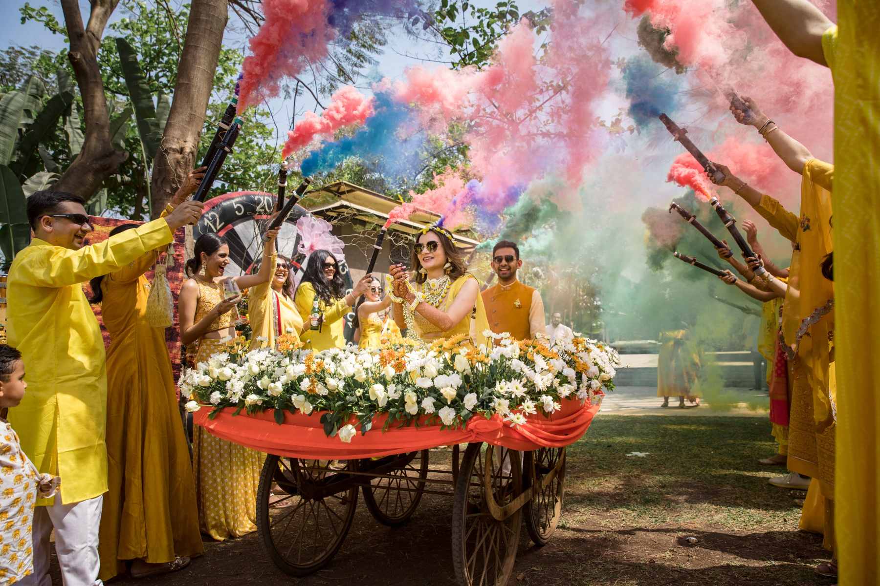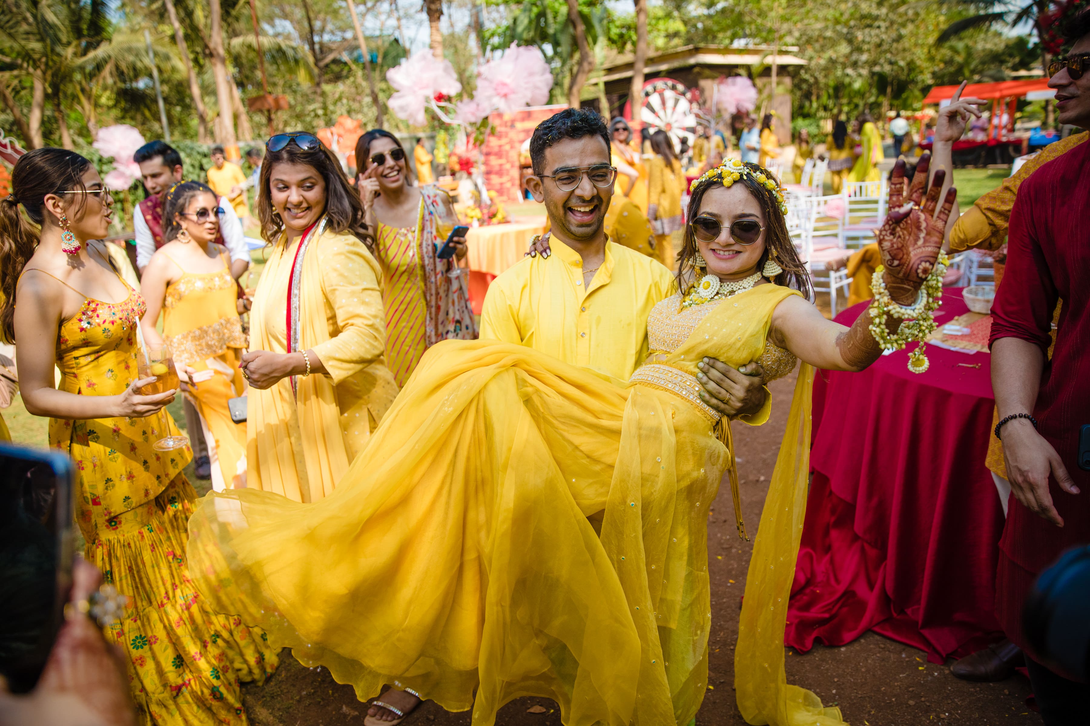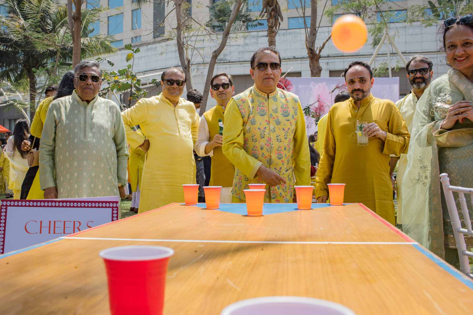 The Haldi was a vibe, vibrant and full of bright colors. The couple entered in a hand cart filled with flowers and the family held coloured bombs that filled the sky with hues of love. The Friends enacted a surprise for the couple and showered the couple with flowers and colors. DJ Perch got everyone to groove to her tunes and the guests enjoyed all the fun activities like Beer Pong, Dart Ball, Burst a Balloon, Mini Toasties, Jenga, Bachpan ki Yaadein, and many more. The guests twirled to a 360-degree camera and although it was sunny the guests had a fabulous start to the Two-day wedding festivities.