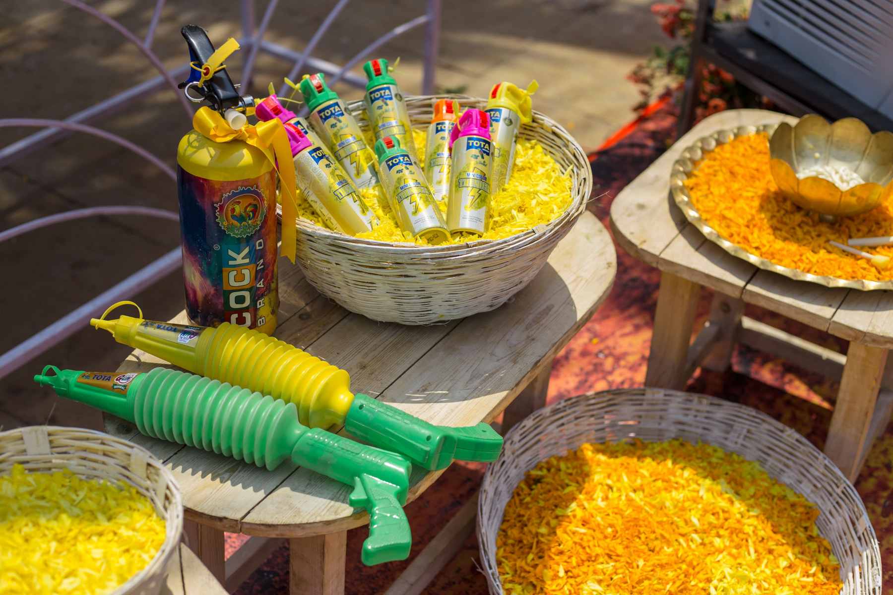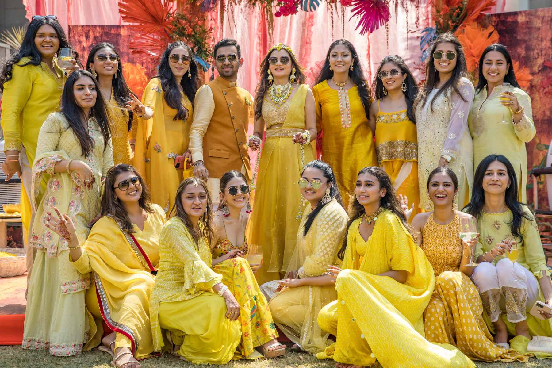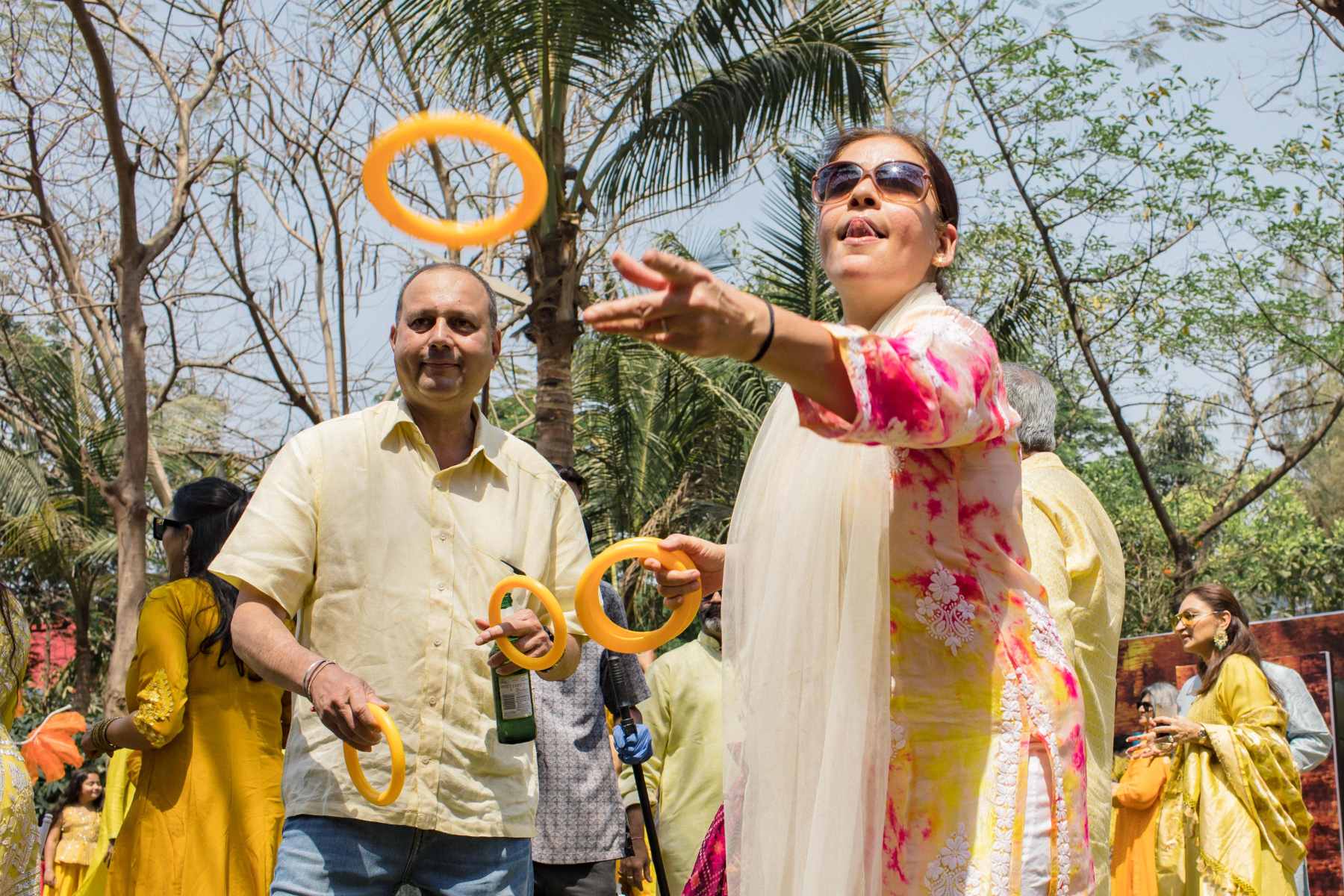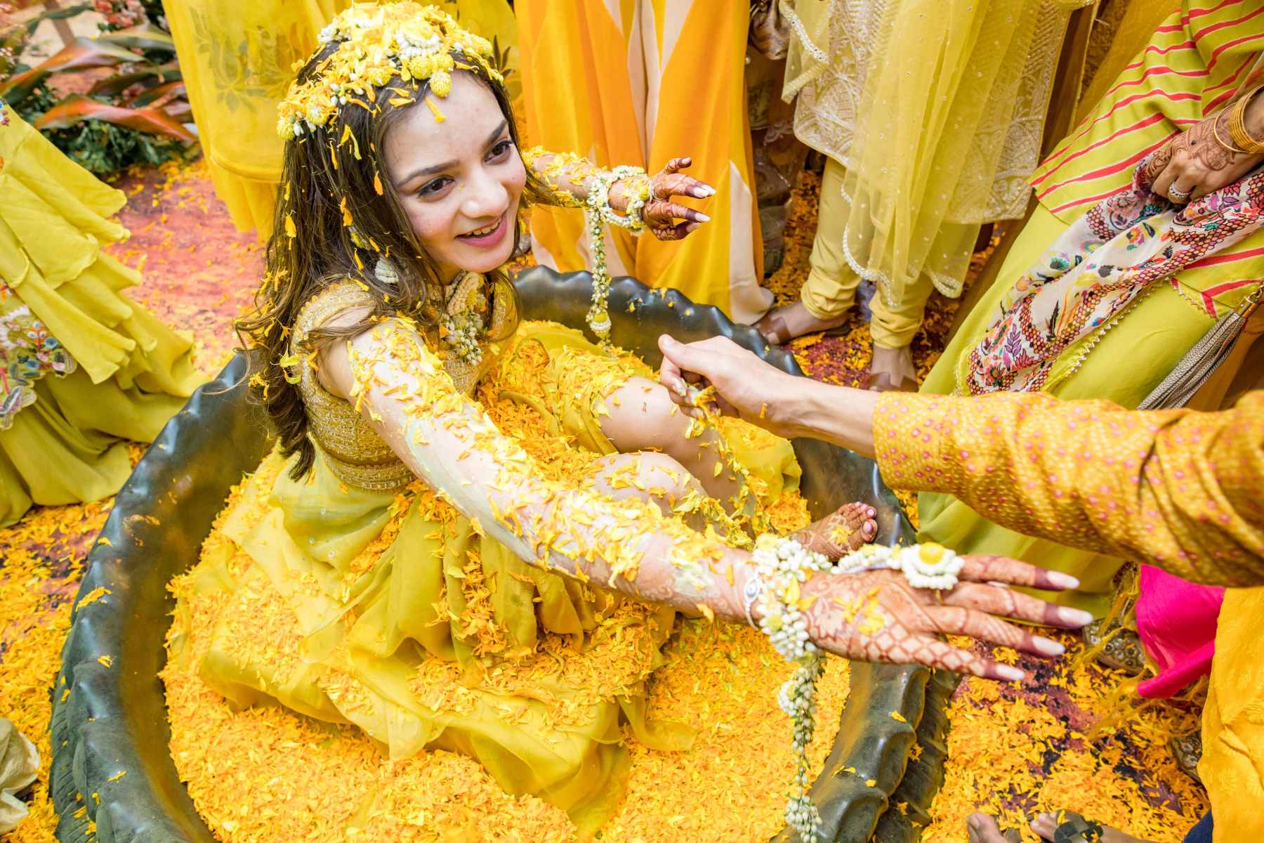 The Haldi was a vibe, vibrant and full of bright colors. The couple entered in a hand cart filled with flowers and the family held coloured bombs that filled the sky with hues of love. The Friends enacted a surprise for the couple and showered the couple with flowers and colors. DJ Perch got everyone to groove to her tunes and the guests enjoyed all the fun activities like Beer Pong, Dart Ball, Burst a Balloon, Mini Toasties, Jenga, Bachpan ki Yaadein, and many more. The guests twirled to a 360-degree camera and although it was sunny the guests had a fabulous start to the Two-day wedding festivities.