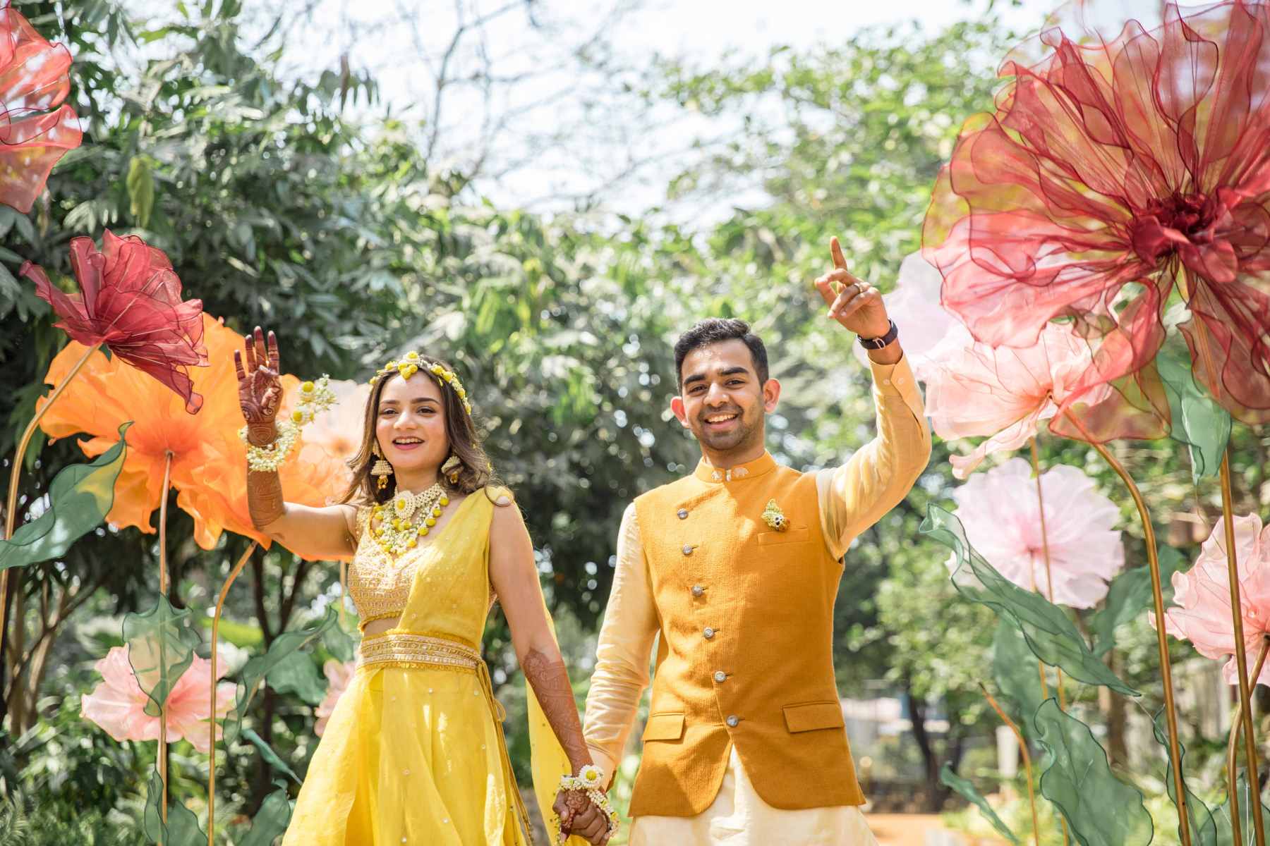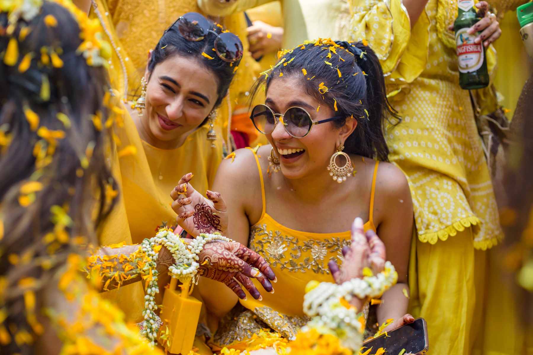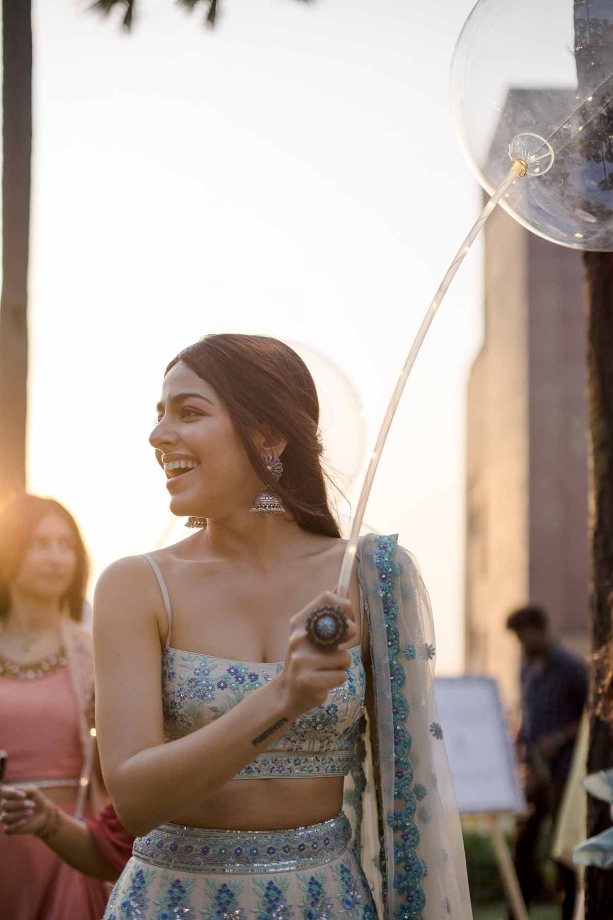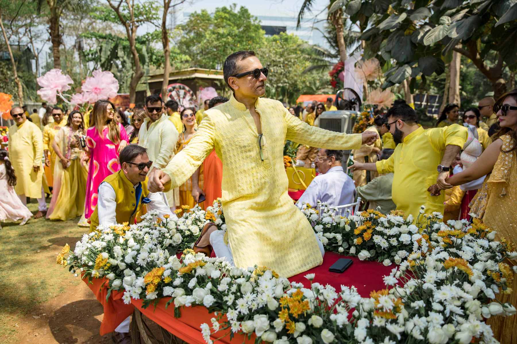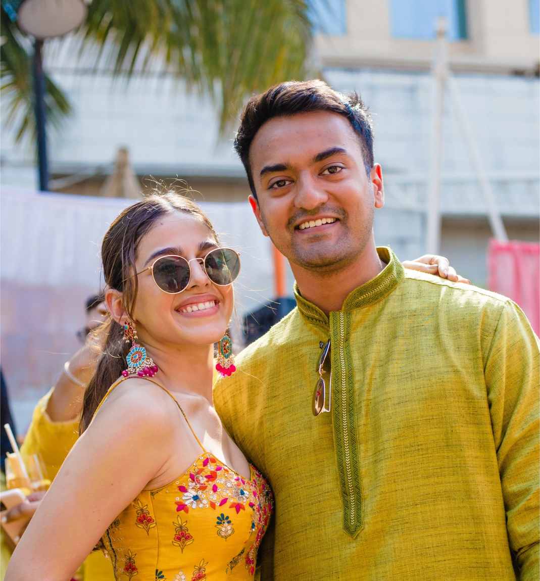 The Haldi was a vibe, vibrant and full of bright colors. The couple entered in a hand cart filled with flowers and the family held coloured bombs that filled the sky with hues of love. The Friends enacted a surprise for the couple and showered the couple with flowers and colors. DJ Perch got everyone to groove to her tunes and the guests enjoyed all the fun activities like Beer Pong, Dart Ball, Burst a Balloon, Mini Toasties, Jenga, Bachpan ki Yaadein, and many more. The guests twirled to a 360-degree camera and although it was sunny the guests had a fabulous start to the Two-day wedding festivities.