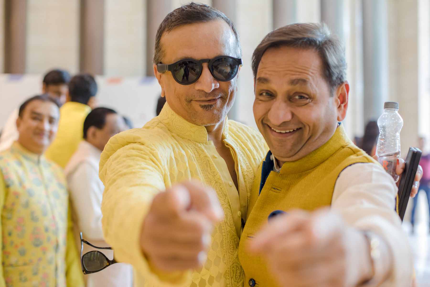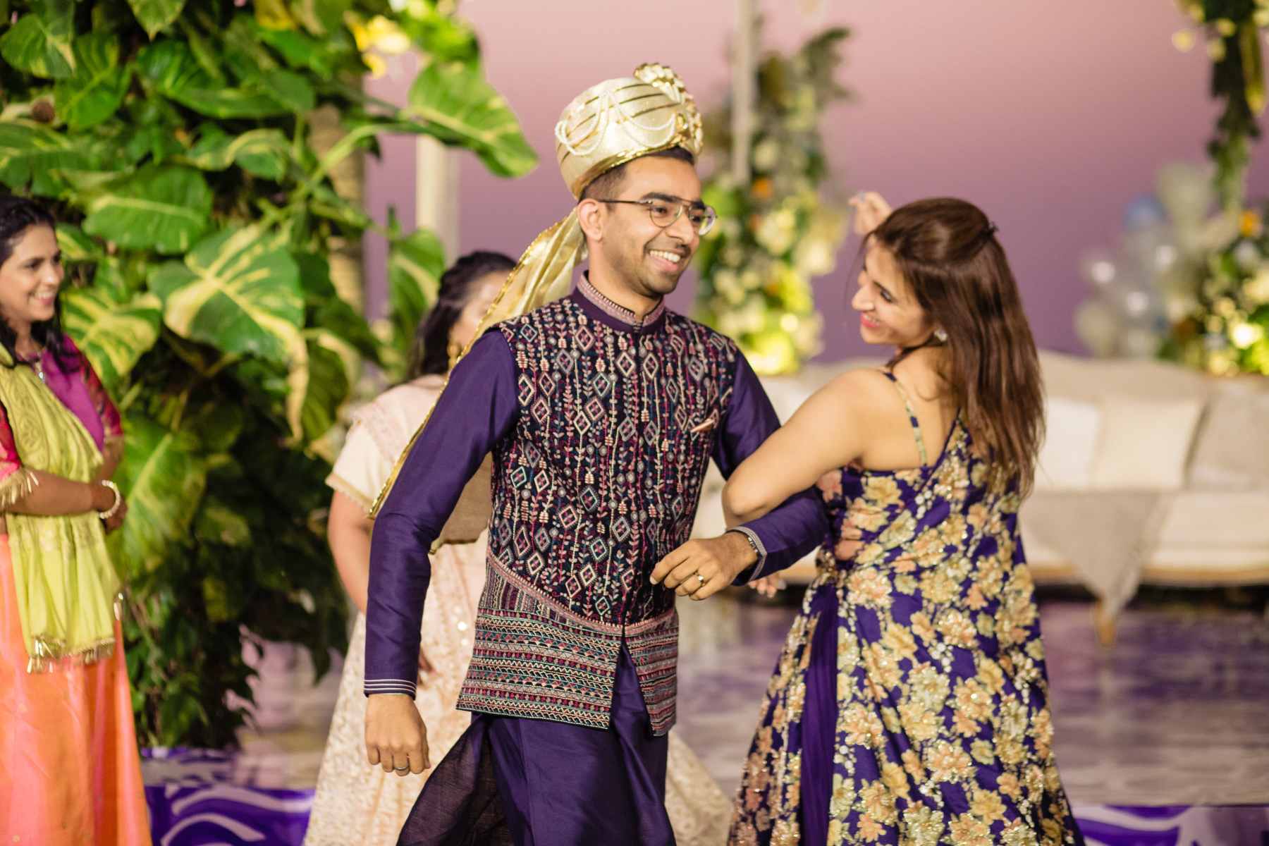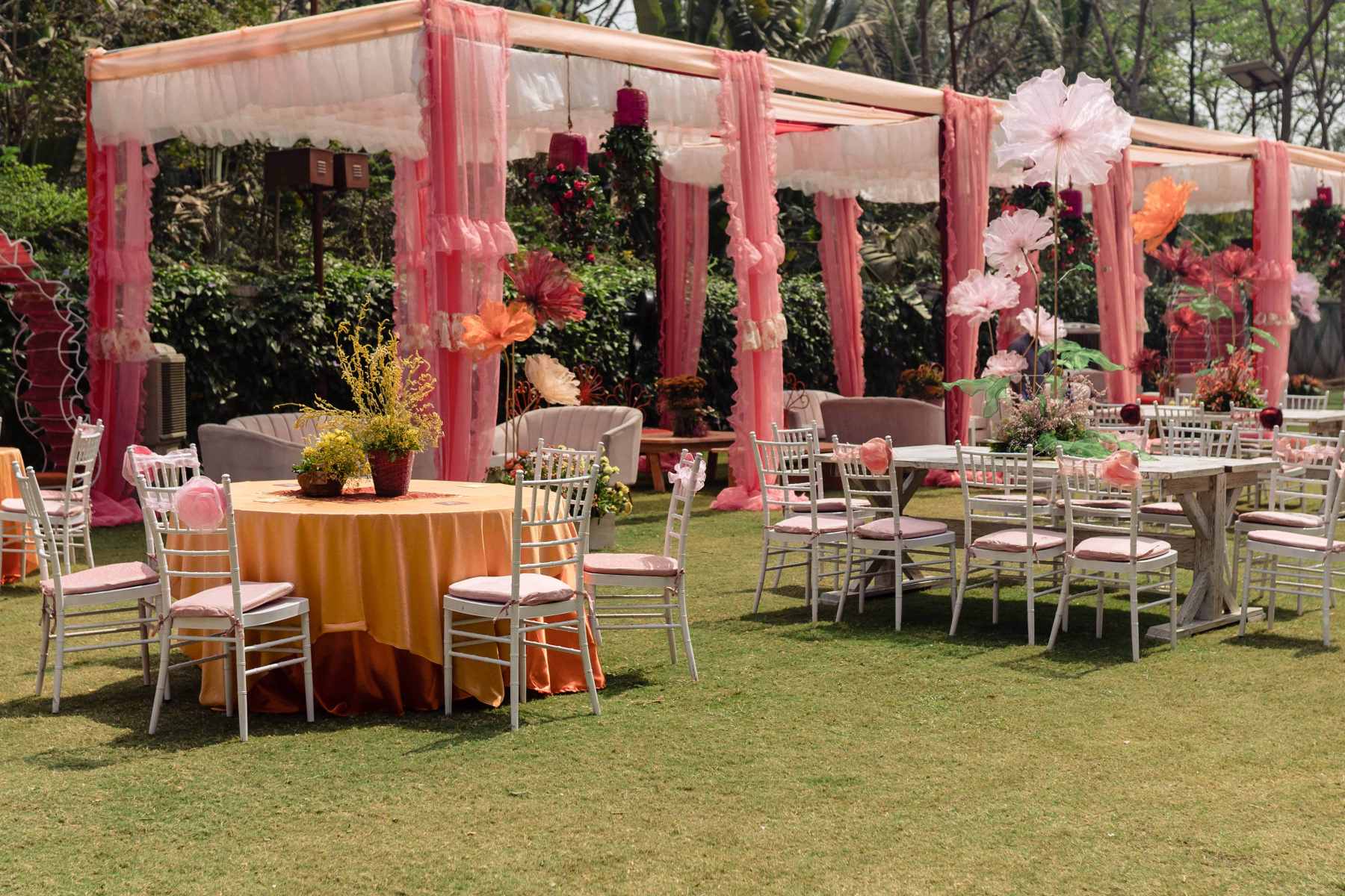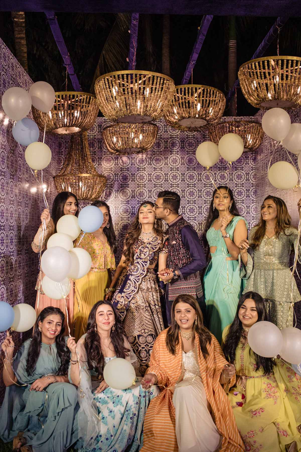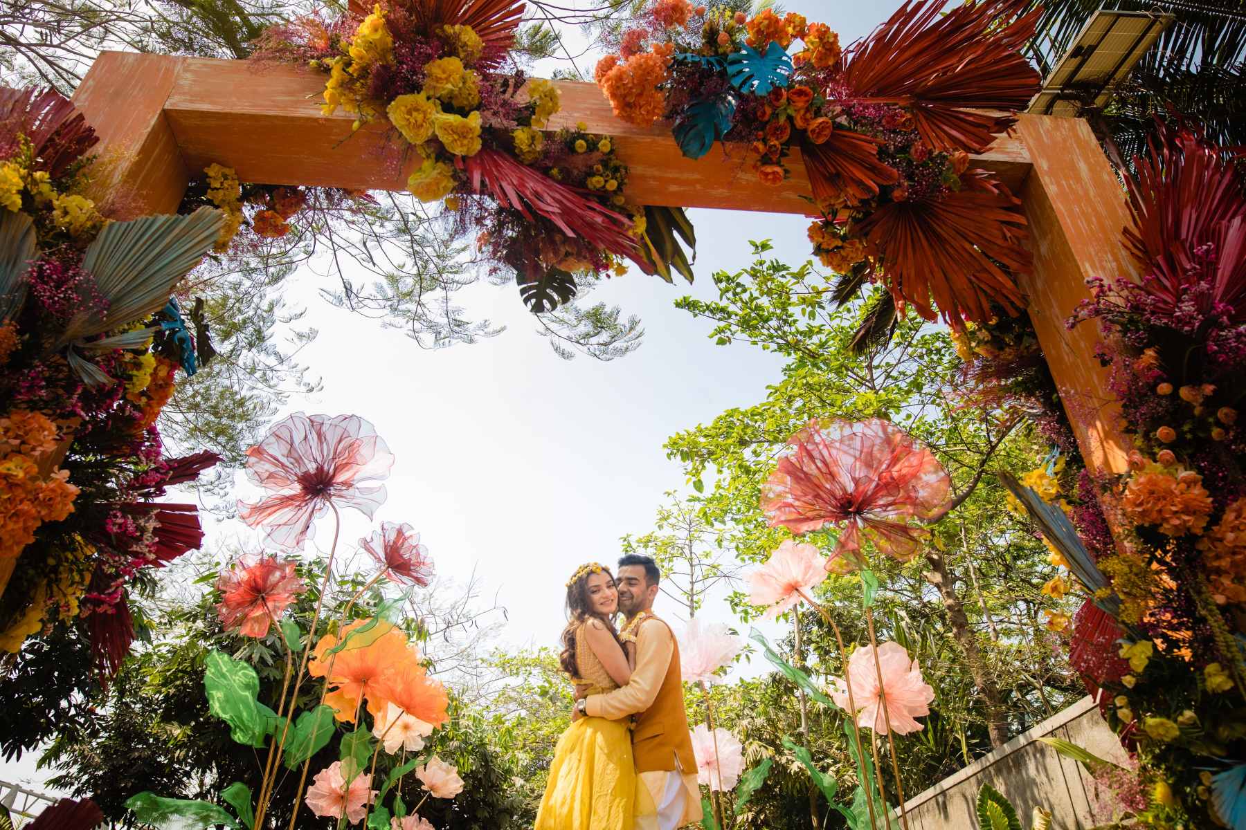 The Haldi was a vibe, vibrant and full of bright colors. The couple entered in a hand cart filled with flowers and the family held coloured bombs that filled the sky with hues of love. The Friends enacted a surprise for the couple and showered the couple with flowers and colors. DJ Perch got everyone to groove to her tunes and the guests enjoyed all the fun activities like Beer Pong, Dart Ball, Burst a Balloon, Mini Toasties, Jenga, Bachpan ki Yaadein, and many more. The guests twirled to a 360-degree camera and although it was sunny the guests had a fabulous start to the Two-day wedding festivities.