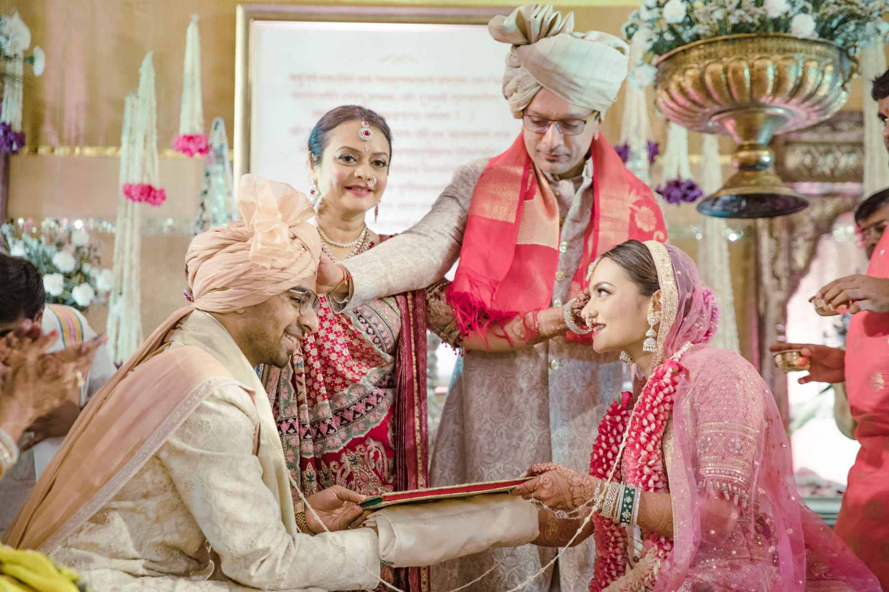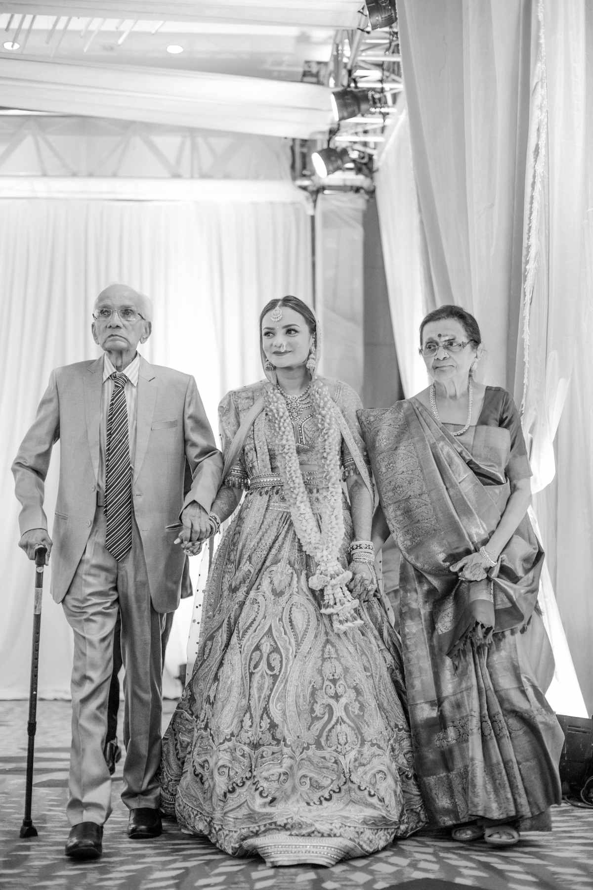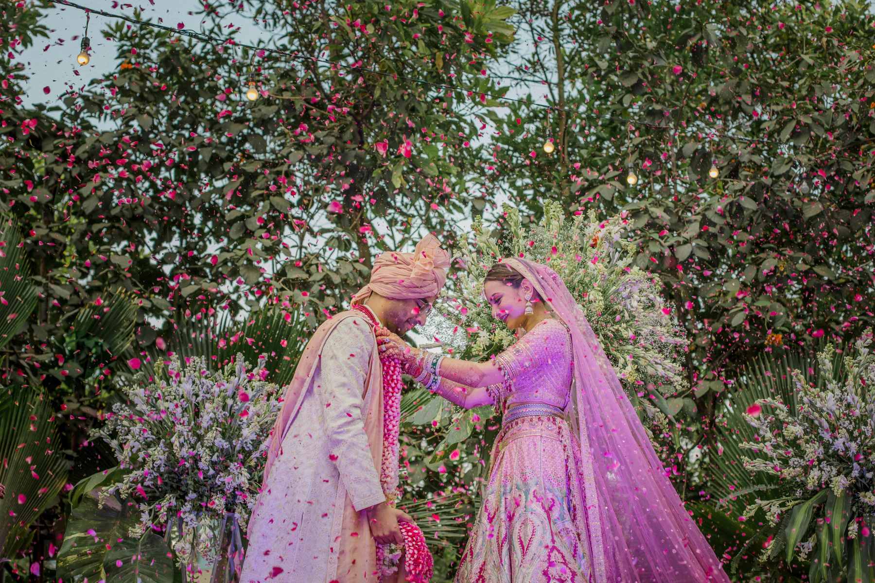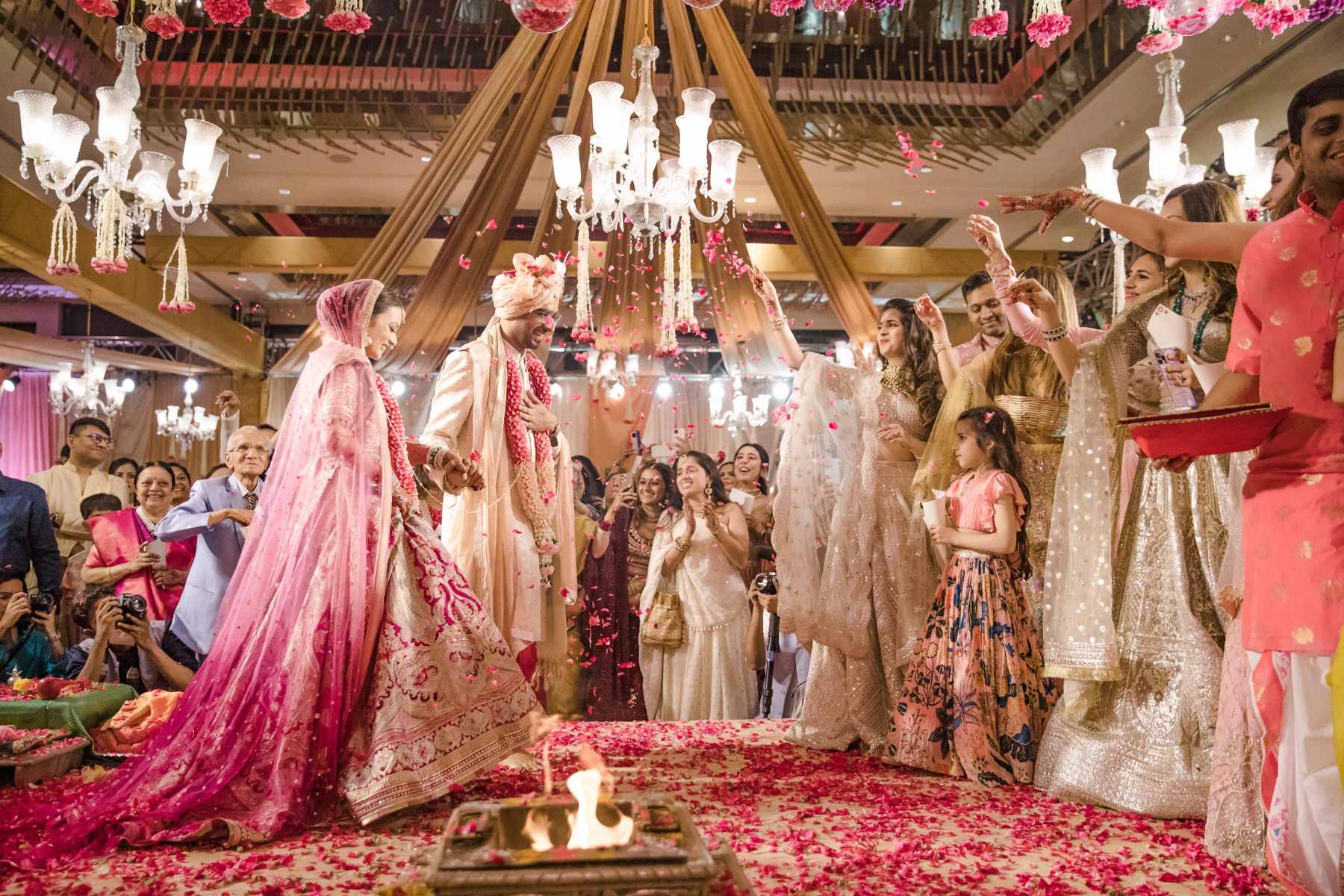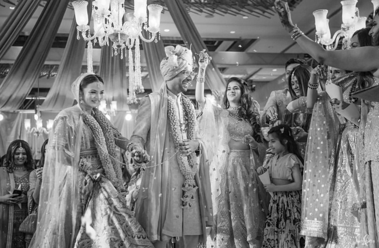 Pratham entered to small welcome ceremony by the mother-in-law. Followed by the beautiful bride walking into a custom Pre recorded track by Pratham which was a surprise for her. She was so moved by his gesture. The ceremony began with Ameya Dabli creating a blissful ambience and Shannel entered with her grandparents and was escorted to the mandap by her dad. With a gleam in her eye, we saw magic unfold with custom vows in a hand-calligraphed frame. The families showered them with rose petals and they both were husband & wife.