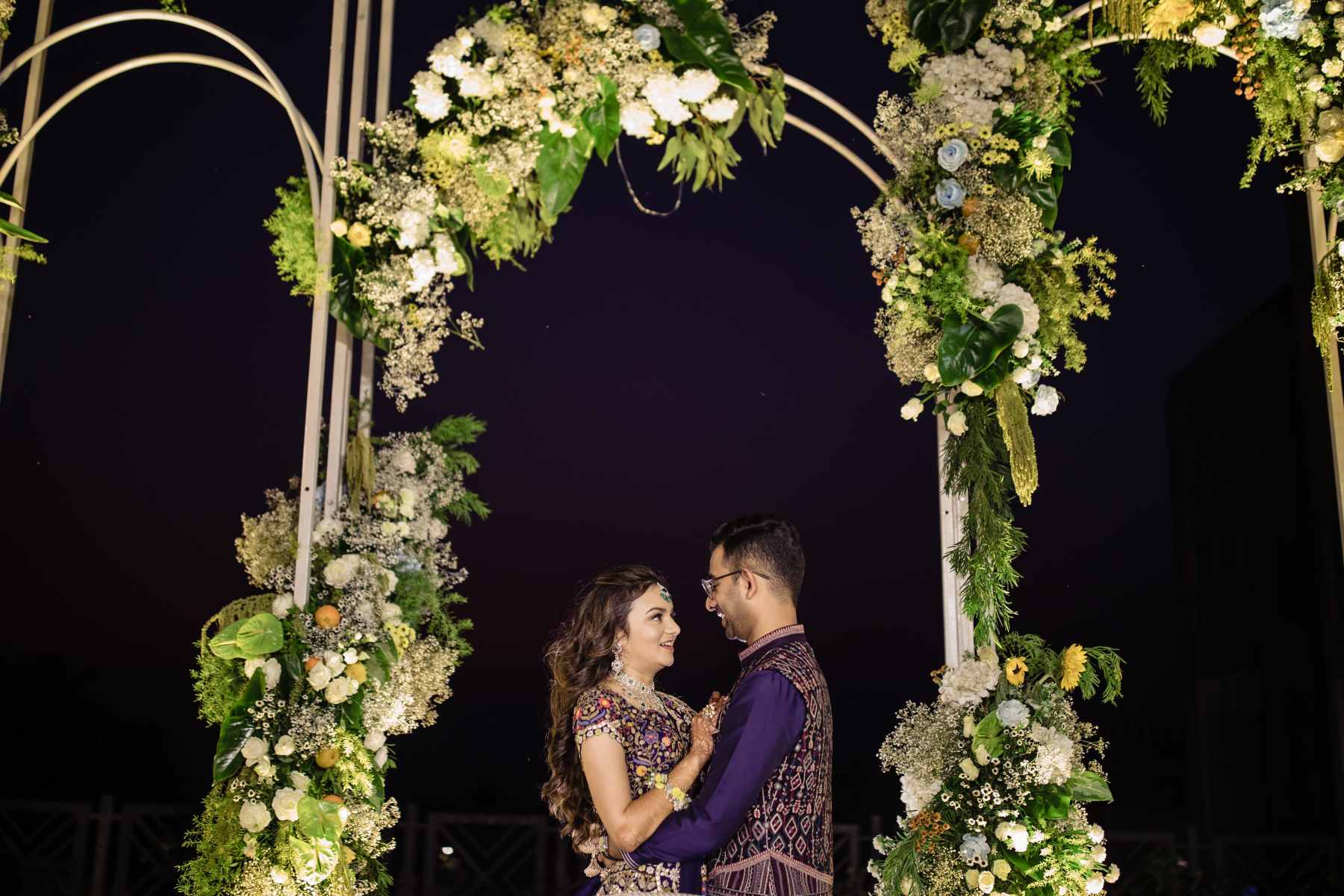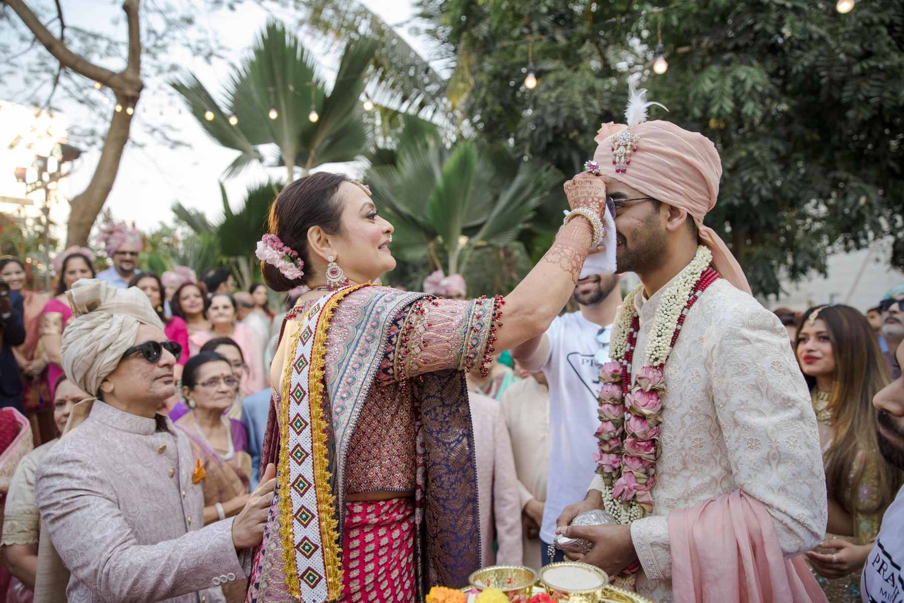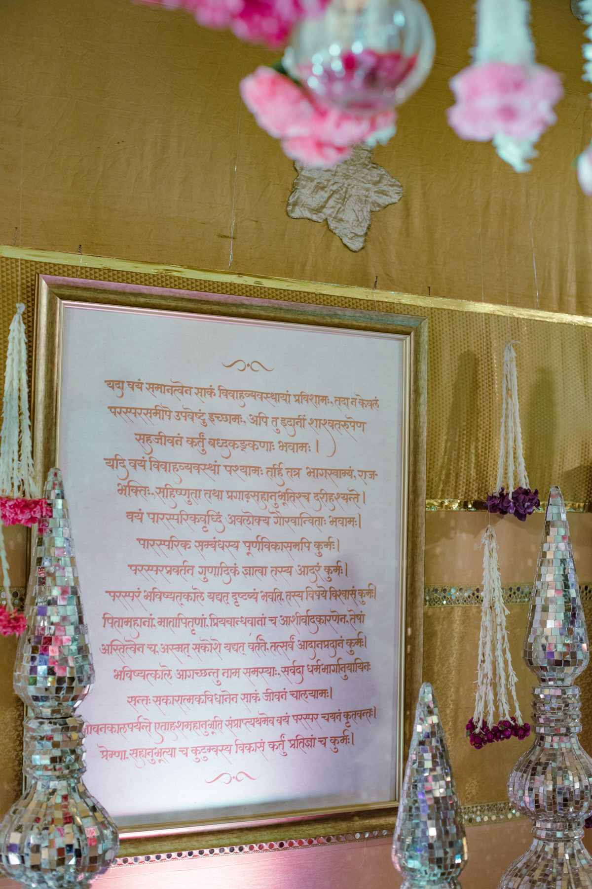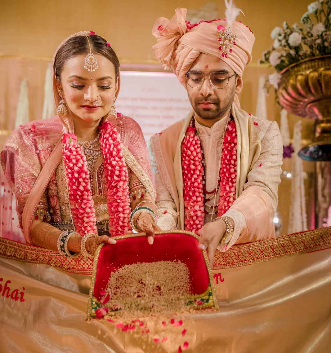 Pratham entered to small welcome ceremony by the mother-in-law. Followed by the beautiful bride walking into a custom Pre recorded track by Pratham which was a surprise for her. She was so moved by his gesture. The ceremony began with Ameya Dabli creating a blissful ambience and Shannel entered with her grandparents and was escorted to the mandap by her dad. With a gleam in her eye, we saw magic unfold with custom vows in a hand-calligraphed frame. The families showered them with rose petals and they both were husband & wife.