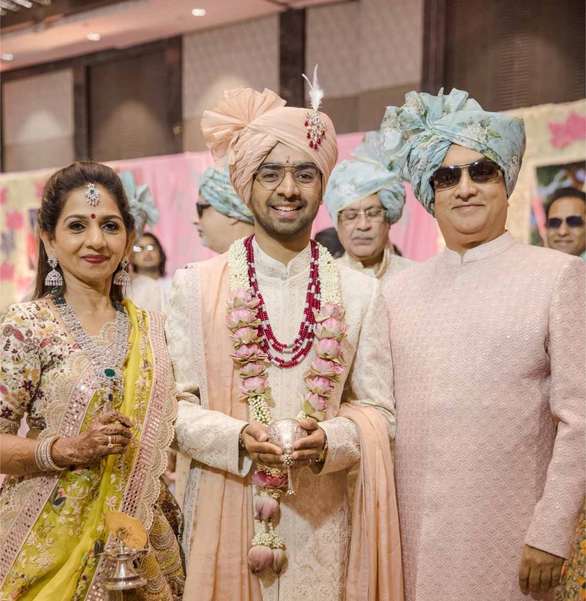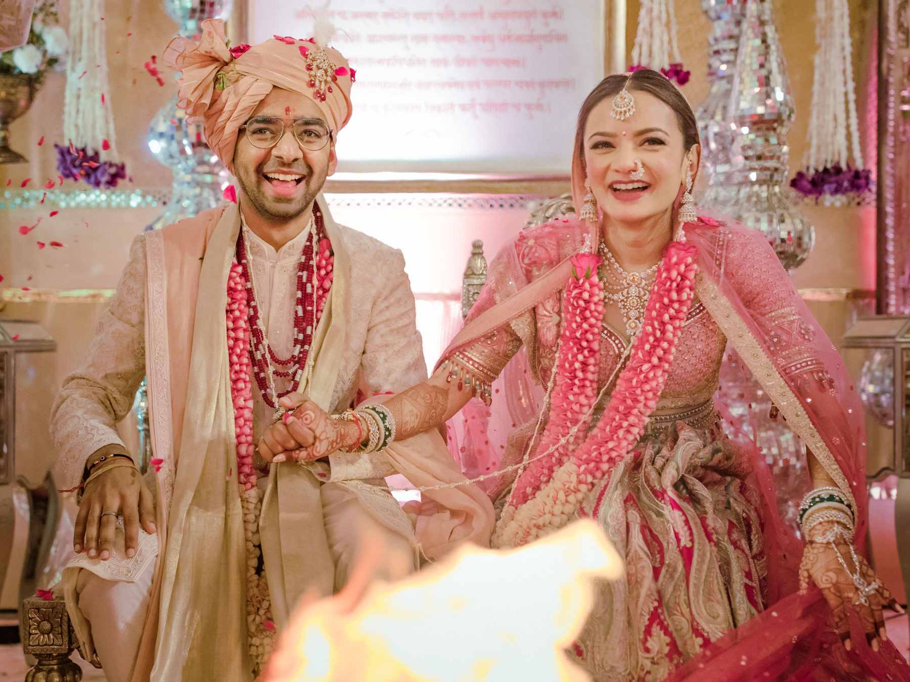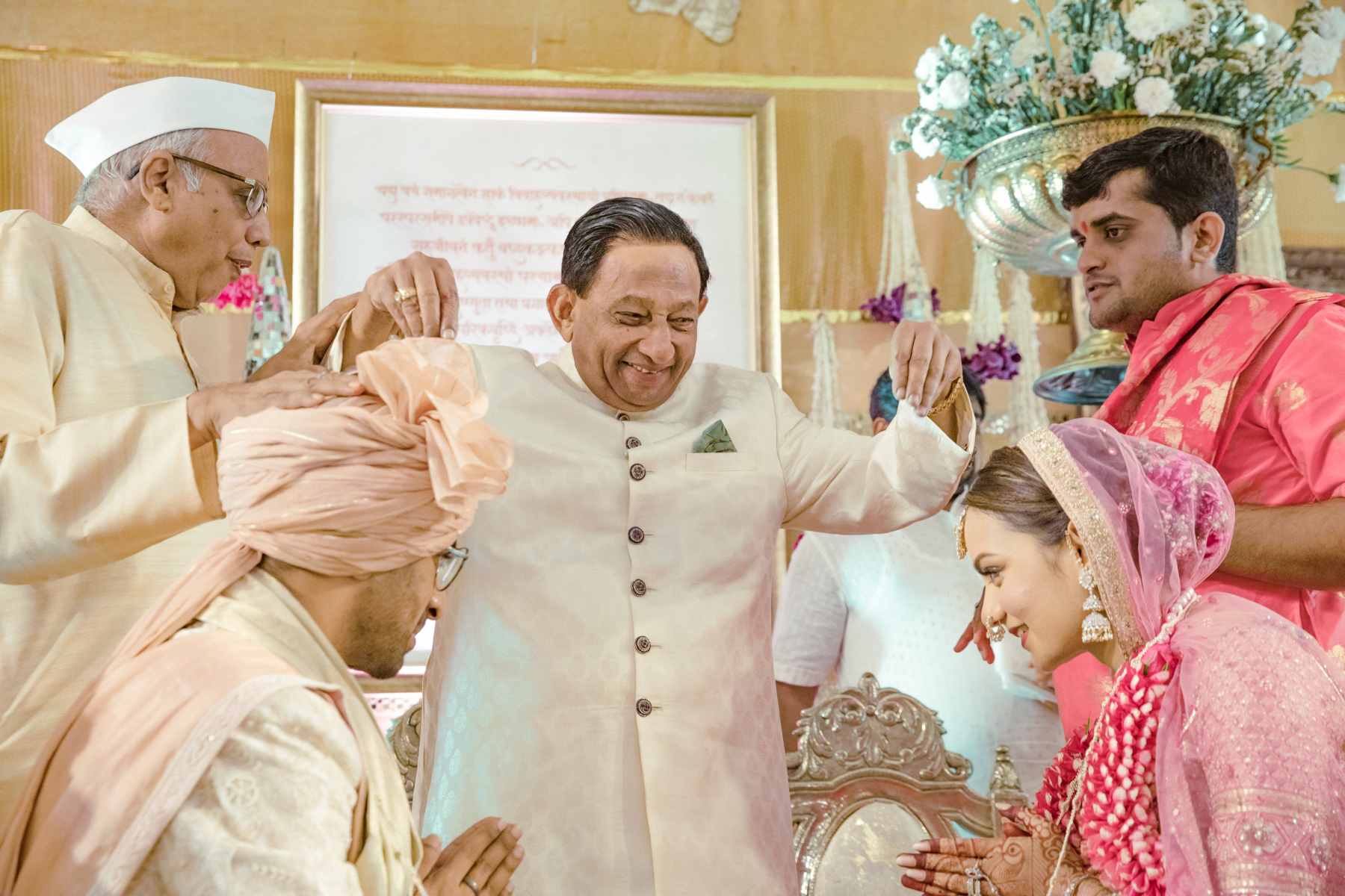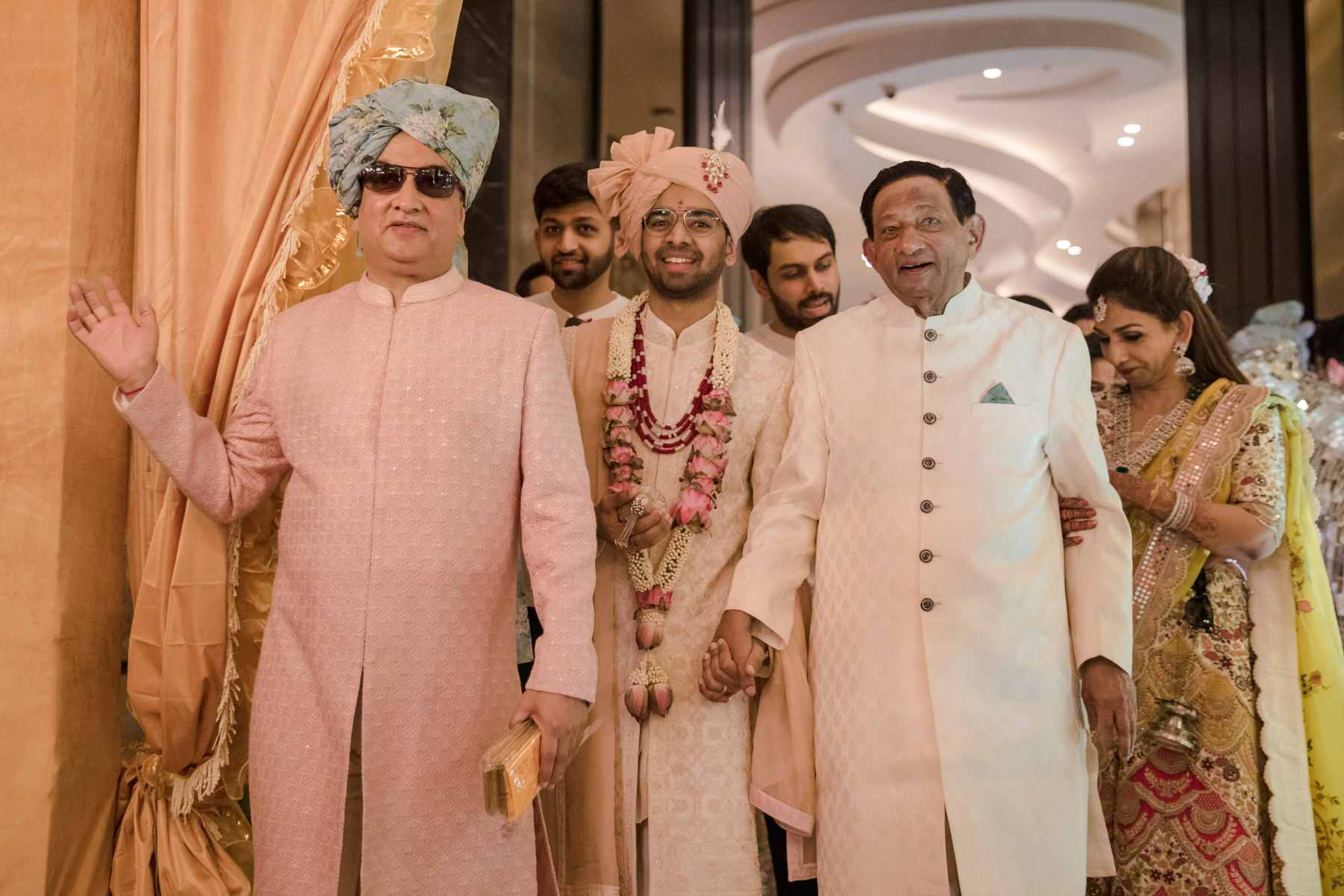 Pratham entered to small welcome ceremony by the mother-in-law. Followed by the beautiful bride walking into a custom Pre recorded track by Pratham which was a surprise for her. She was so moved by his gesture. The ceremony began with Ameya Dabli creating a blissful ambience and Shannel entered with her grandparents and was escorted to the mandap by her dad. With a gleam in her eye, we saw magic unfold with custom vows in a hand-calligraphed frame. The families showered them with rose petals and they both were husband & wife.