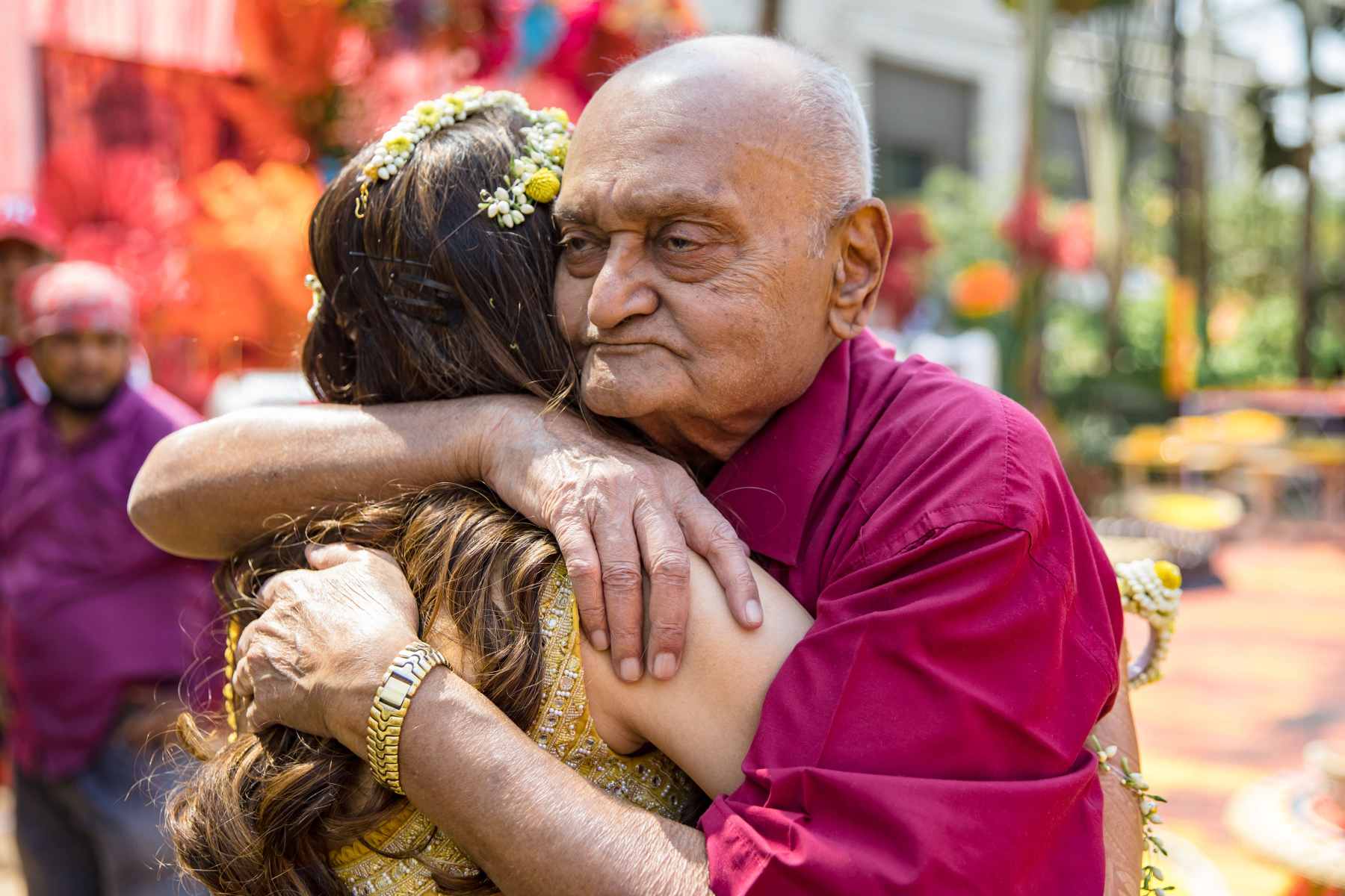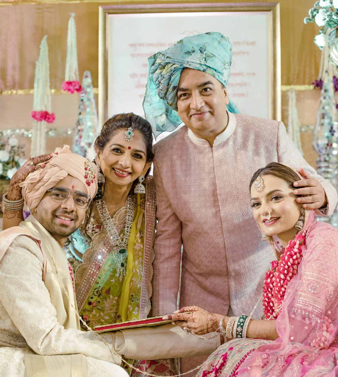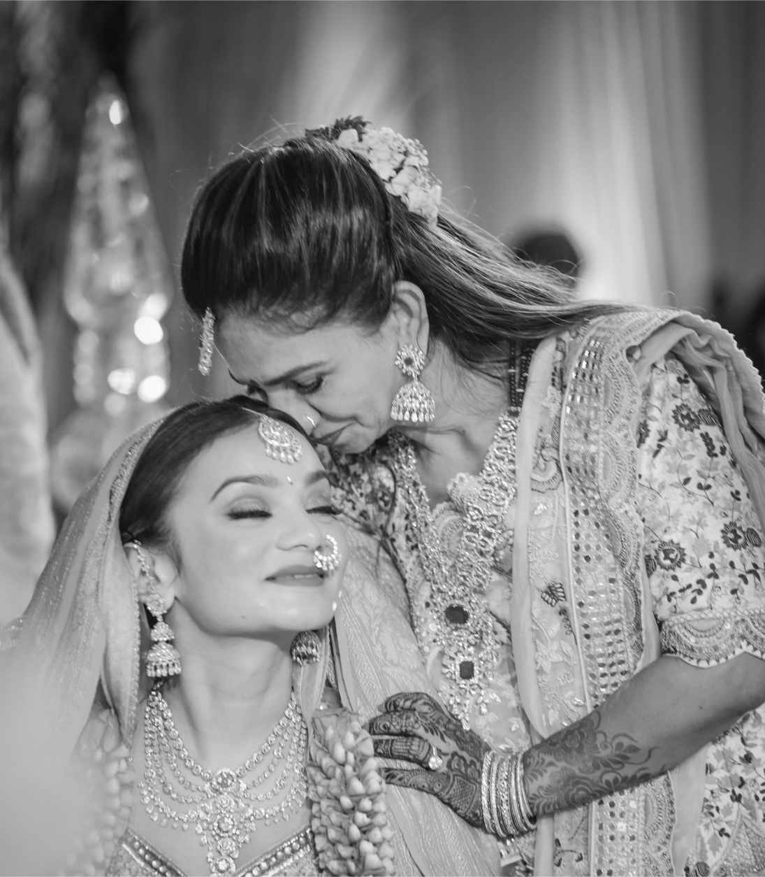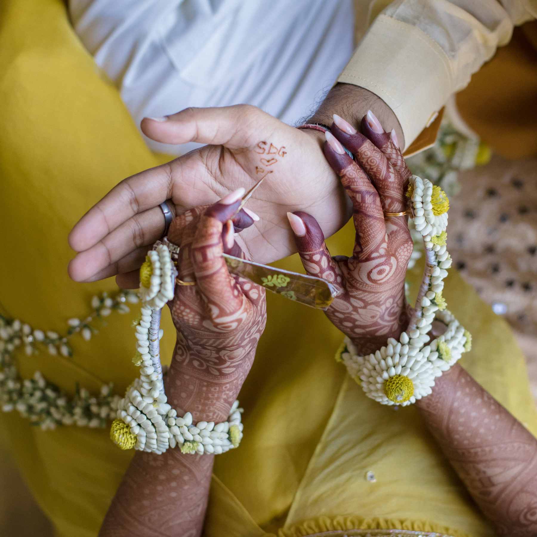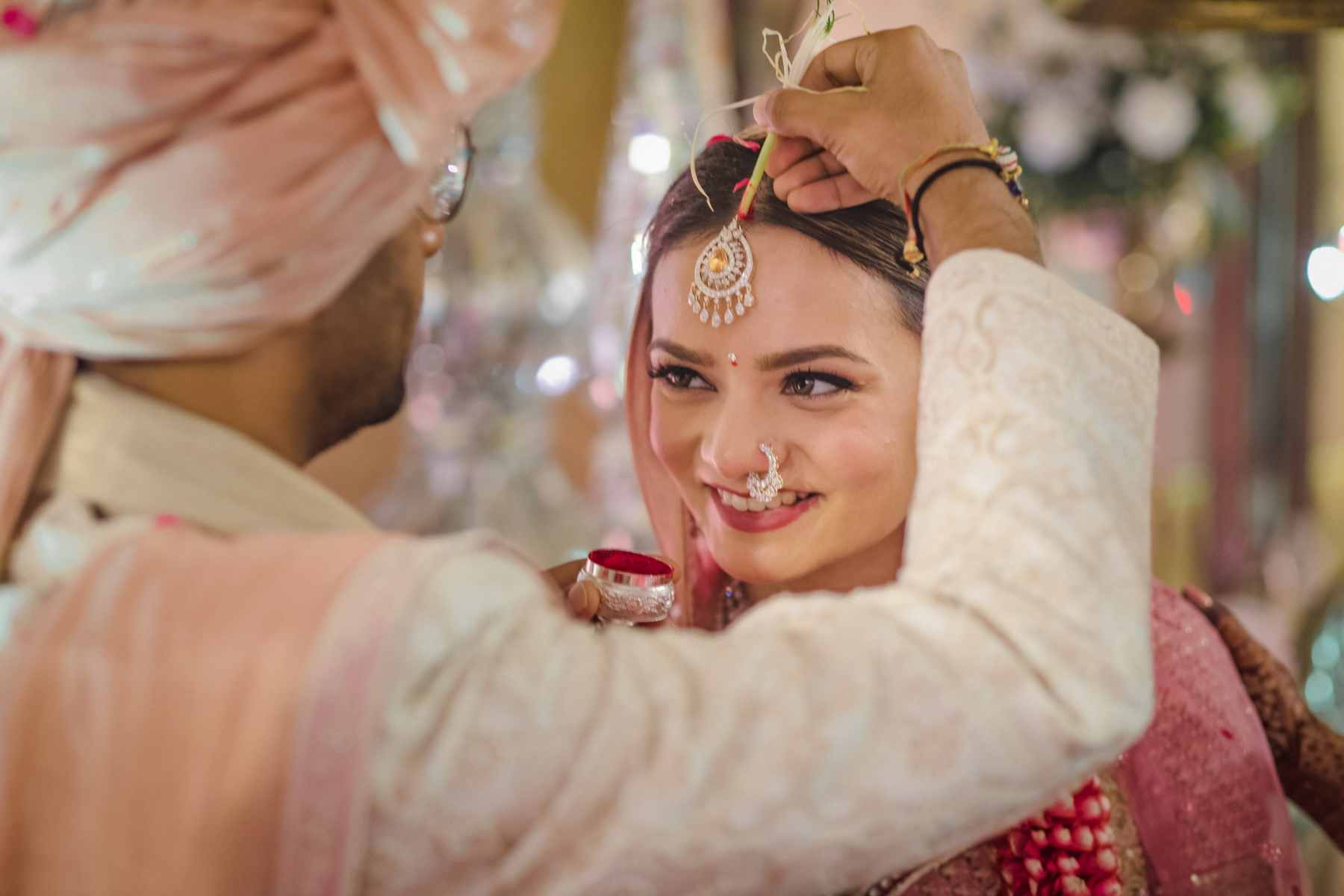 Pratham entered to small welcome ceremony by the mother-in-law. Followed by the beautiful bride walking into a custom Pre recorded track by Pratham which was a surprise for her. She was so moved by his gesture. The ceremony began with Ameya Dabli creating a blissful ambience and Shannel entered with her grandparents and was escorted to the mandap by her dad. With a gleam in her eye, we saw magic unfold with custom vows in a hand-calligraphed frame. The families showered them with rose petals and they both were husband & wife.