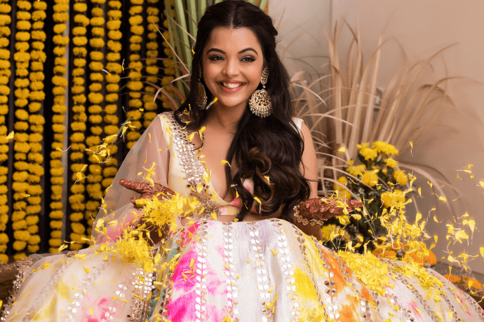 The Haldi was a home affair, the bride wanted the Haldi to be extremely private and in the house she had grown up. She was showered with tonnes of genda phool and a whole lot of Blessings by her chosen few.