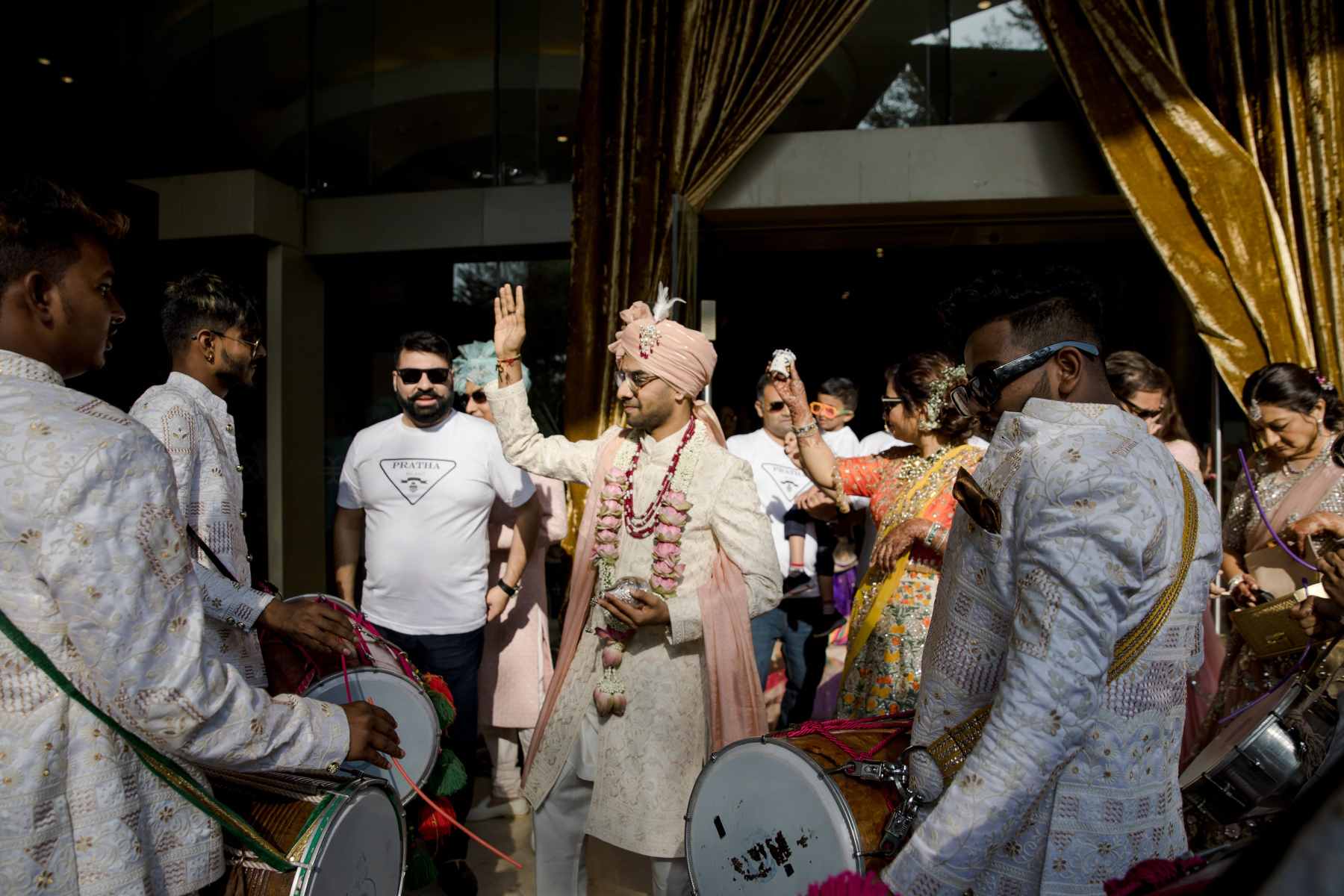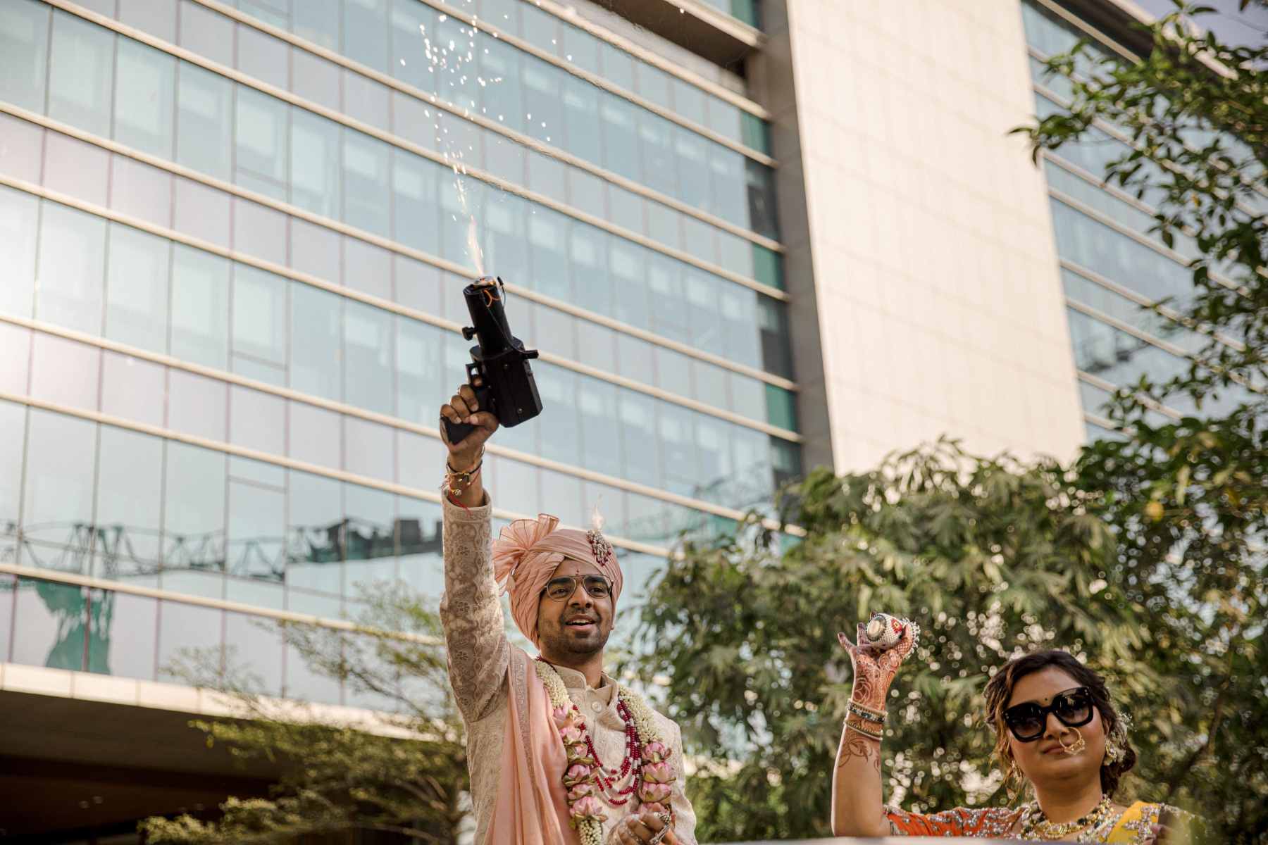 The Baraat came in style to take Shannel home, a long trailer that read "Let’s Take Shannel Home" with a DJ stationed on it grooving to the best Baraat tracks. It was a high-energy Baraat with all the friends wearing PRATHA T-Shirts and smoke guns blaring away. Everyone wore customized sunglasses. The groom with his sister came in a beautifully dressed Beamer. The Baraat was welcomed by the so-called 'Ladkiwale' in style with favors for the baraatis.