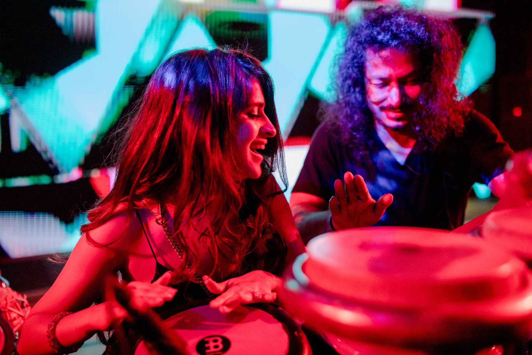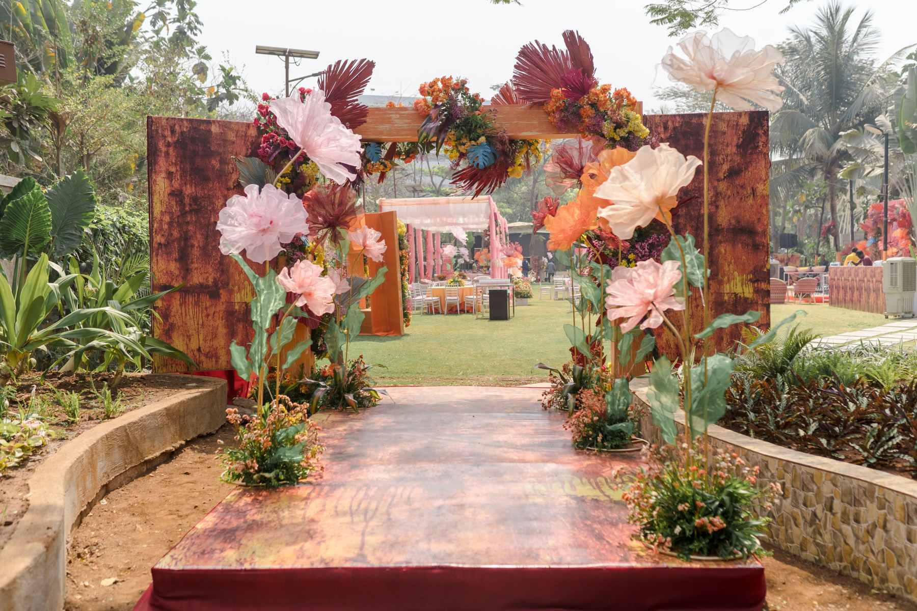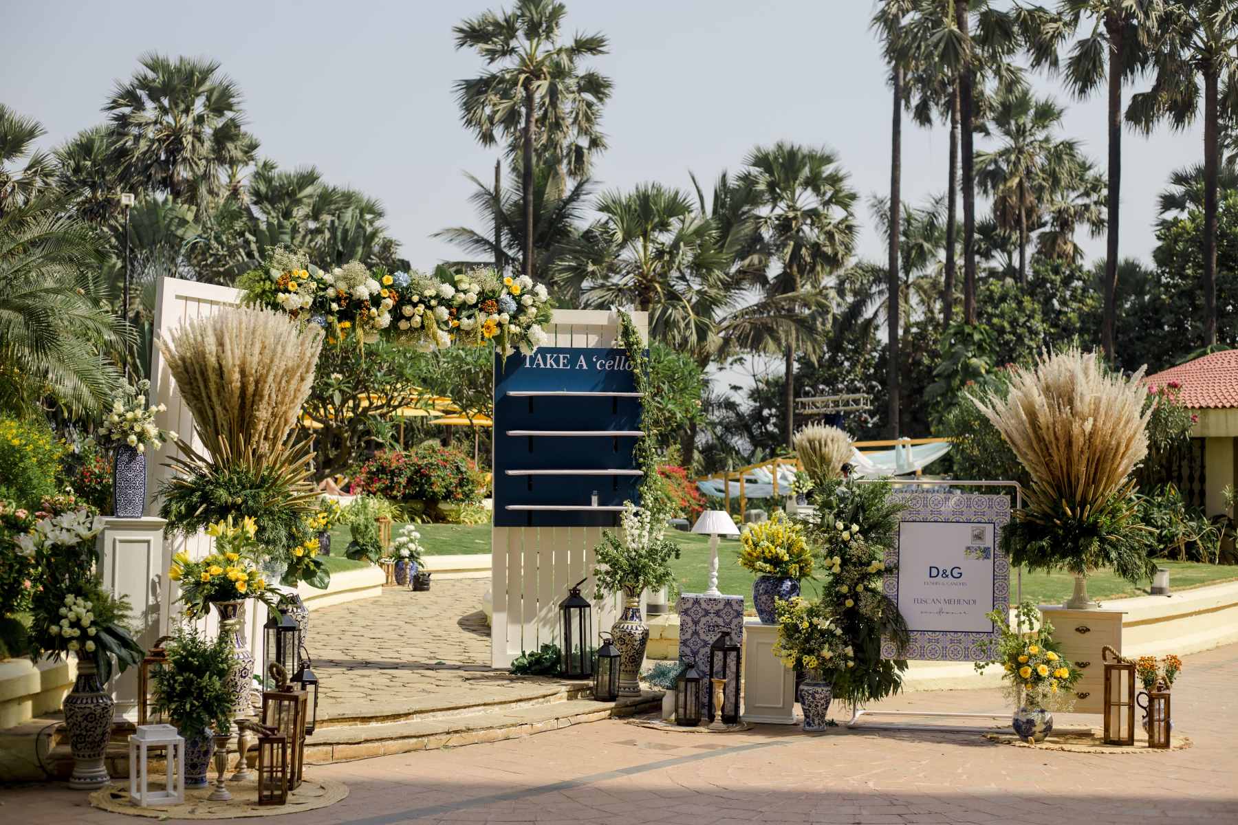 Set against the scenic backdrop of the lawns of Taj Lands End with the sun going down this Tuscan Affair was filled with small pretty details and loads of punk and drama. The friends welcomed the couple to the venue with tambourines and lit balloons and the performances took center stage. Curated cocktails & food got the night started with loads of activities for the guests ranging from an Evil Eye Bar, Toss the Coin to Coffee Residue Reader. A setting where all guests clicked pictures with the Vespa was endearing. We had dancers who performed the Tuscan Tarantella Dance and got the guests grooving, the band was phenomenal and the guests enjoyed it thoroughly. The favours were beautifully packed herbs in test tubes as takeaways. An evening that got the festivities kickstarted.