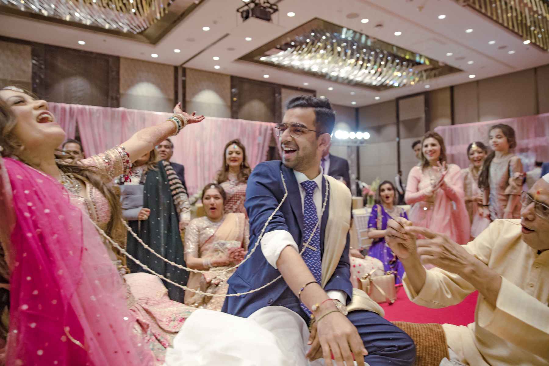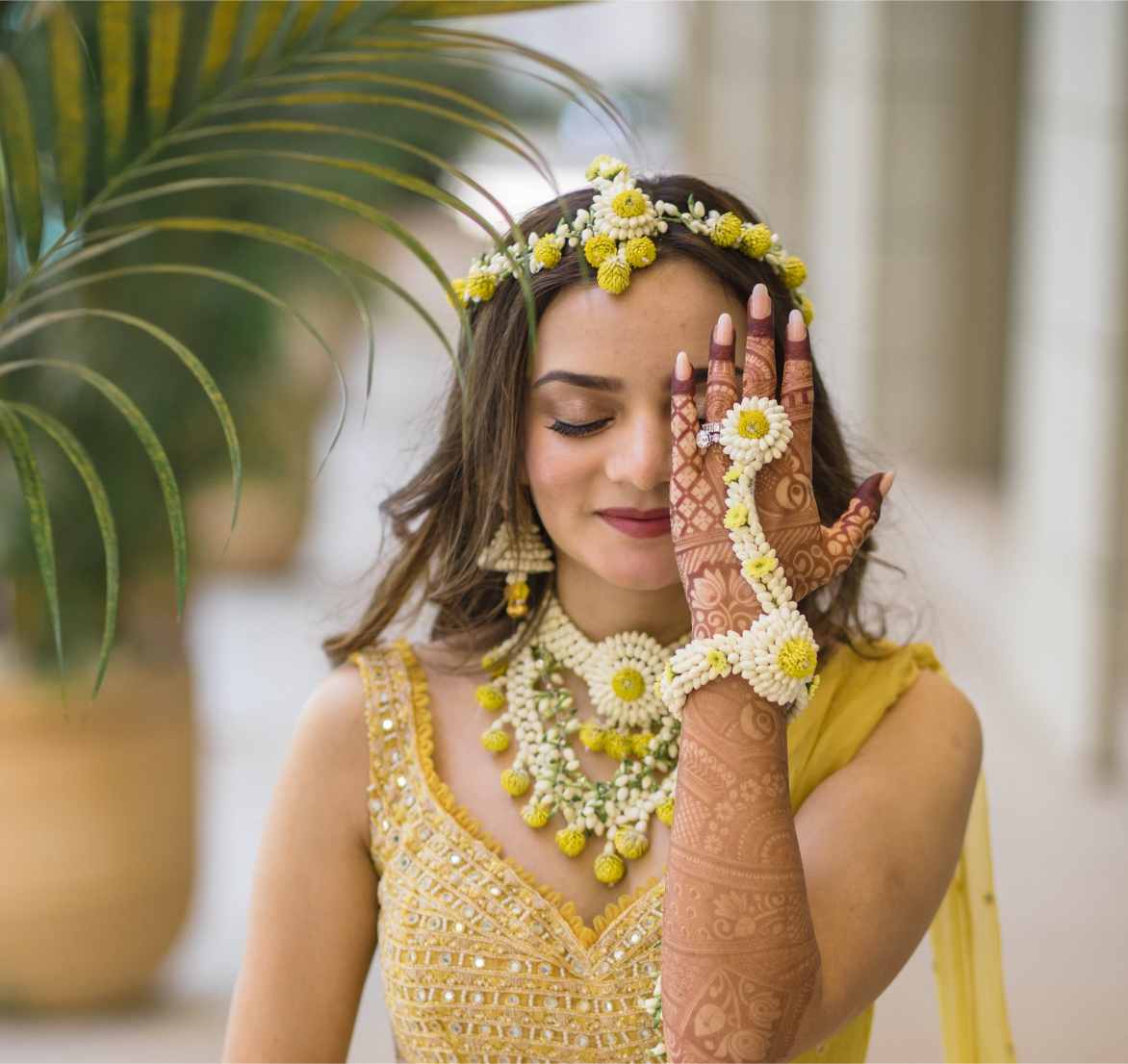 The Haldi was a vibe, vibrant and full of bright colors. The couple entered in a hand cart filled with flowers and the family held coloured bombs that filled the sky with hues of love. The Friends enacted a surprise for the couple and showered the couple with flowers and colors. DJ Perch got everyone to groove to her tunes and the guests enjoyed all the fun activities like Beer Pong, Dart Ball, Burst a Balloon, Mini Toasties, Jenga, Bachpan ki Yaadein, and many more. The guests twirled to a 360-degree camera and although it was sunny the guests had a fabulous start to the Two-day wedding festivities.