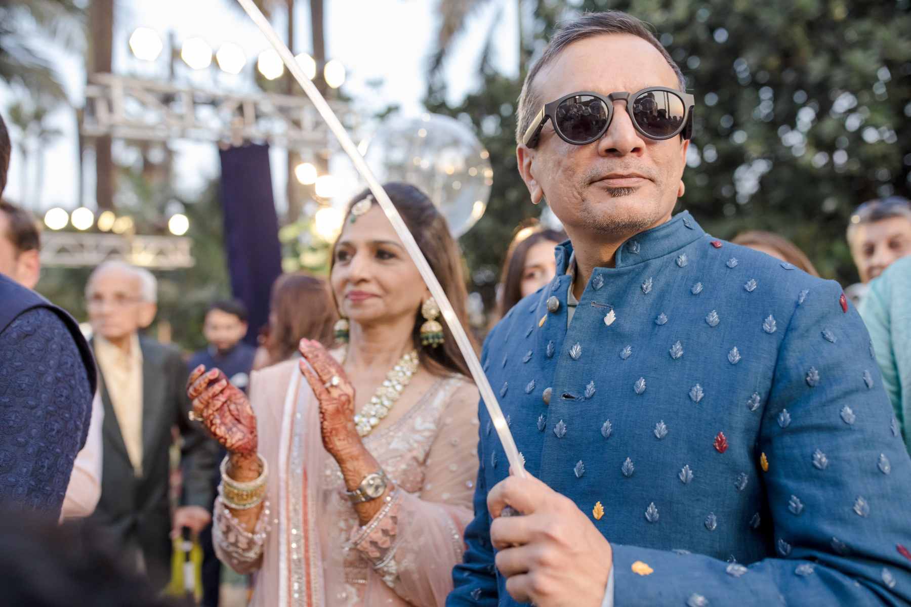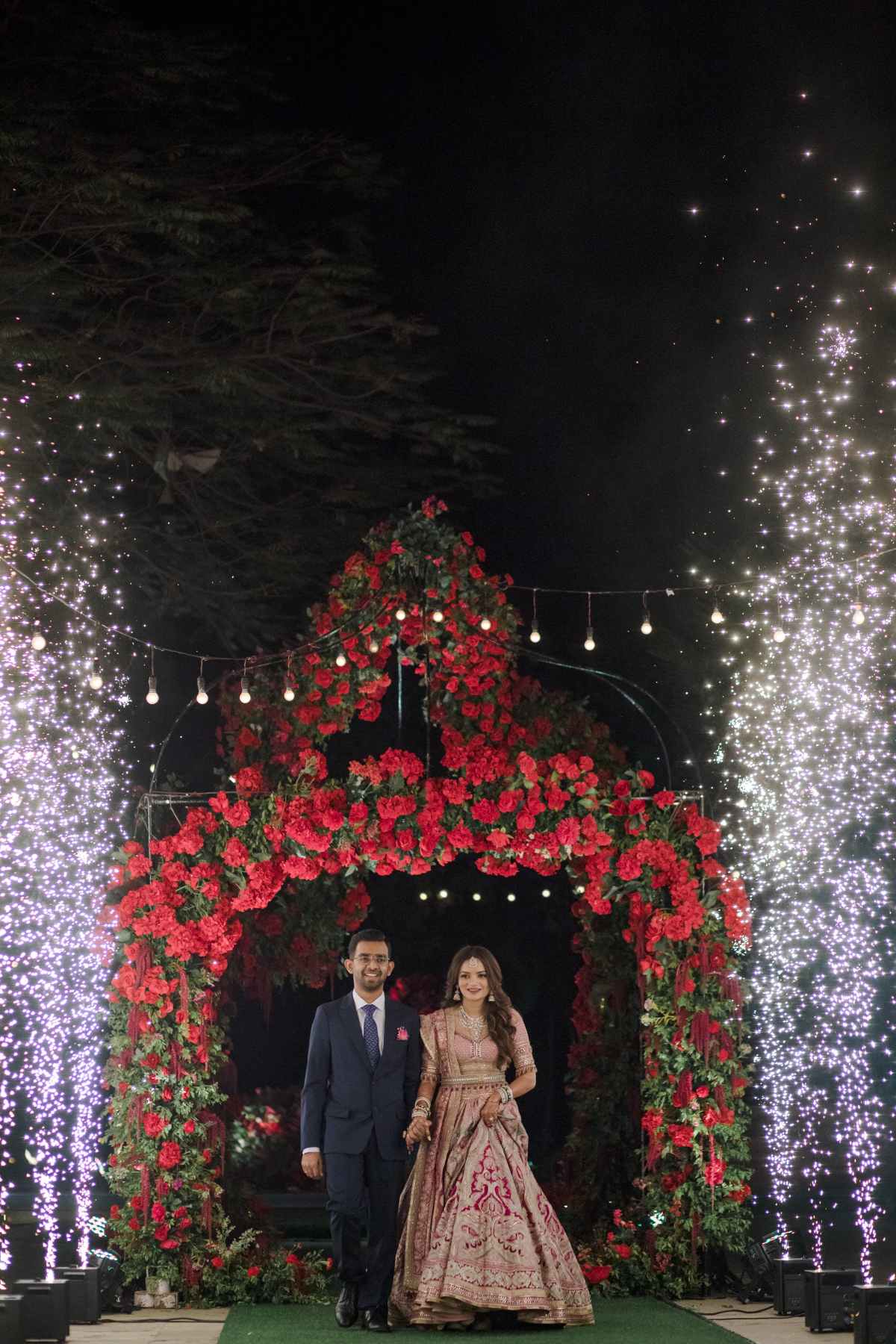 Post the wedding the couple entered the reception to a lawn full of people and sparklers going up to welcome them. It was a traditional reception with an instrumental band playing some blissful tunes while the couple mingled with guests who were there to congratulate them. Post this there were some post-wedding fun games followed by a family sit-down dinner and vidaai ceremony.