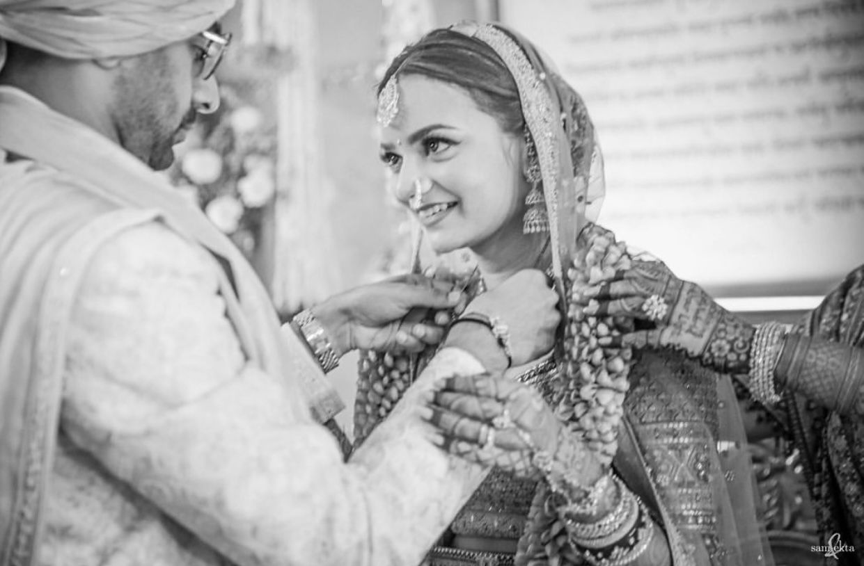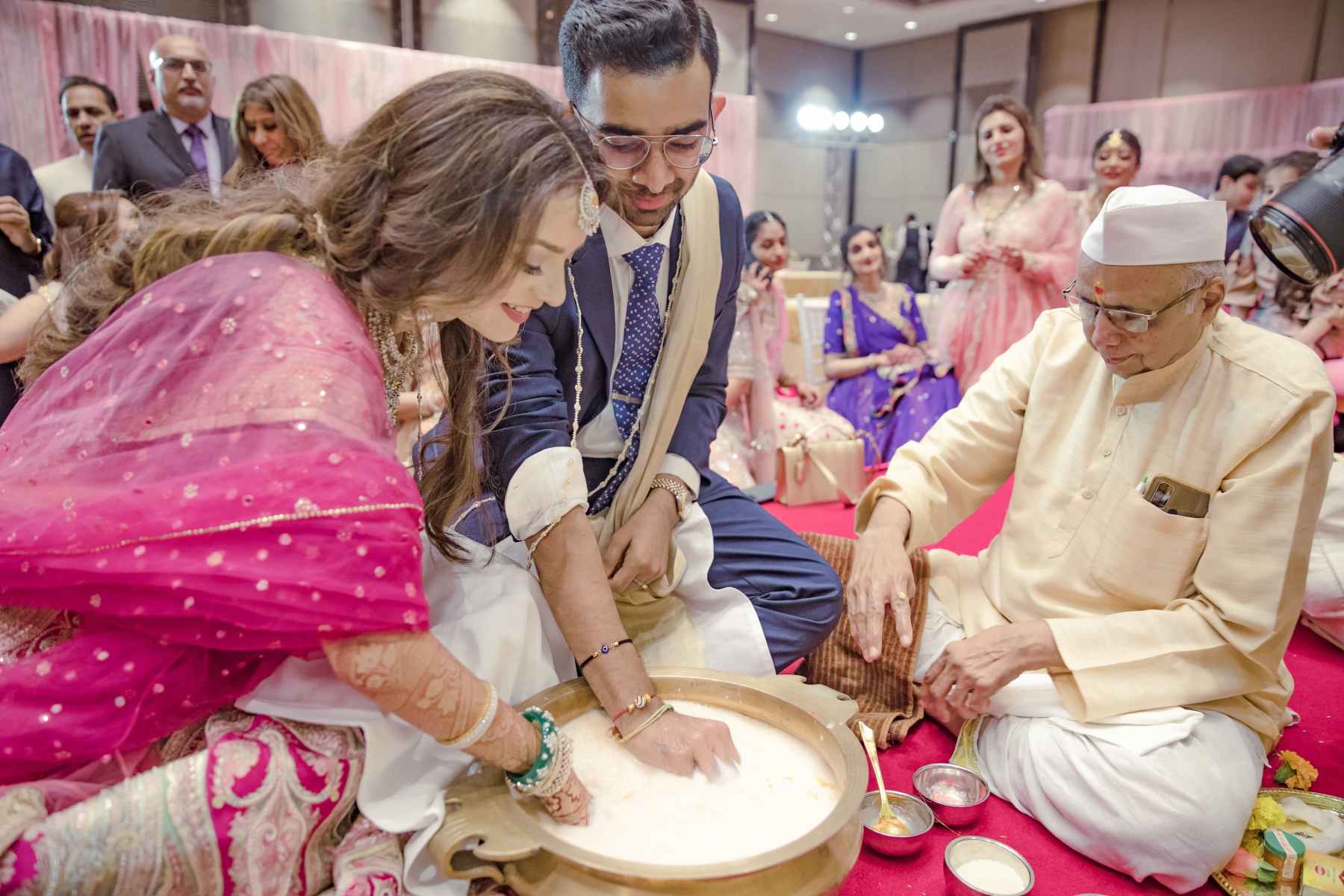 Pratham entered to small welcome ceremony by the mother-in-law. Followed by the beautiful bride walking into a custom Pre recorded track by Pratham which was a surprise for her. She was so moved by his gesture. The ceremony began with Ameya Dabli creating a blissful ambience and Shannel entered with her grandparents and was escorted to the mandap by her dad. With a gleam in her eye, we saw magic unfold with custom vows in a hand-calligraphed frame. The families showered them with rose petals and they both were husband & wife.