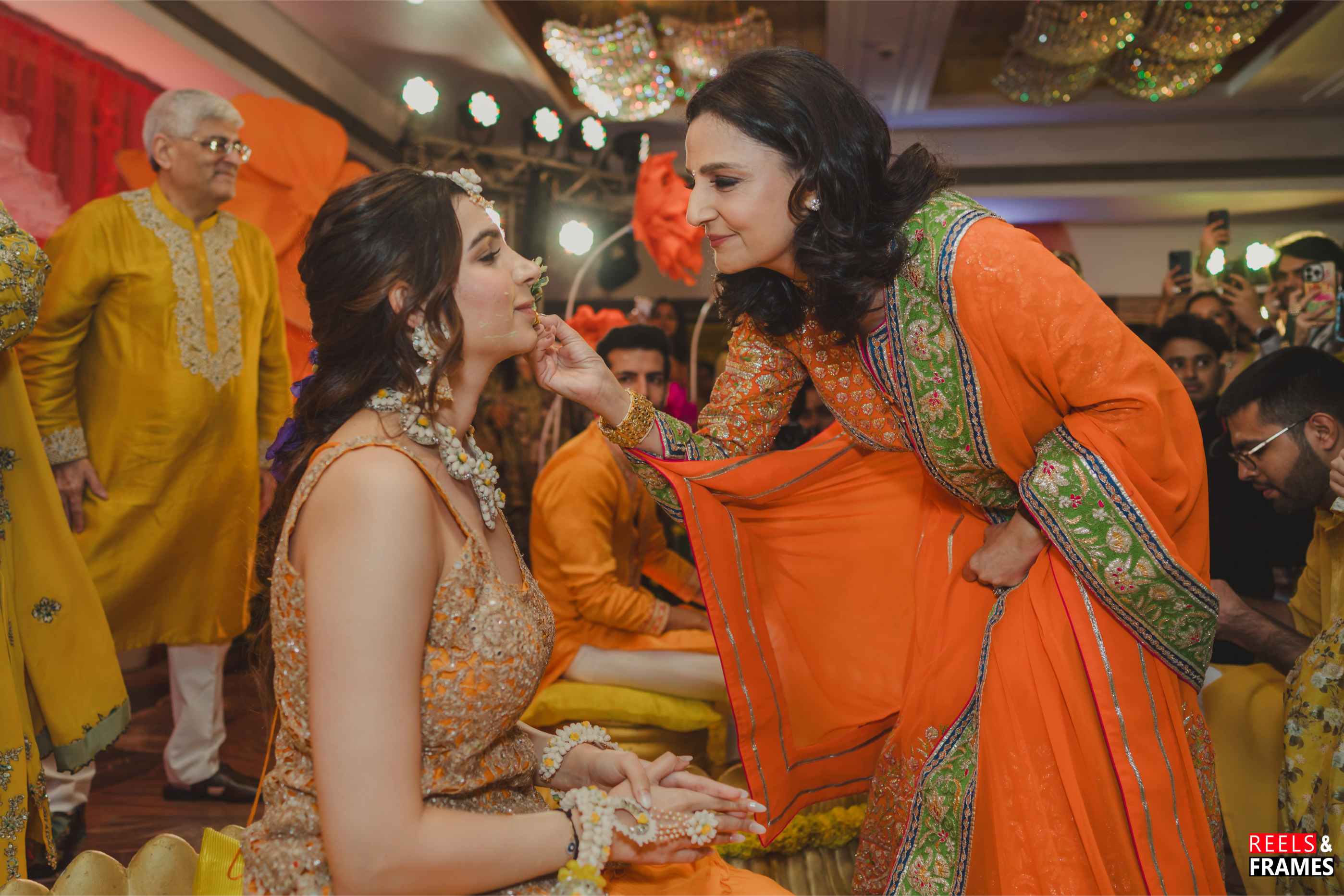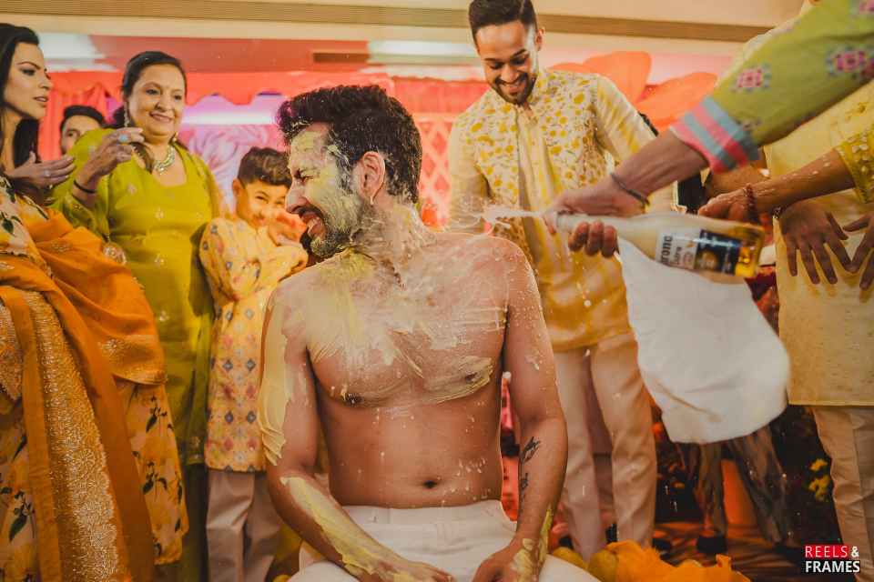 The Haldi was a total color blast, we just wanted to have fun with colors. Each color had something to denote. Vedika entered with her parents hand in hand and was seated at the Jhoola for her ceremony. Rishi surprised Vedika as he entered with his entire family and friends with handkerchiefs in their hand grooving to Mehendi Laga ke Rakhna going into Say Shava Shava. It was a Sight to behold, then started the Jhoola ceremony where Vedika was adorned with floral jewels. This was followed by the Haldi rituals which kicked off with the family applying Haldi and then the friends taking over to apply everything that came their way. The flower shower was the highlight. The couple then re-entered the after party which turned out to be a bigger and better affair than the cocktail. Everyone grooved and moved to DJ Krish known as TBom & Rituraj on the drums. The bar was flowing with coloured cocktails the guests enjoyed the other activities like Illusion, Block Printing, Lac Bangles, etc.