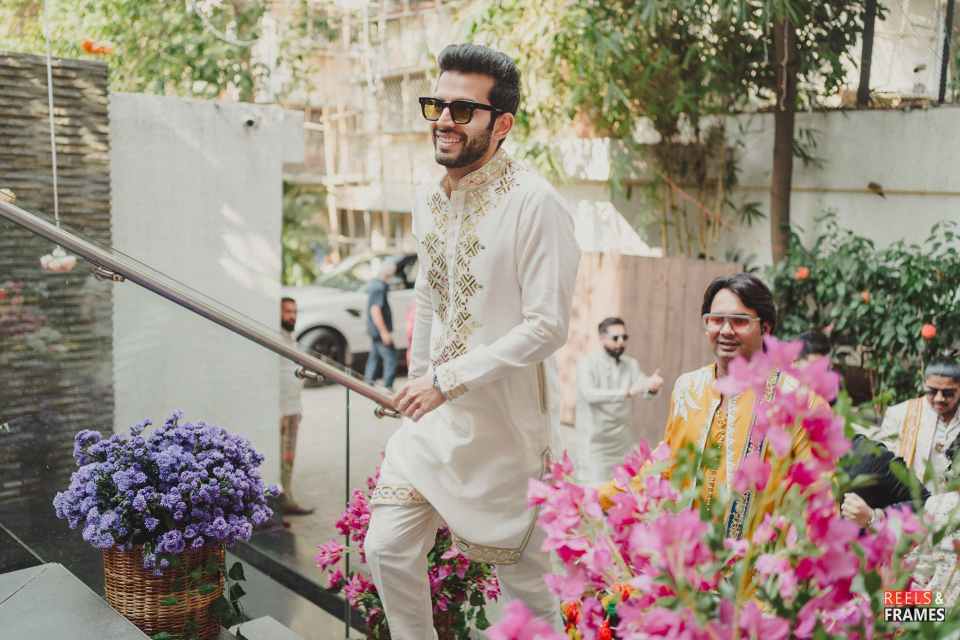 The Baraat went on for a long time, and the groom walking down the Royal stairways of the Taj with his groomsmen was a sight. The Gateway Room was filled with cheer as the groom and his friends took center stage. Grooving to the DJ’s beats with premix shots and coloured dupattas they all looked in their element. All adorned sunglasses that read RV.