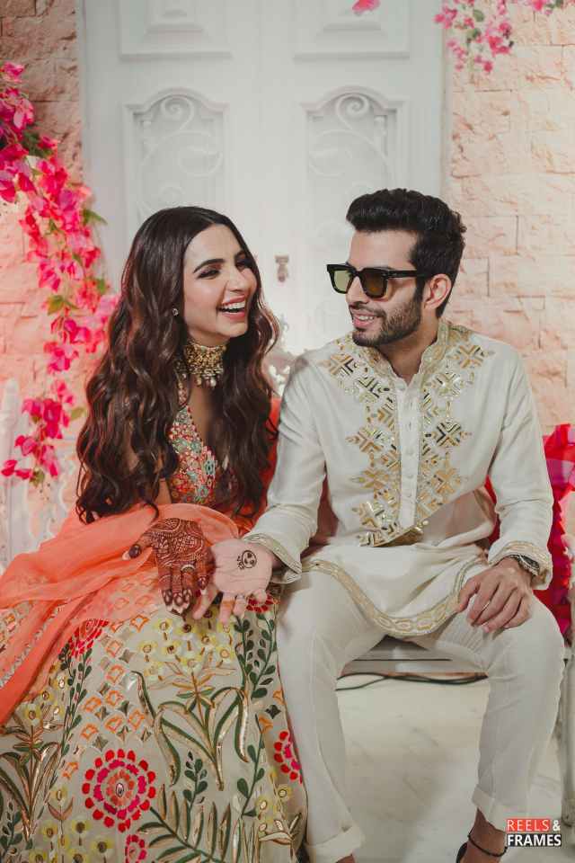 The Mehendi drew inspiration from Vedika & Rishi’s dreamy proposal in Monte Carlo. We decided to blend the Mediterranean & Classic with a touch of Bougainvilleas and coloured flower palette. The brunch started with cocktails flowing from mimosas to champagne to Aperol. The bride looked resplendent in an Abu Jani outfit and was a sight to behold with all her bridesmaids. The live band took center stage while the ladies grooved to the music. There was Dhol and a lot of Tamasha. The space was demarcated with different cities on the shore of the French Riviera and areas were divided from mehendi lounges to Lunch setup to a small cute cafe. The groom entered to Dhol beats with his groomsmen and it was a vibe. The bride then performed the French tradition of cutting the ribbon while the bridesmaids held the other side of it. The mehendi was an affair for everyone to remember.