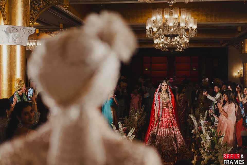 The wedding was a muted and elegant affair with dreamy florals at the Grand Ballroom. Rishi entered the venue with his Mother-In-Law performing rituals and vocals by Ameya Dabli & Team. Then came in the bride adorned in a Red Lehenga looking like a million bucks. The bridesmaids stood at the alley to welcome her to Laal Ishq, she was then escorted by her brothers to the aisle where her pre-recorded vows played. Rishi had tears in his eyes while she walked up to him and they exchanged vows and garlands amidst flowers being showered. The wedding rituals started and Sai ( Guru ) held centerstage. After the vows came in the other ceremonies were to be performed. A wedding where two hearts become one until infinity.